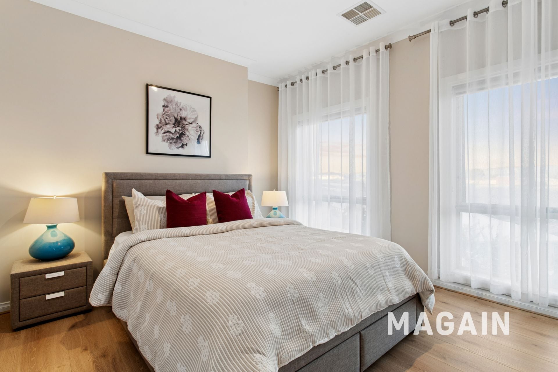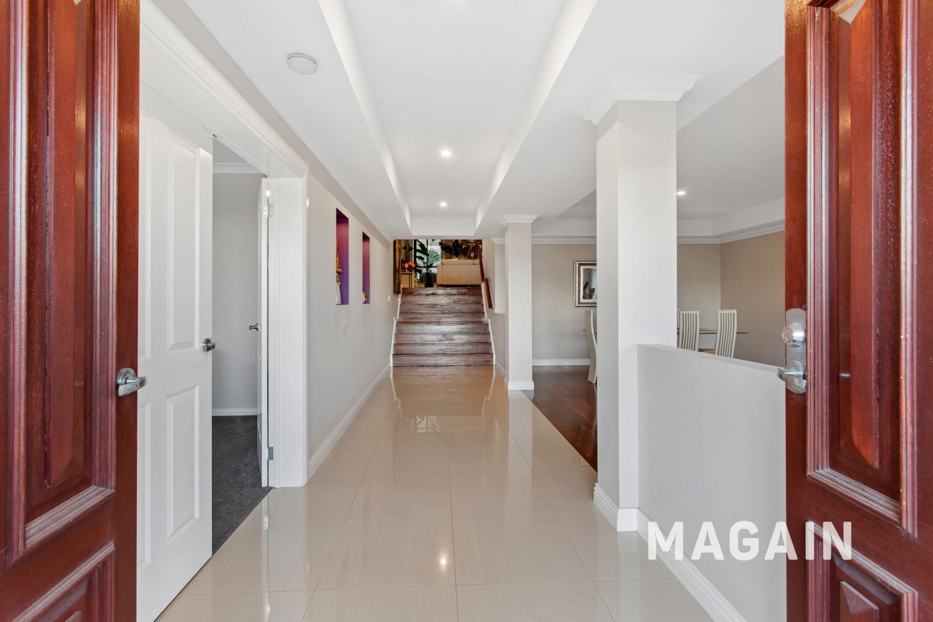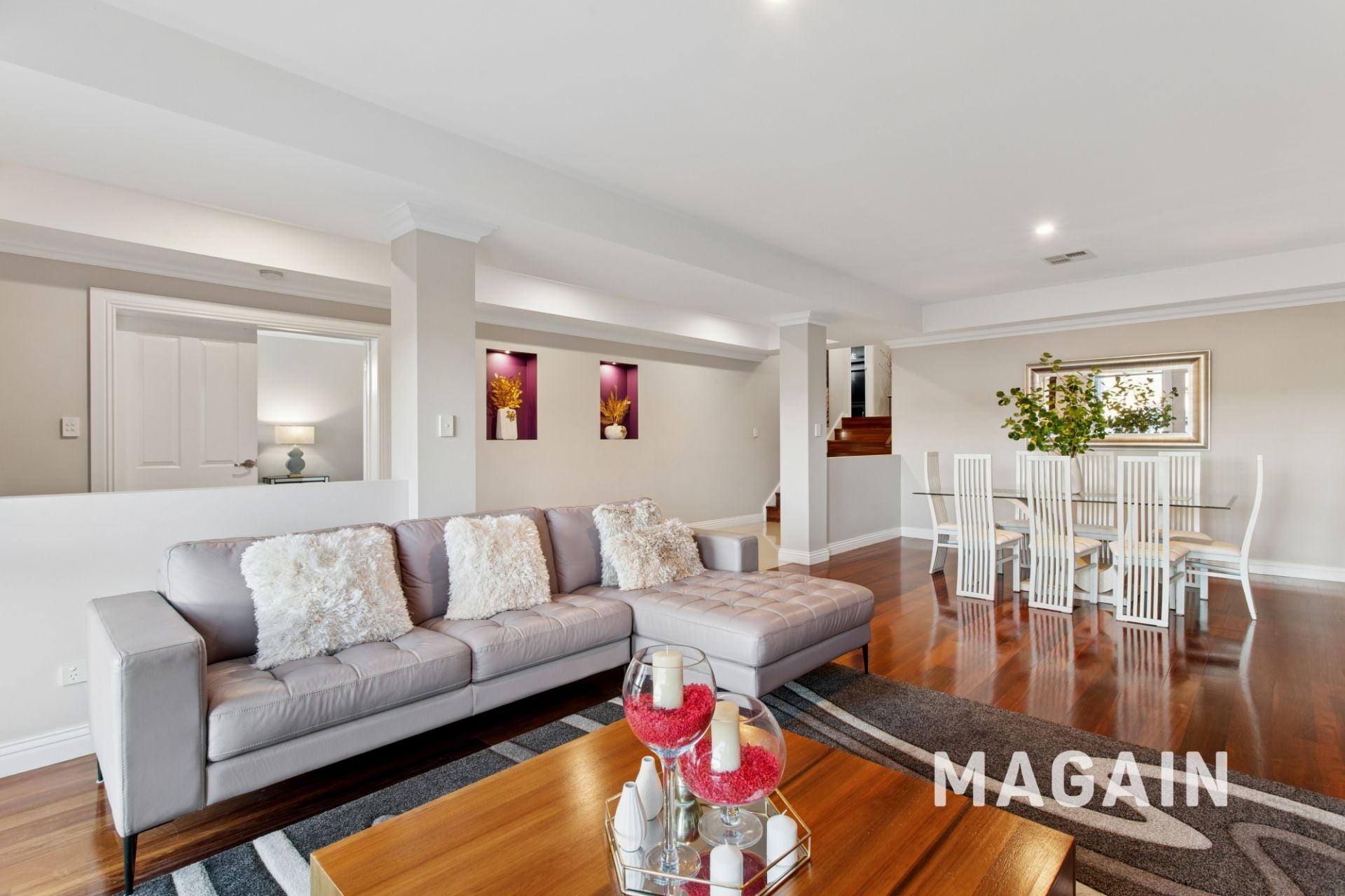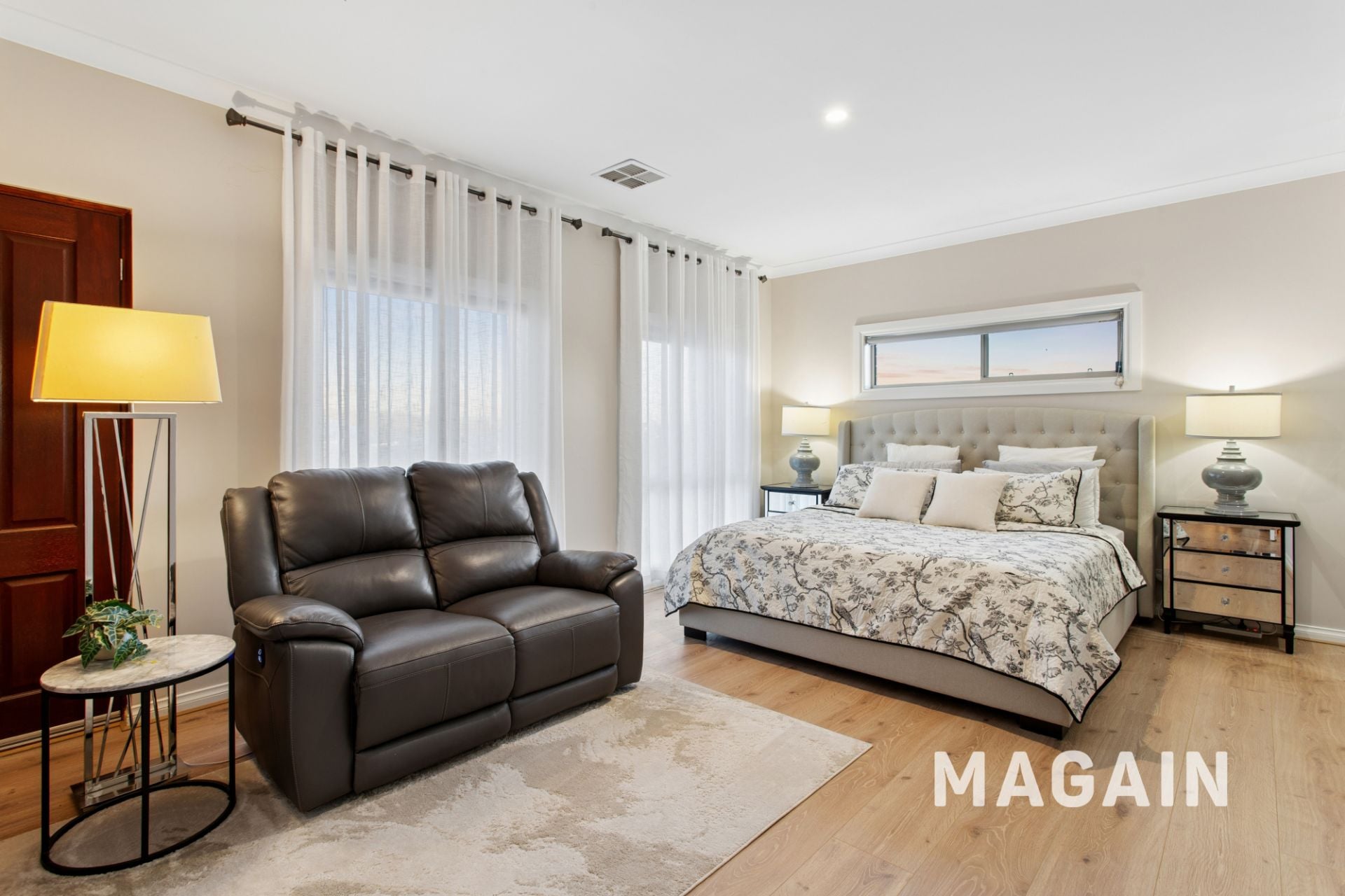 Upon entry, a grand split-level foyer opens to a cosy formal lounge and dining area adorned with LED lighting and exquisite Jarrah timber floors. Adjacent, through double doors, lies a sumptuous master suite or guest bedroom, complete with his and hers walk-in robes leading to a private ensuite featuring a double vanity, shower, and toilet.