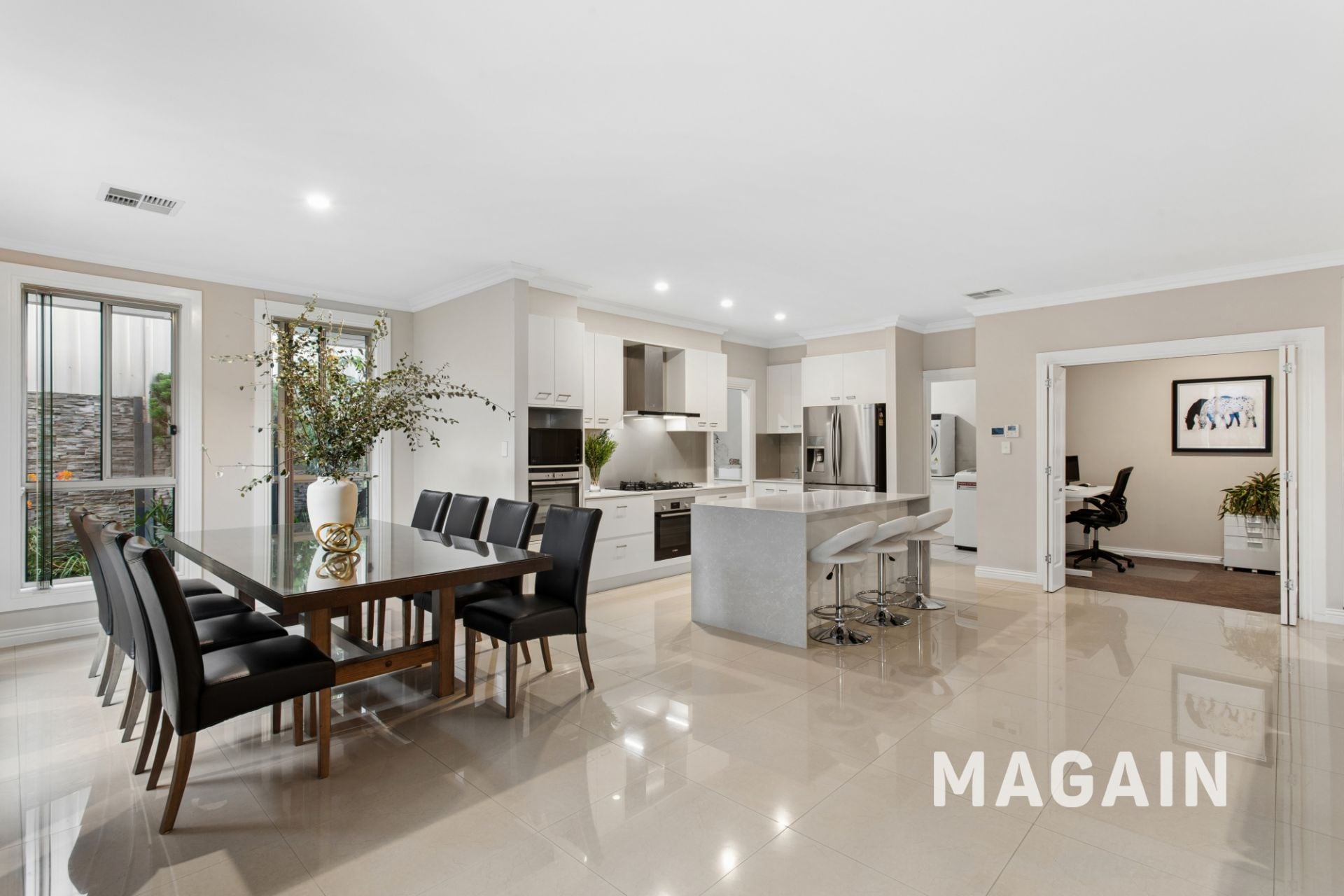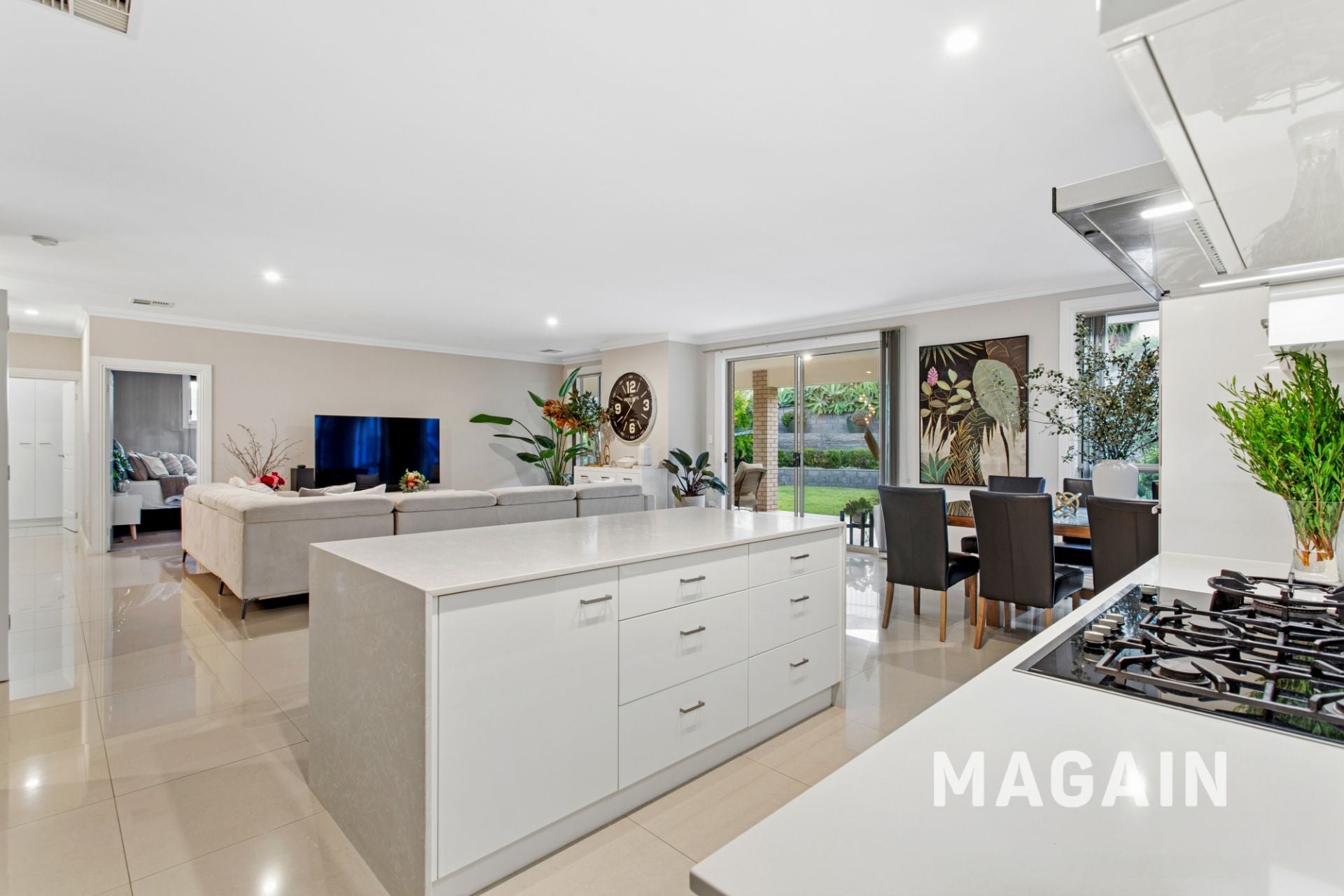 Ascend a few gracefully crafted stairs to discover the heart of the home, the stunning kitchen, centrally positioned to overlook the open-plan living areas that extend seamlessly through large sliding doors to an expansive alfresco entertaining space. The kitchen is a culinary masterpiece, equipped with a butler's pantry and adorned with sleek white cabinetry, modern stainless steel appliances including dual ovens, a gas cooktop, dishwasher, and an inviting breakfast bar.