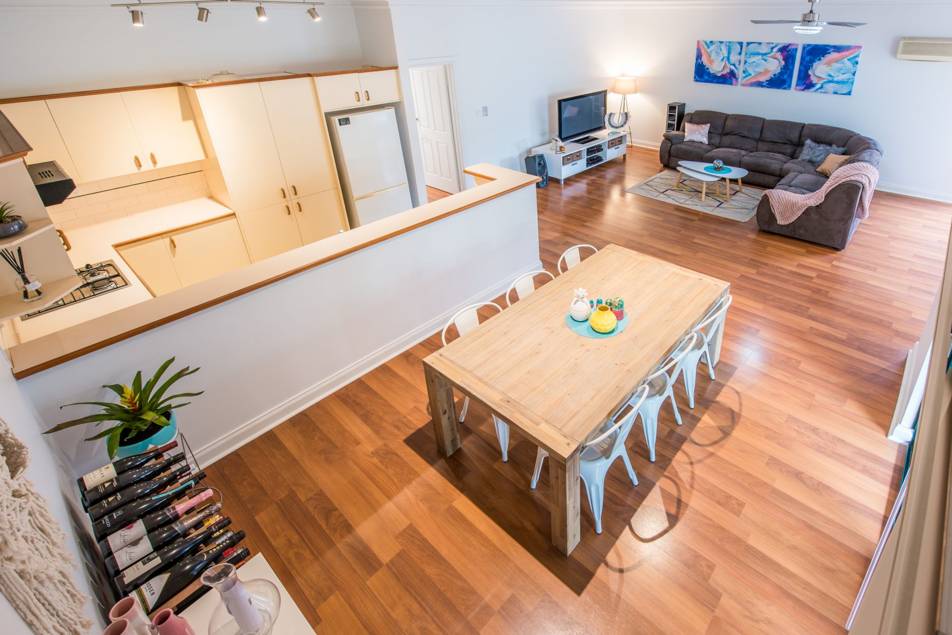 > adjacent is the huge living and dining area, which is complete with a little study nook, a perfect place to set up the desk