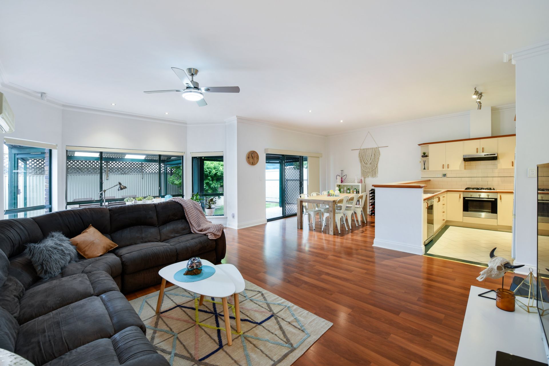 Outside is the huge undercover entertaining area, complete with outdoor fan and cafe blinds. Sit around with family and friends over a glass of wine and cheese platter on those balmy summer nights. The yard is conveniently low maintenance with enough room for a small veggie patch or flower bed for the green thumb of the home.