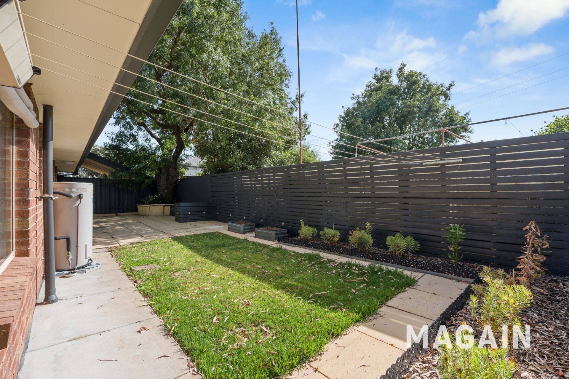 > Low maintenance rear yard with watering system and garden shed