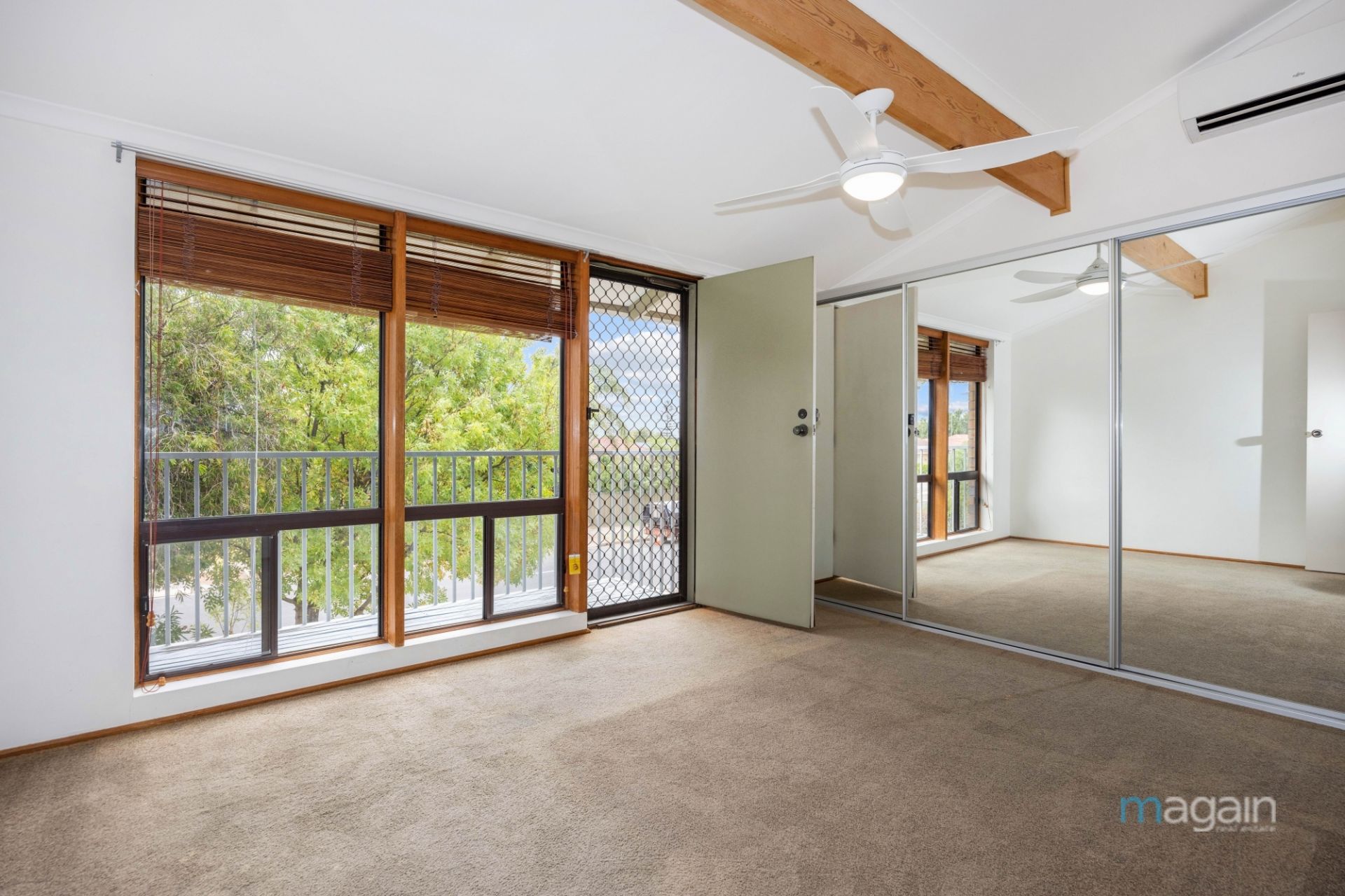 > main bedroom has a ceiling fan and balcony access.