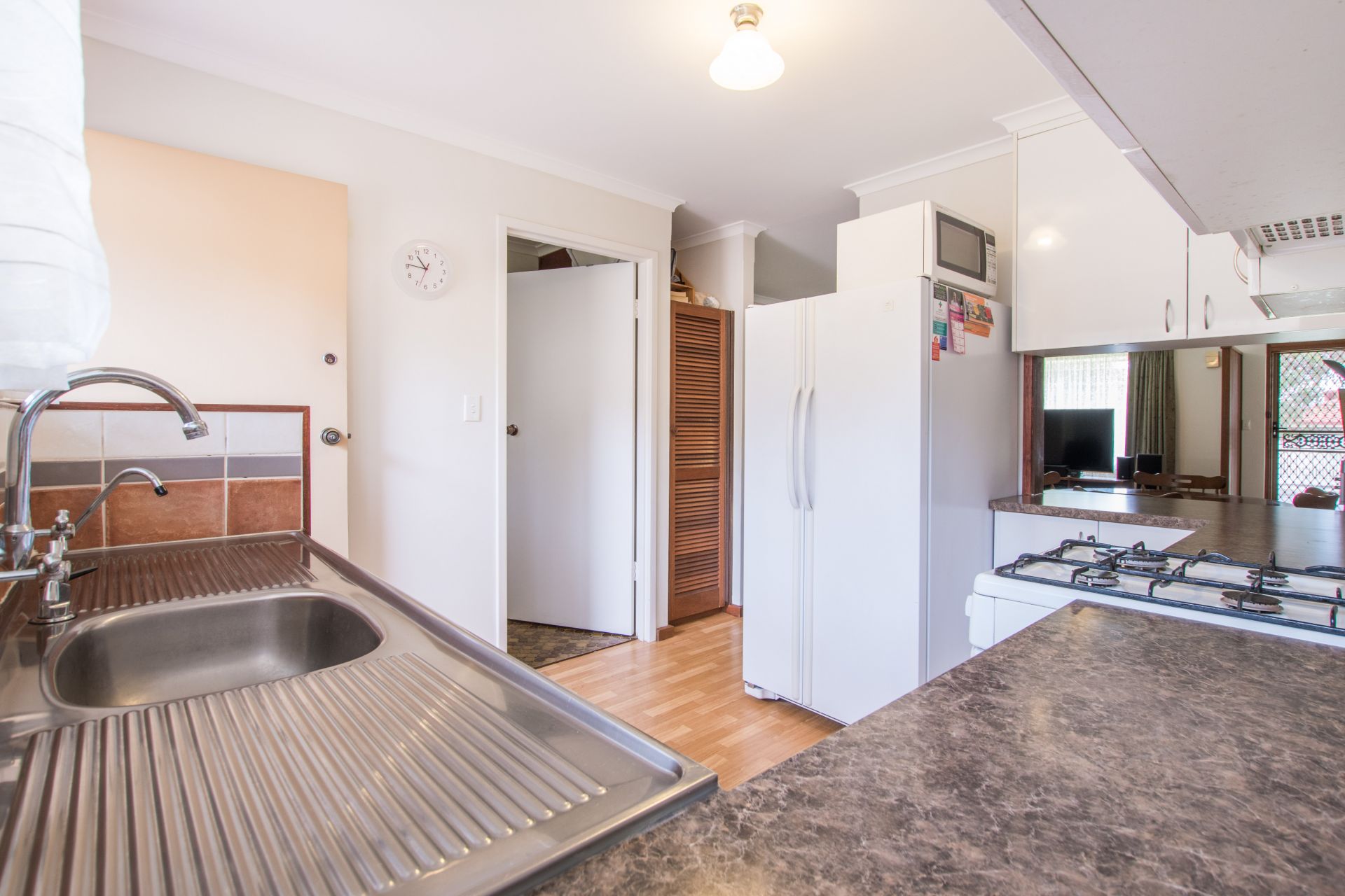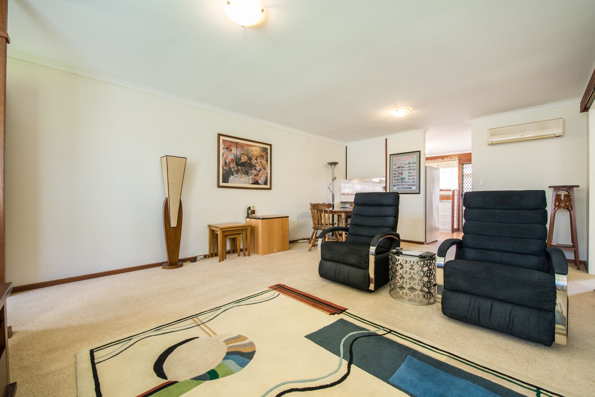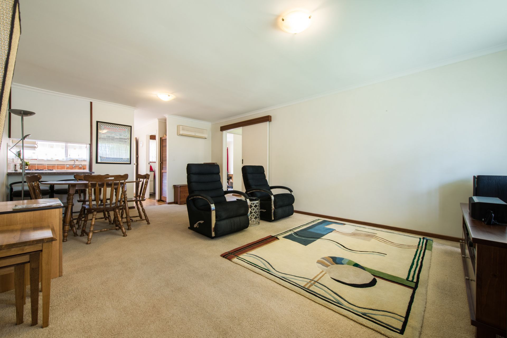 Stepping inside we walk into an open plan living area. The kitchen is slightly private from the main living room providing a quite space to relax after a long day away from the hustle and bustle of the kitchen. The kitchen offers plenty of bench and cupboard space. With the bench extending into the dining room there is room for bar stools to create a neat little breakfast bar. A split system air conditioner provides year-round comfort. There are 2 decent sized bedrooms, both with floor to ceiling mirrored built in robes and main with ceiling fan. The main bathroom is a great size with a generous vanity for storing all your products. Storage is abundant in this home with the laundry also offering a linen cupboard.