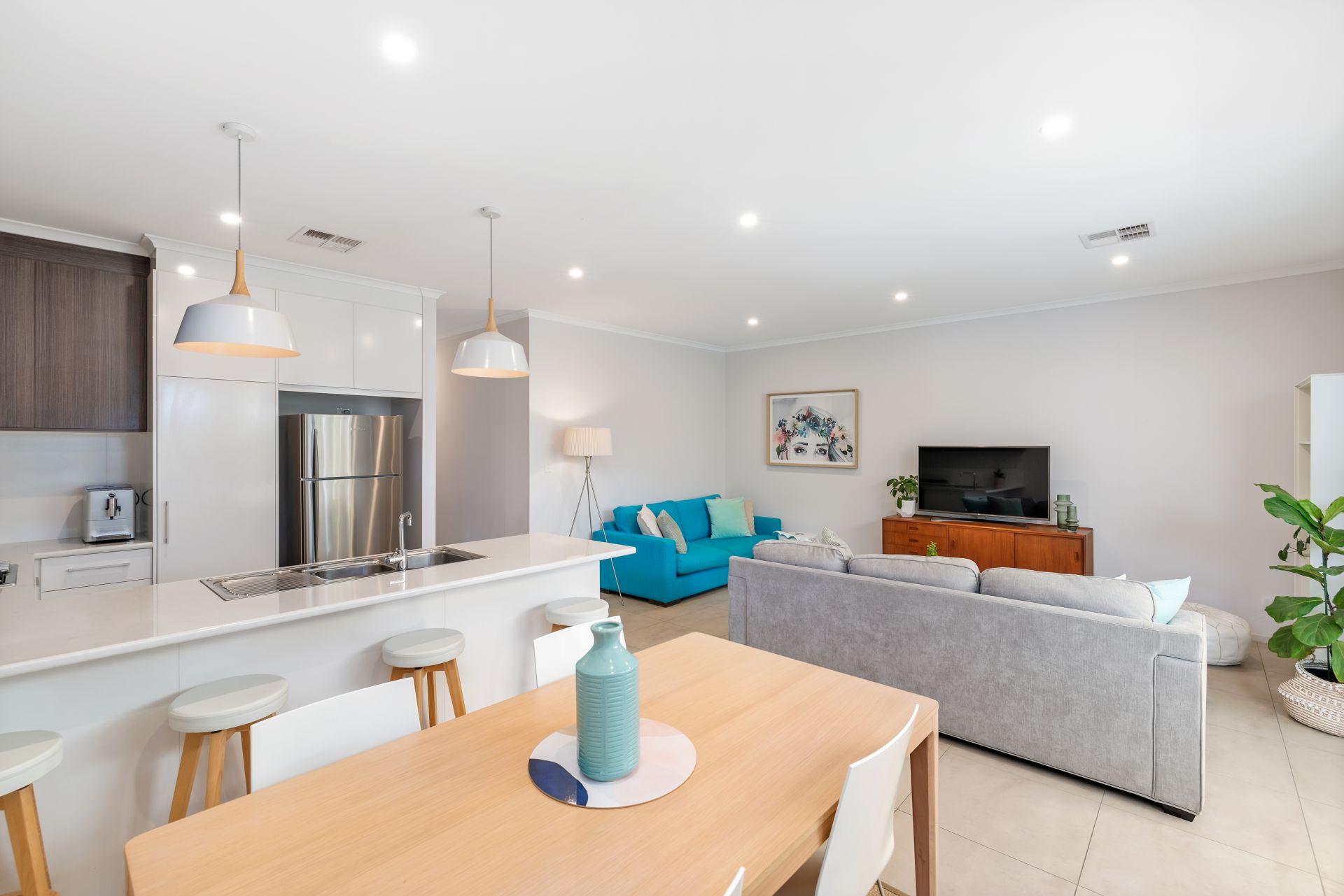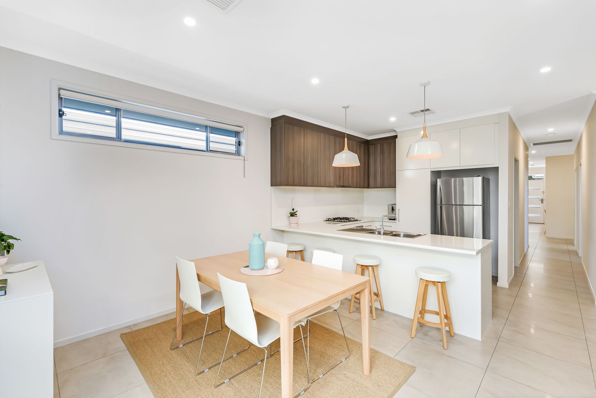 At the heart of the home is the open plan living area. The kitchen has an abundance of bench and cupboard space and includes all the essential appliances such as gas cooktop and dishwasher. The kitchen overlooks the large dining and living area, the perfect place for the family to unwind. For year round comfort, ducted reverse cycle air conditioning has been installed throughout the home.