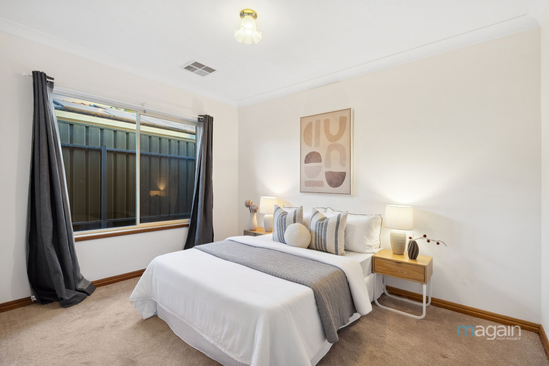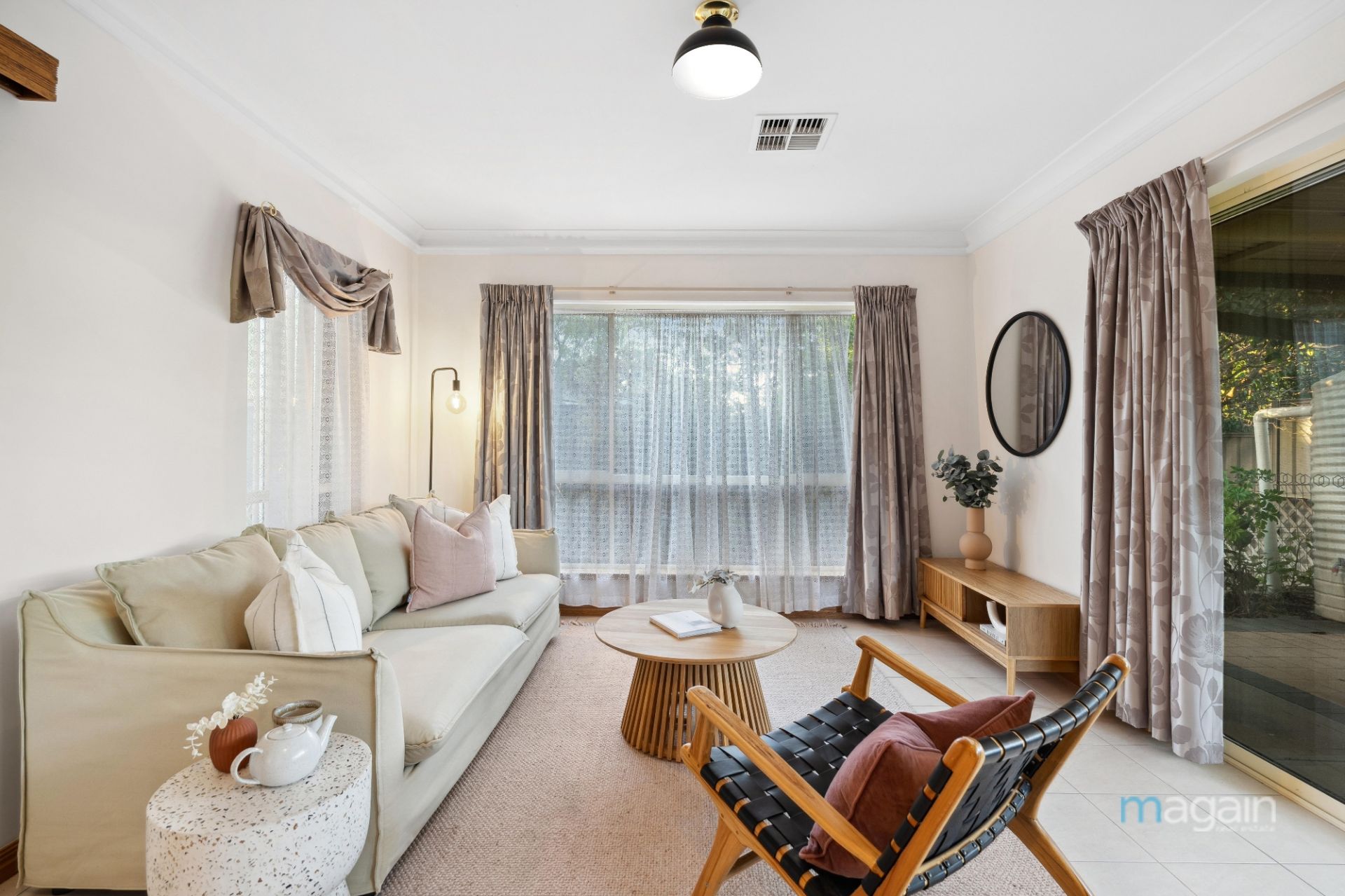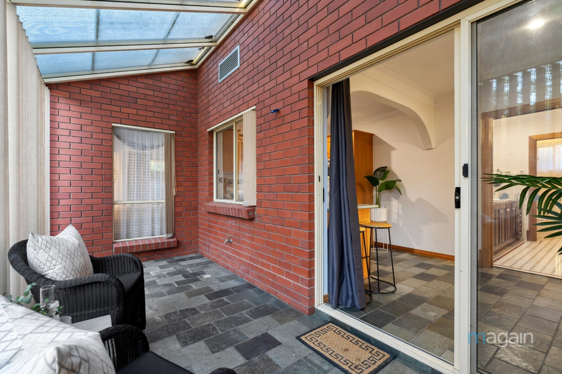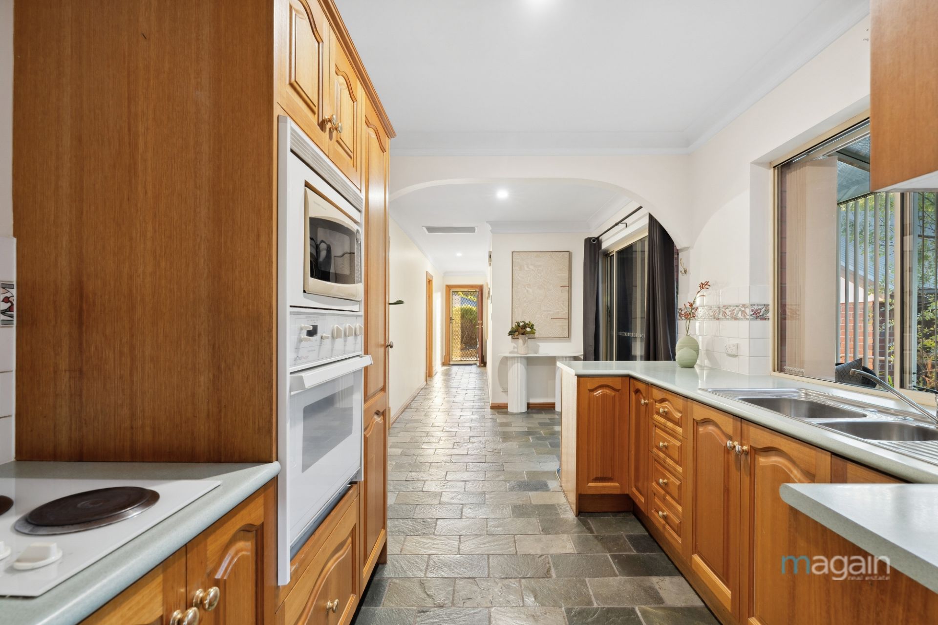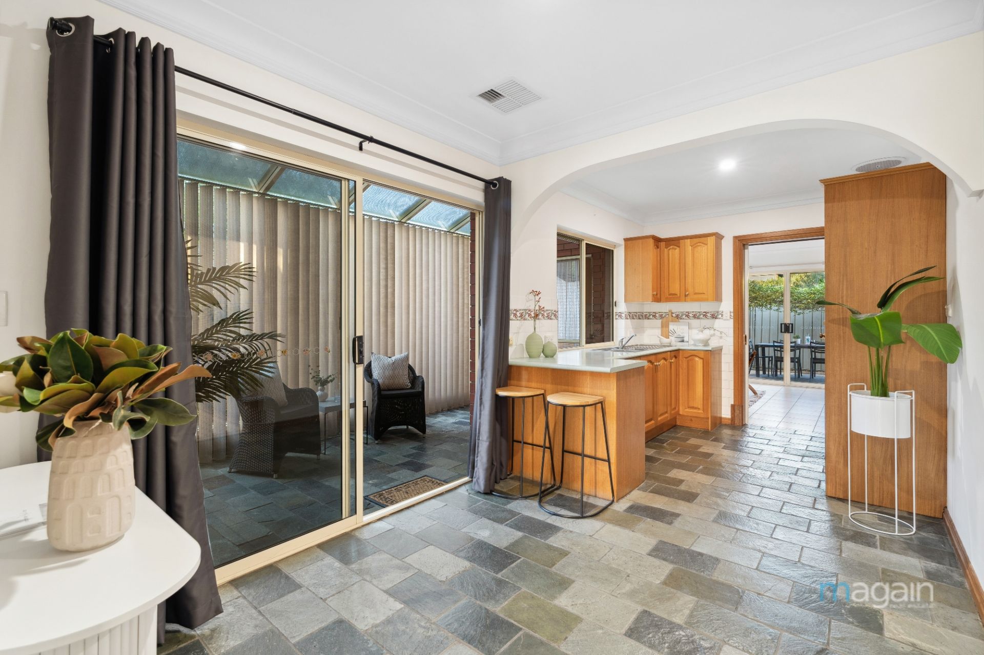 Upon entry, you'll be welcomed by a slate-tiled hallway that leads to the open kitchen and meals area. The kitchen is practical yet stylish, offering a stainless steel double sink, wall oven, electric cooktop, and plenty of storage, making it ideal for those who enjoy home cooking and entertaining. Adjacent to the kitchen/meals is a sunroom, perfect for enjoying a cup of tea or a quiet moment, featuring full-length blinds to adjust lighting as desired.