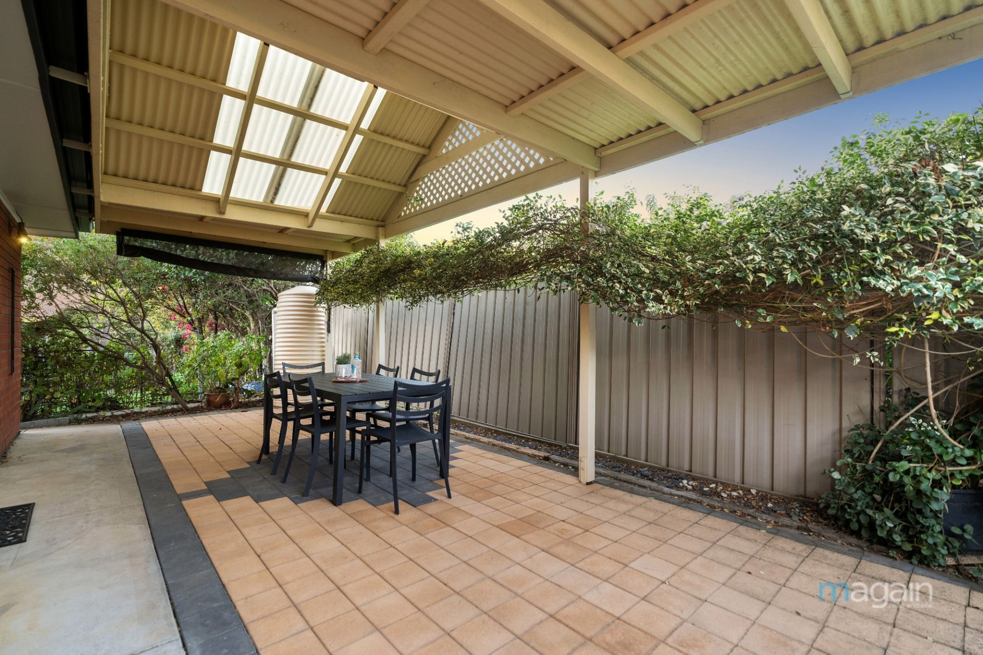 Through sliding doors off the rear living/dining room is the outdoor entertaining area, complete with a gabled roof. A space that is perfect for hosting family and friends in comfort, and is further enhanced by the vine screening along the rear, providing privacy and a touch of greenery to this low maintenance rear yard.
