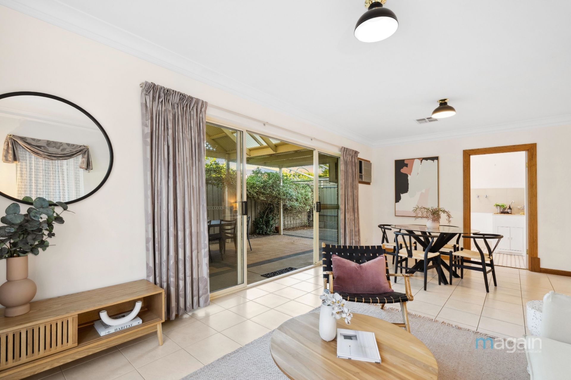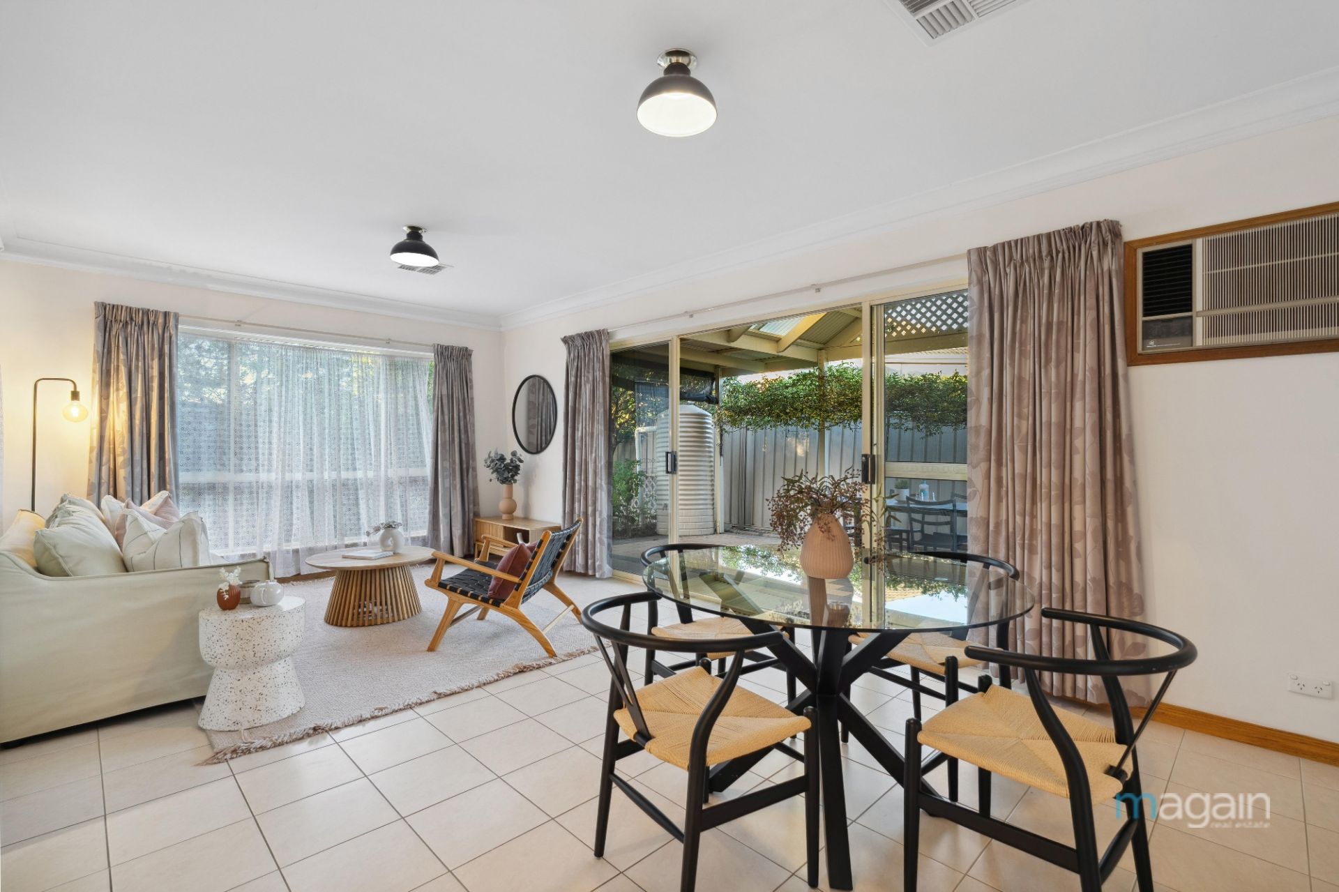 The spacious living and dining area, located at the rear of the home, is bright and airy, with tiled flooring and sliding doors that open out to a large undercover entertaining area.