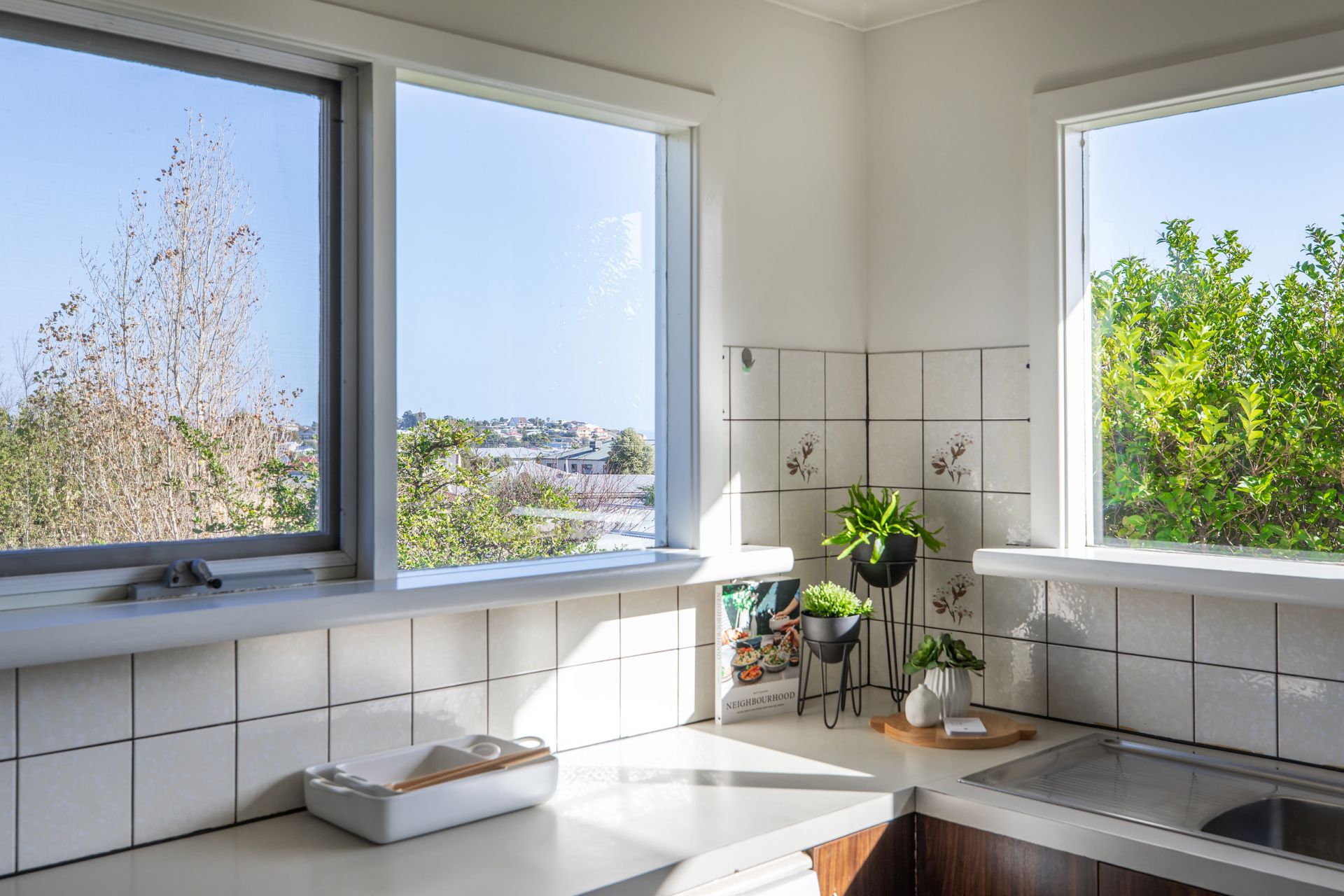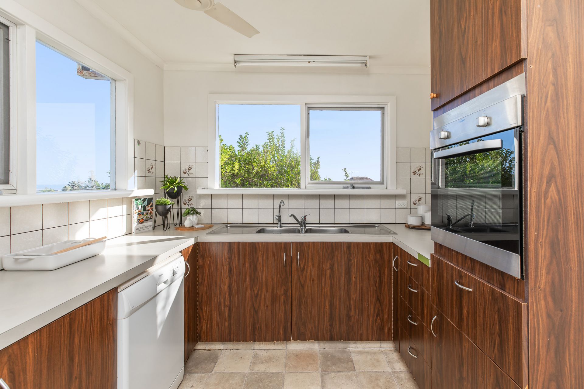 The kitchen is equipped with dishwasher and walk in pantry but most importantly there are even ocean views from the kitchen sink.