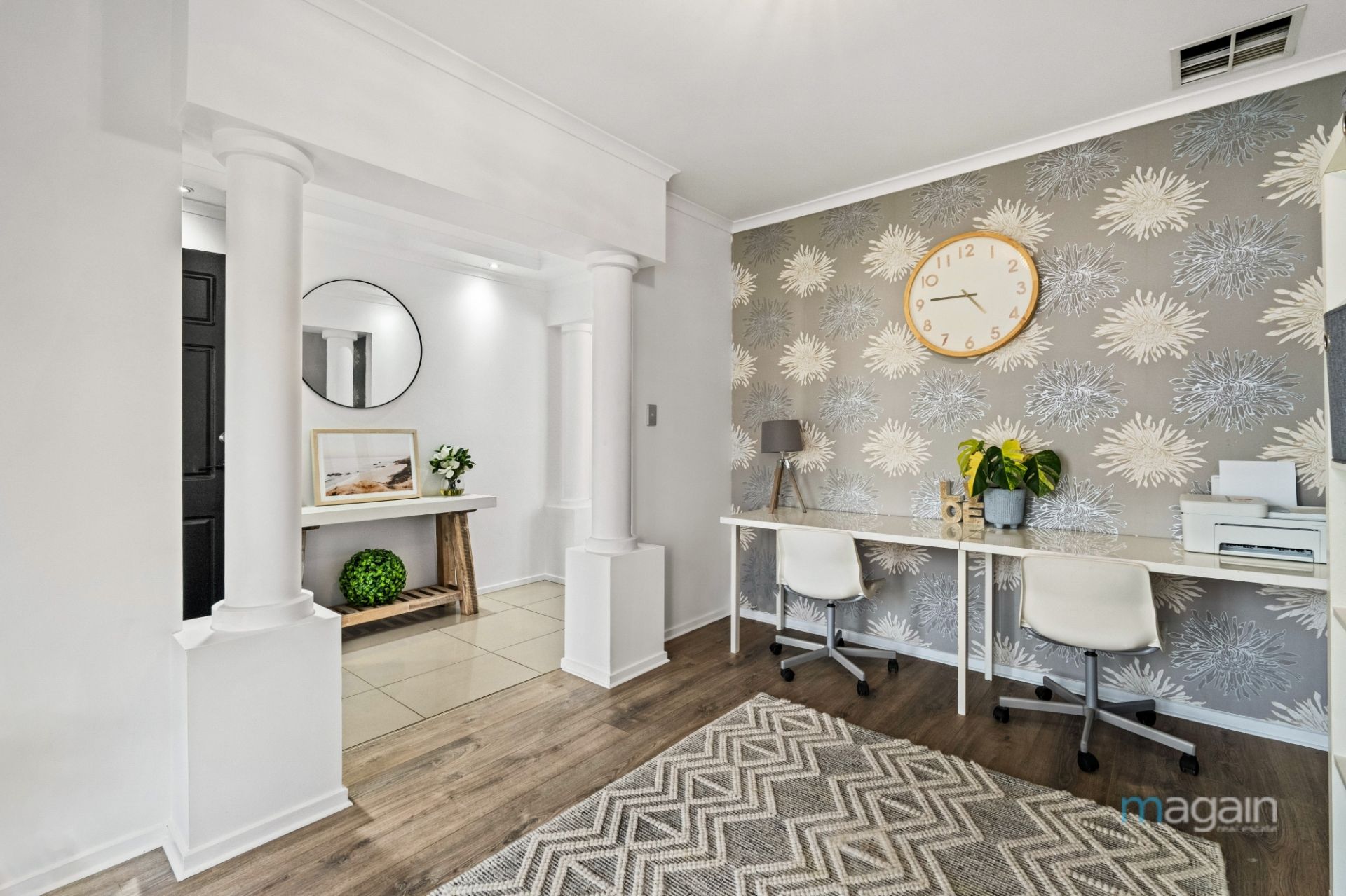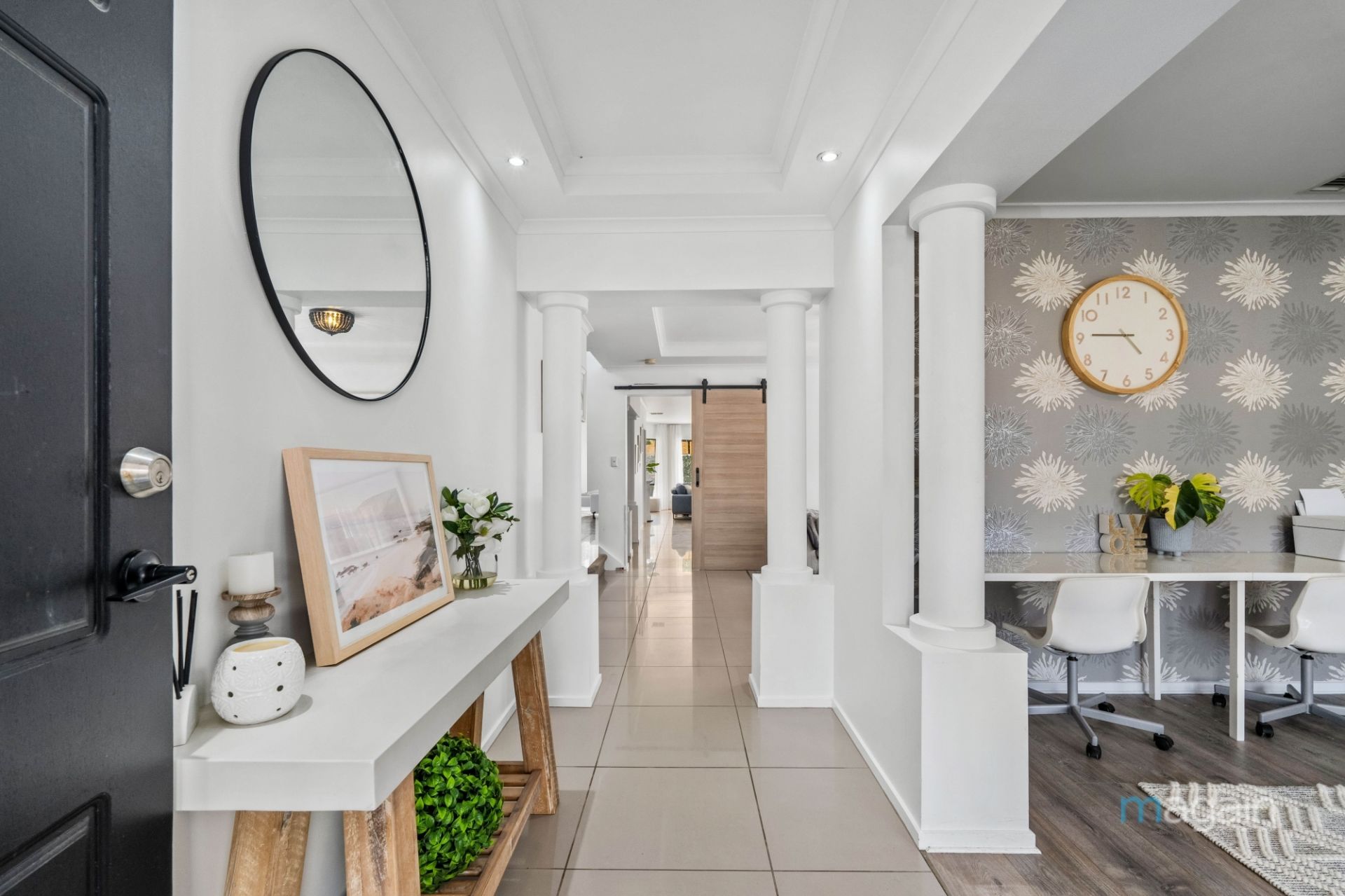 As you step inside, you're greeted by a grand entrance hallway adorned with glossy tiles and crowned by vaulted ceilings, setting the tone for the elegance that awaits. To your right, a tastefully appointed home office with rich timber flooring offers the perfect space for work or study.