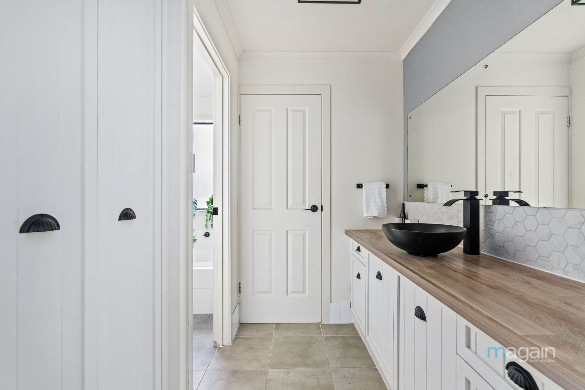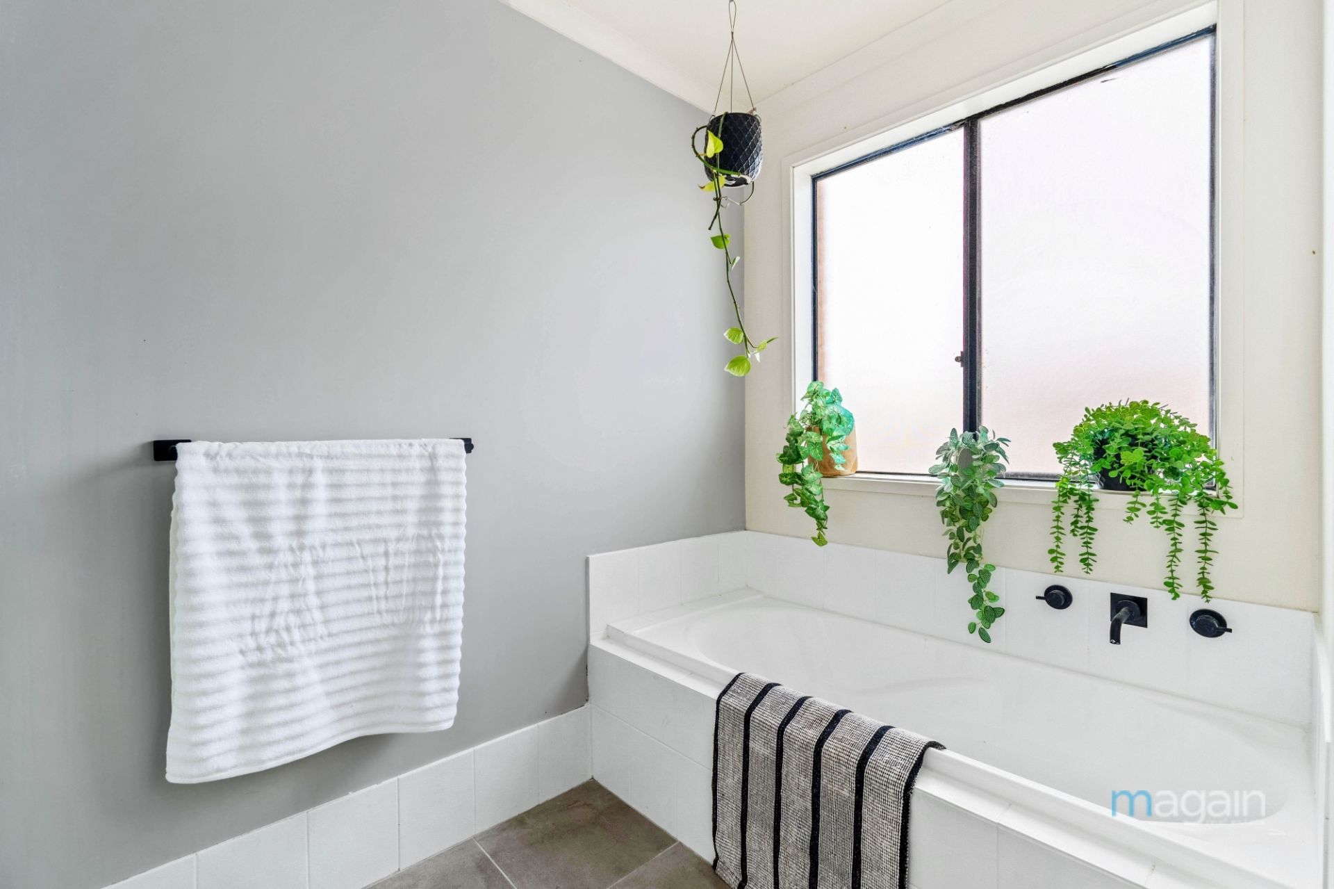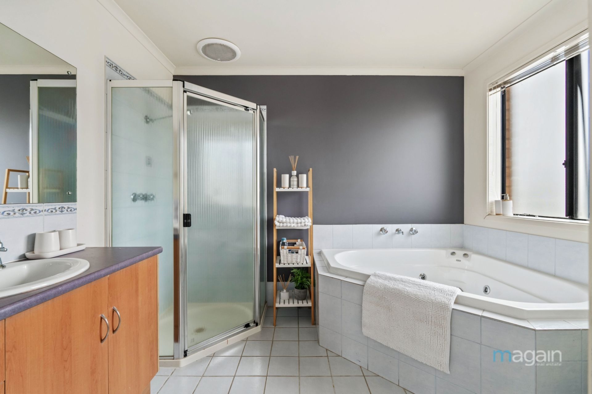 The spacious master bedroom on the upper level offers a walk-in robe, a built-in robe, and a private ensuite complete with a corner spa bath, ensuring a tranquil retreat. Bedrooms two and three also feature built-in robes, while bedroom four offers flexibility for various uses.
