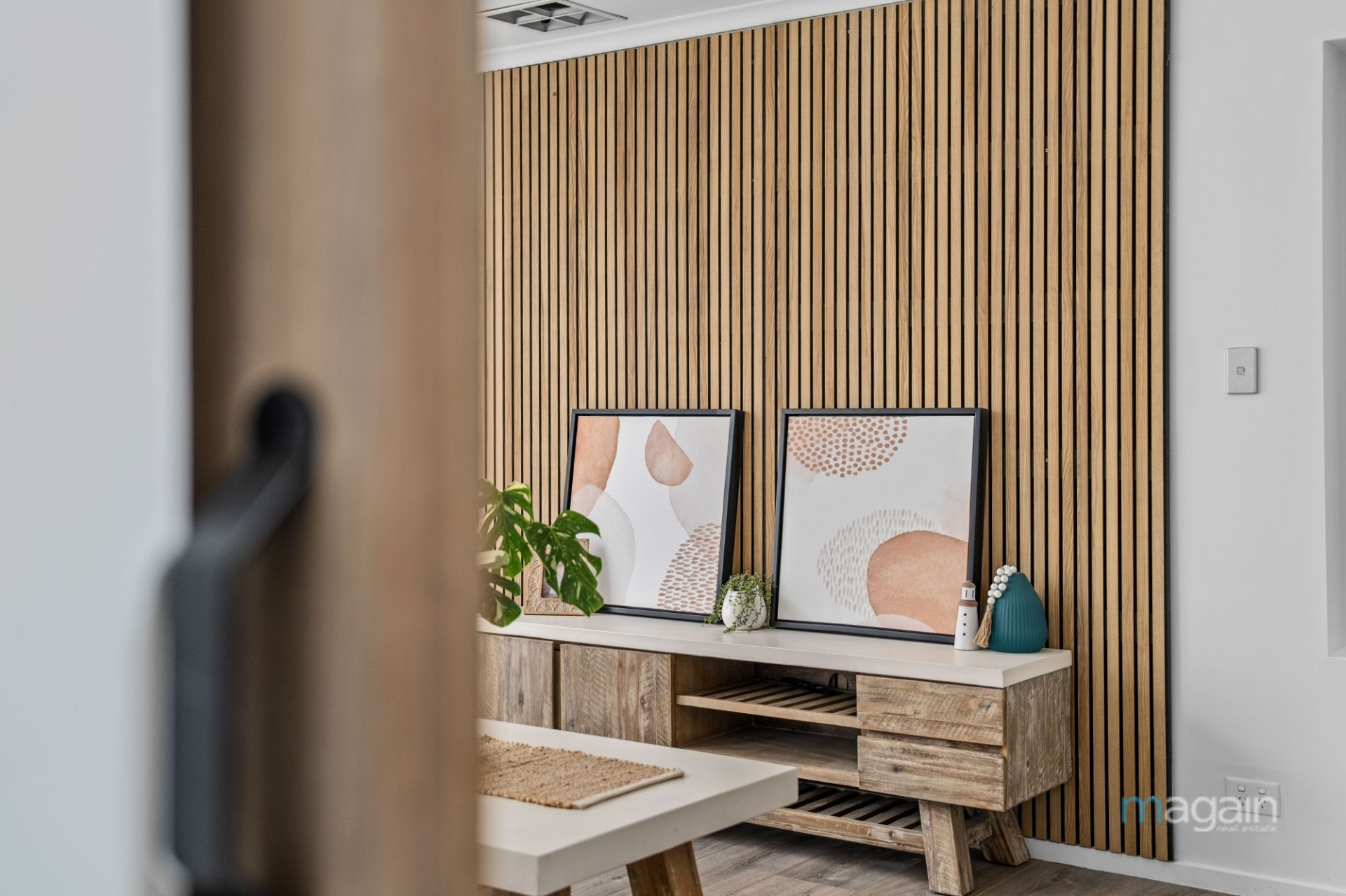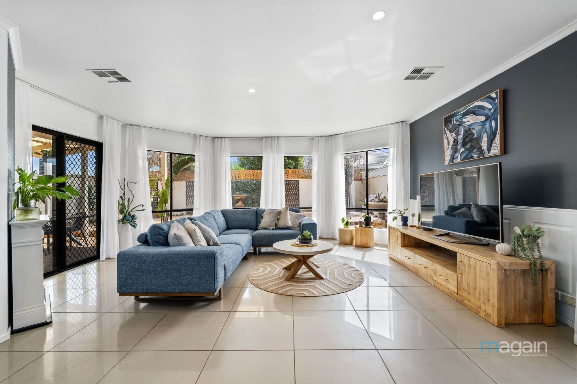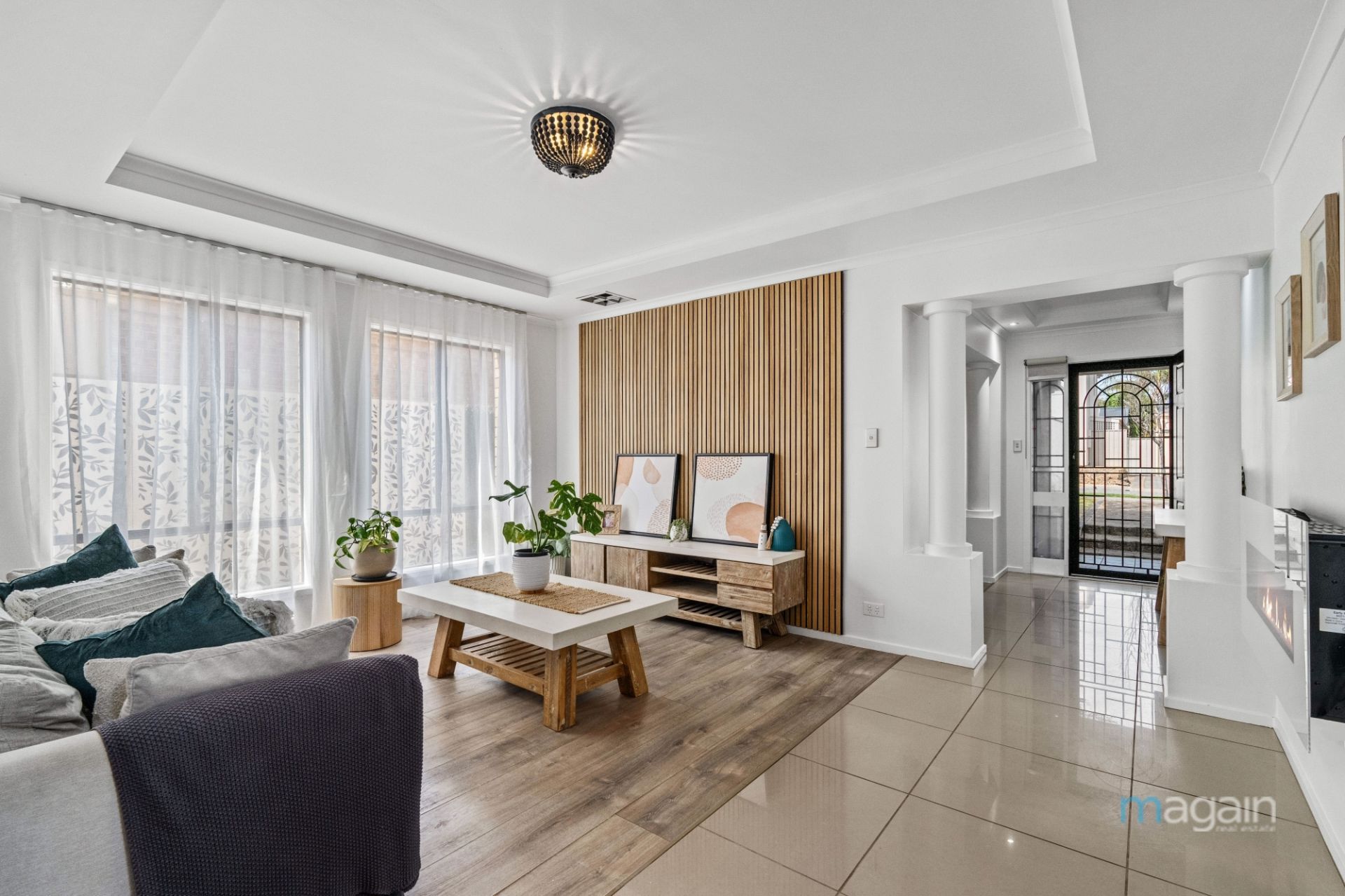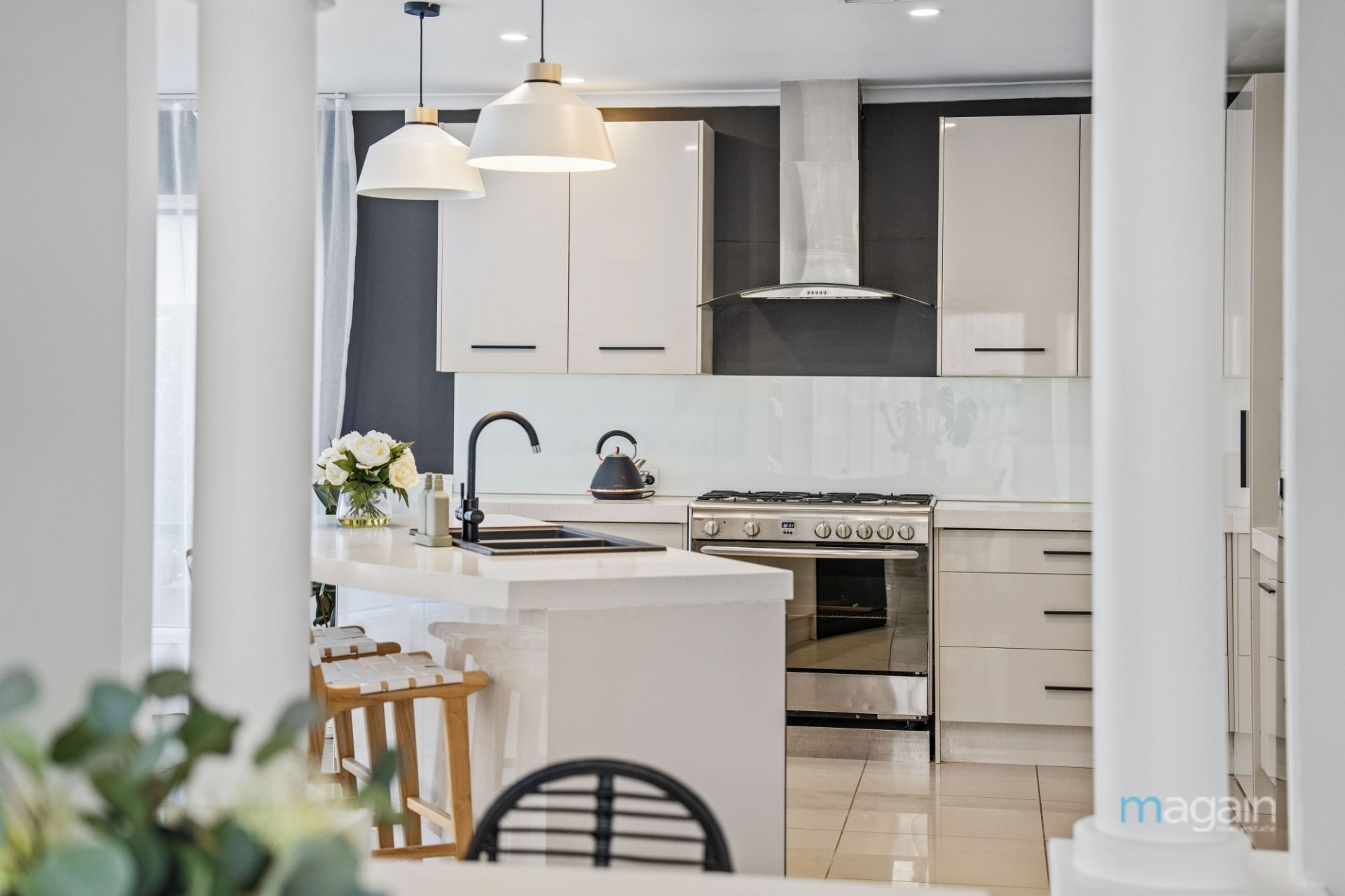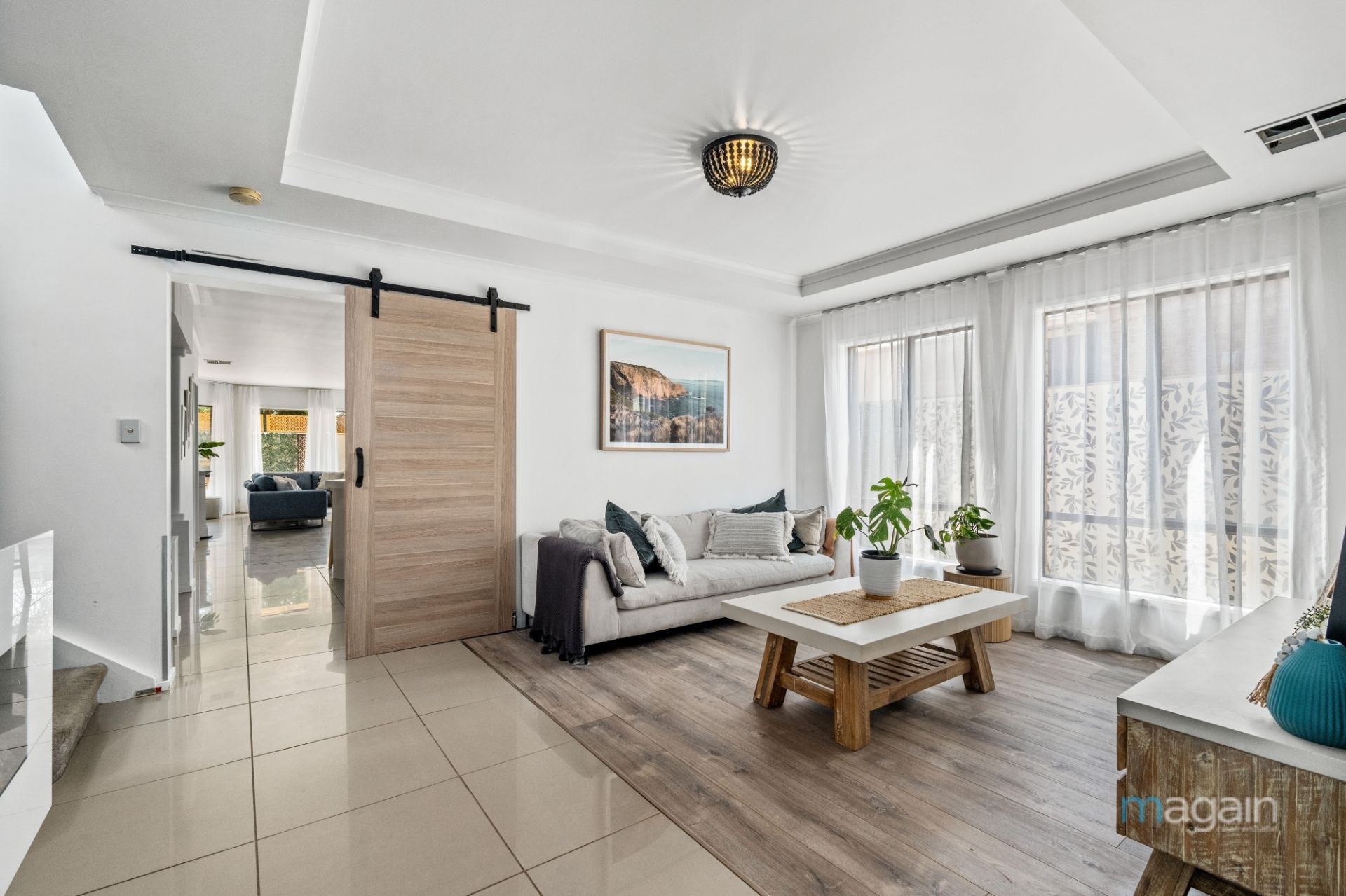 Continuing on, you'll discover a formal lounge, featuring a chic timber feature wall and sheer curtains that create an ambiance of sophistication. Adjacent is a formal dining area that seamlessly flows into the stunning kitchen that overlooks a casual meals and family living, an entertainer's dream. This well-appointed kitchen showcases stone-top benches, a stainless steel oven with a gas cooktop, a dishwasher, and an island bench with ample storage, making it the heart of the home.