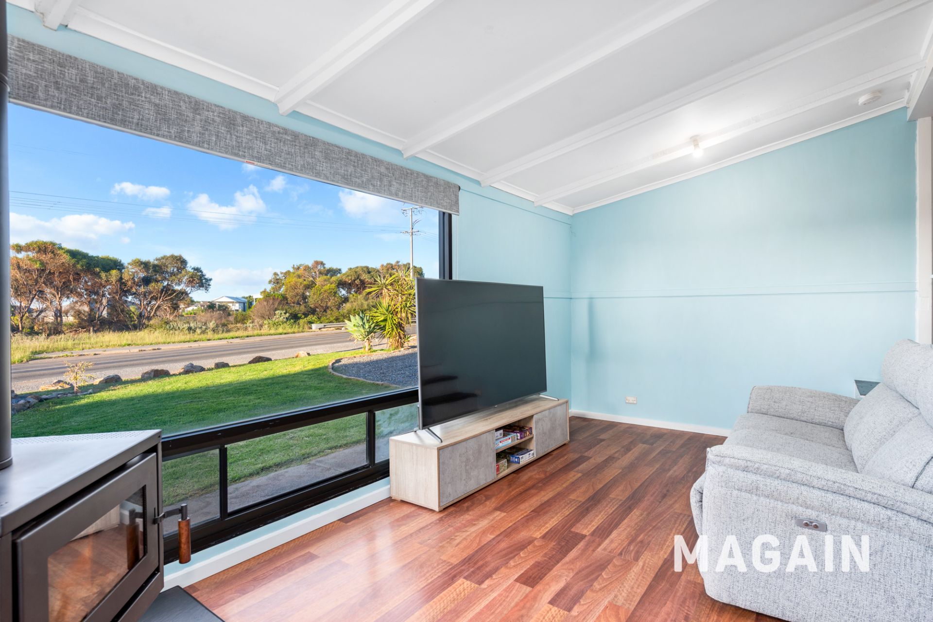 Stepping inside, timber-look floors flow throughout, complementing the relaxed beachside aesthetic, while the cosy combustion heater and split system make this the perfect year-round retreat. The light-filled kitchen and dining zone complete with a dishwasher, free standing oven/cook top and a ceiling fan for summer comfort to keep things perfectly temperate. The lounge enjoys lovely natural light and views, creating a comfortable space to unwind after a day by the sea supported by a 7kW solar system that keeps the home running efficiently in every season.