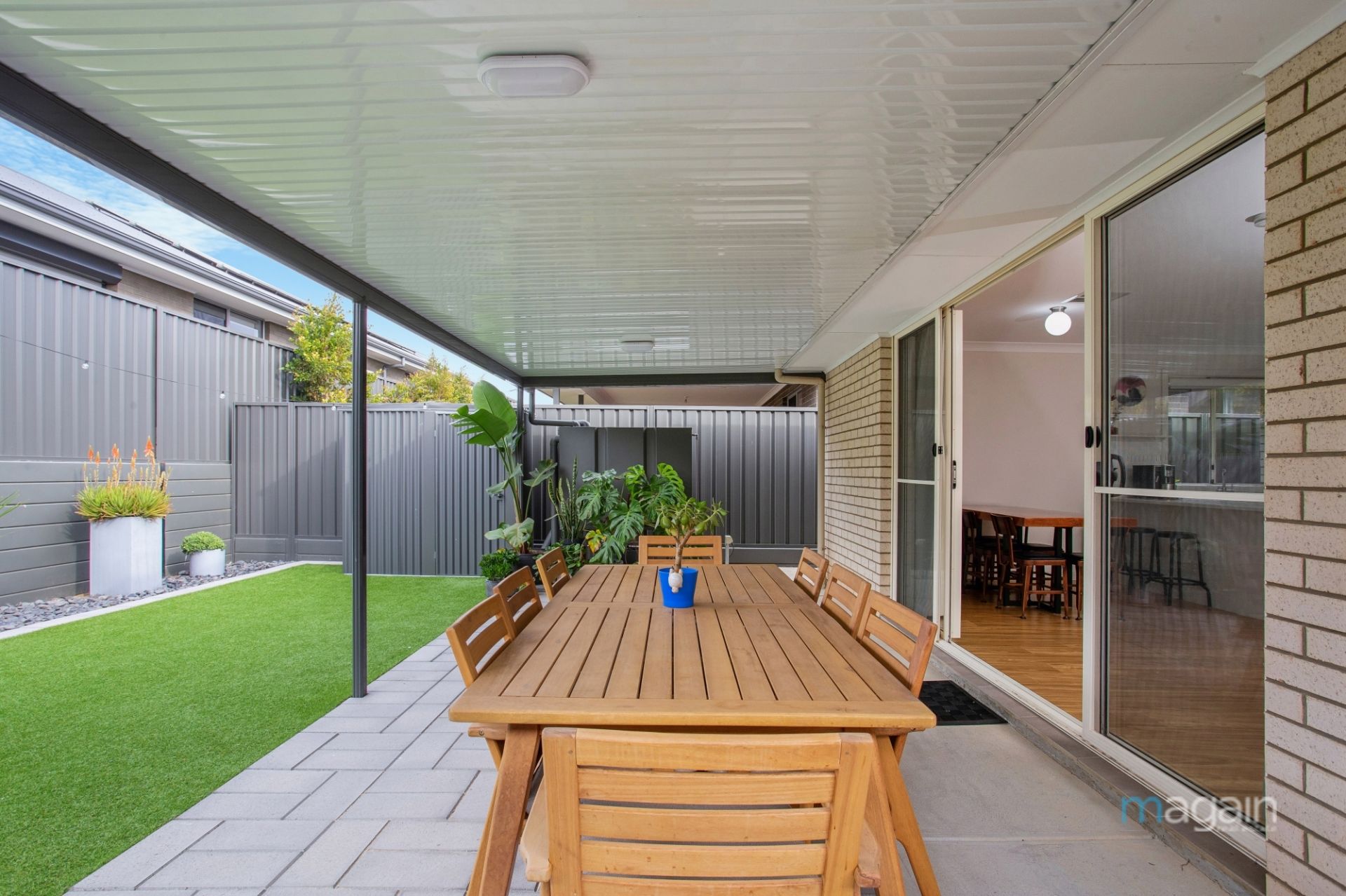 The transition from indoor to outdoor living is effortless, courtesy of glass sliding doors leading to a delightful outdoor entertaining space. A pergola provides shade and shelter, creating an inviting venue for gatherings throughout the year, while the low-maintenance artificial grassed area completes the outdoor tableau, offering a lock-up-and-leave lifestyle.