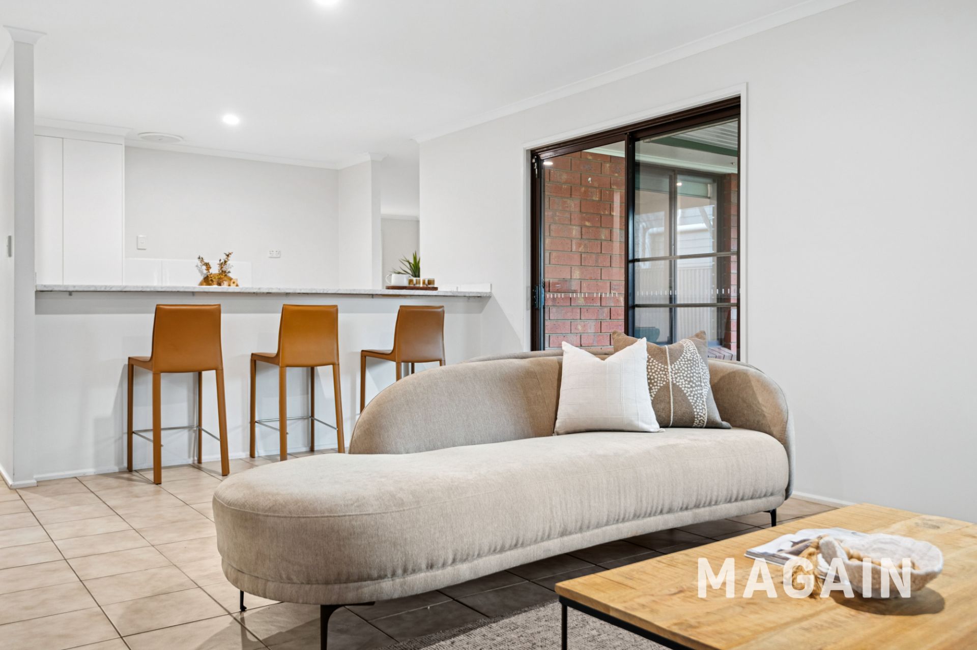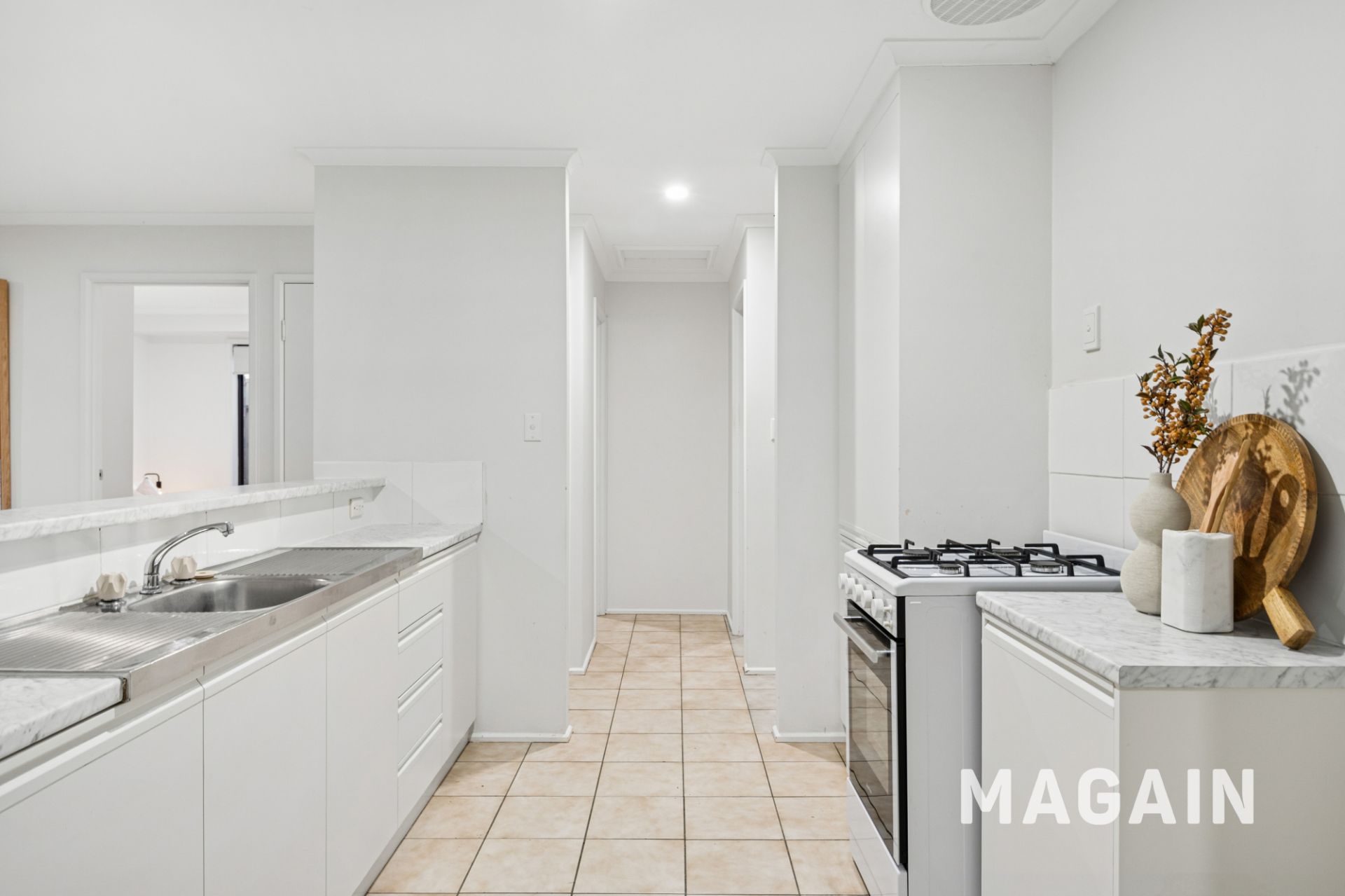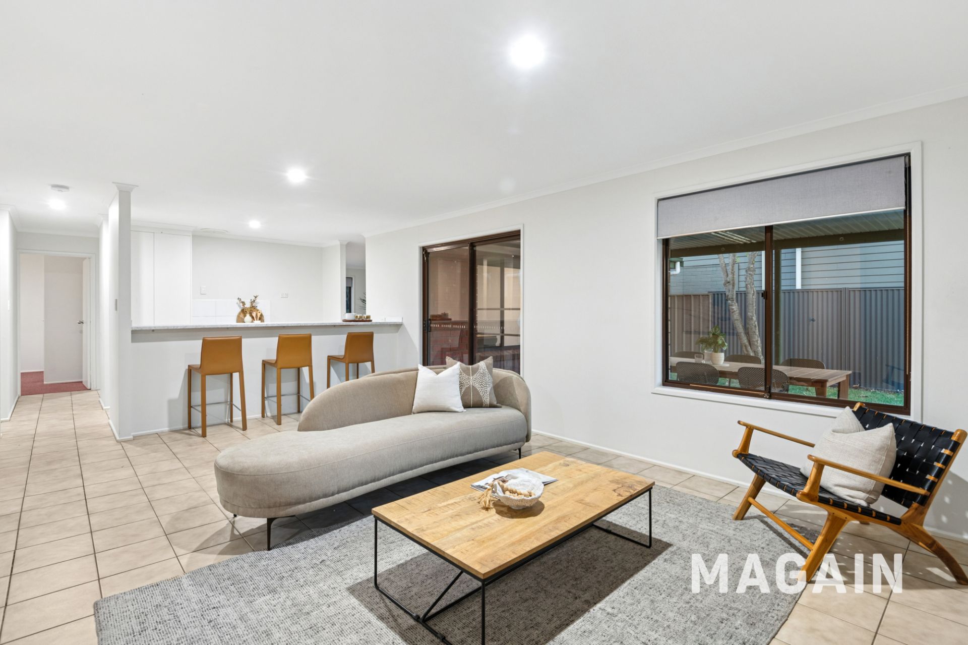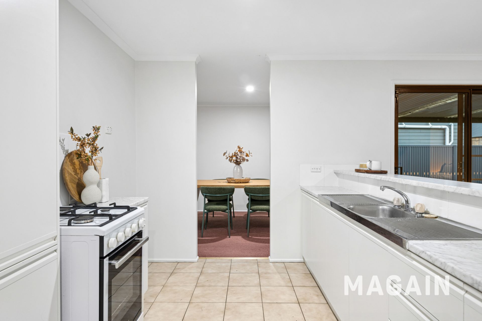 Flowing down the hall, the home opens into a bright and functional open-plan kitchen and living zone. The galley-style kitchen provides a gas cooktop, ample cabinetry, stainless steel sink and breakfast bar seating - ideal for casual meals or entertaining. Two additional carpeted bedrooms, both with built-in robes, complete the accommodation, while a separate toilet and laundry with side access add day-to-day practicality.