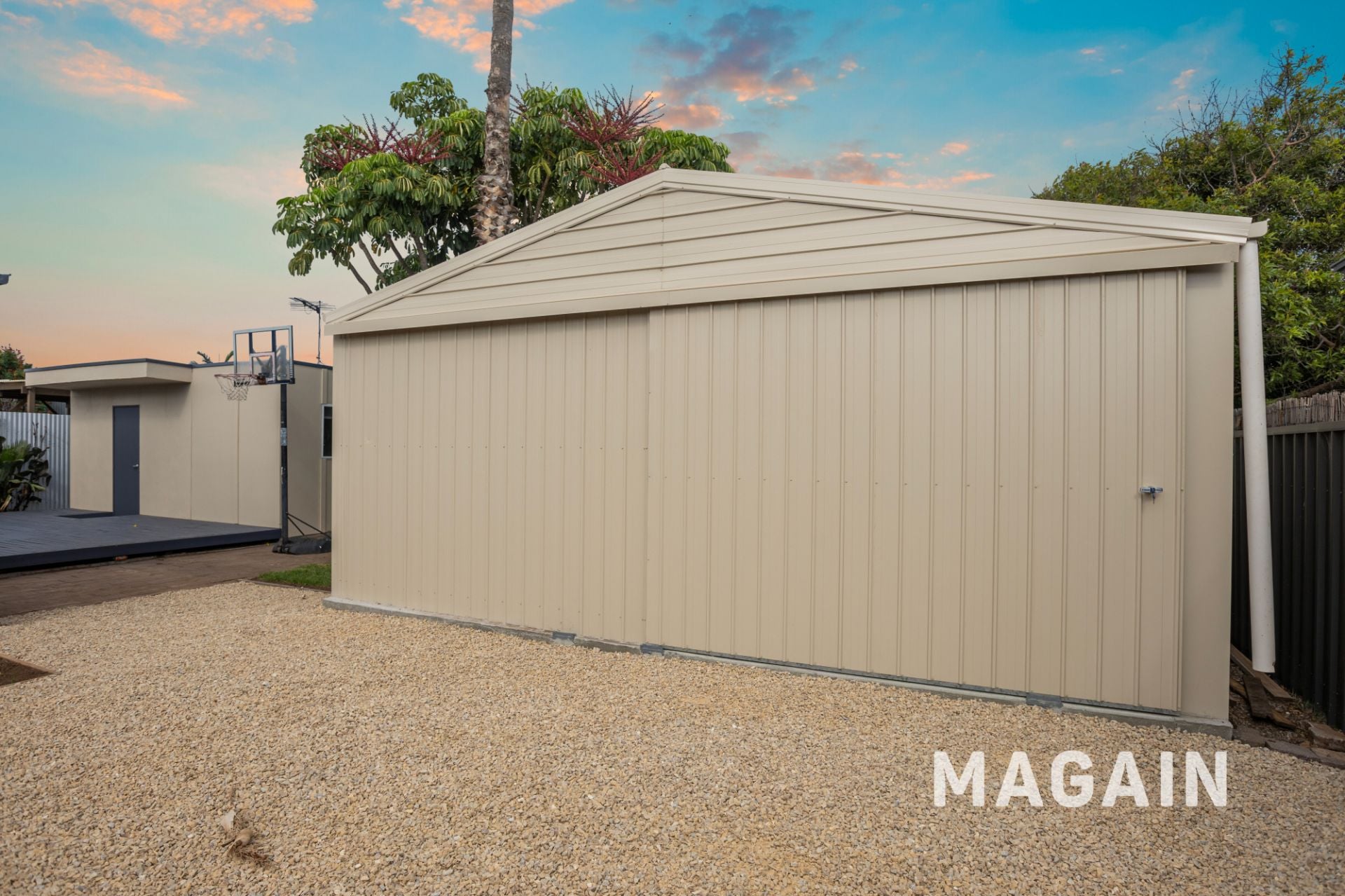 There is a single garage located under the main roof with roller doors both front and back providing direct drive through capability to a 6m x 6m (approx) doulbe garage/workshop. There are lawned areas and designated easy care garden beds , even an outdoor shower which is ideal for when you come home from a swim or a surf.