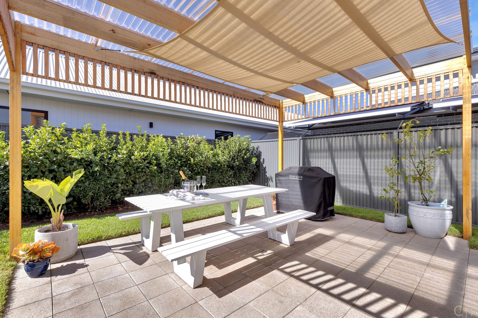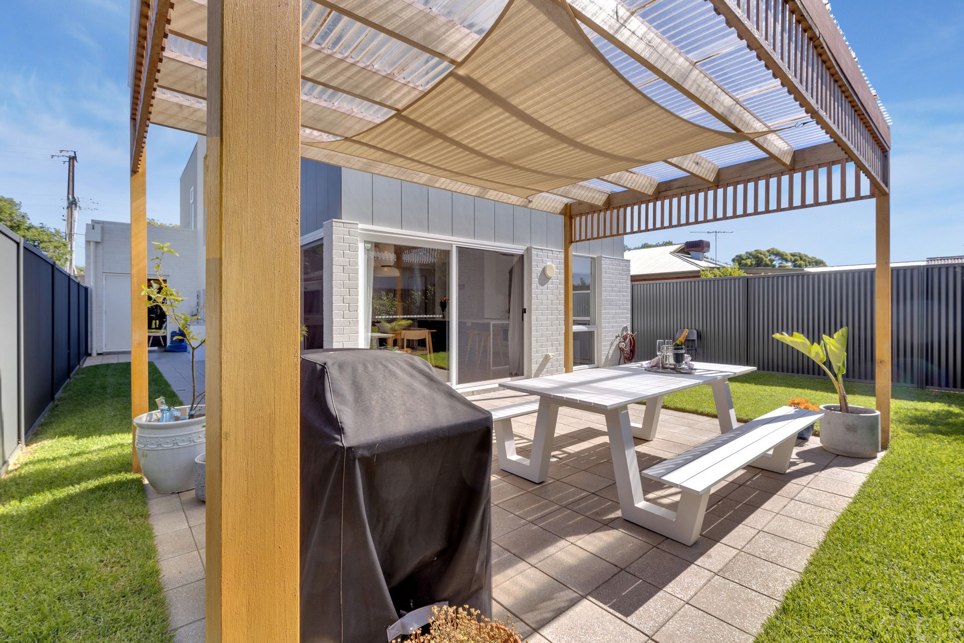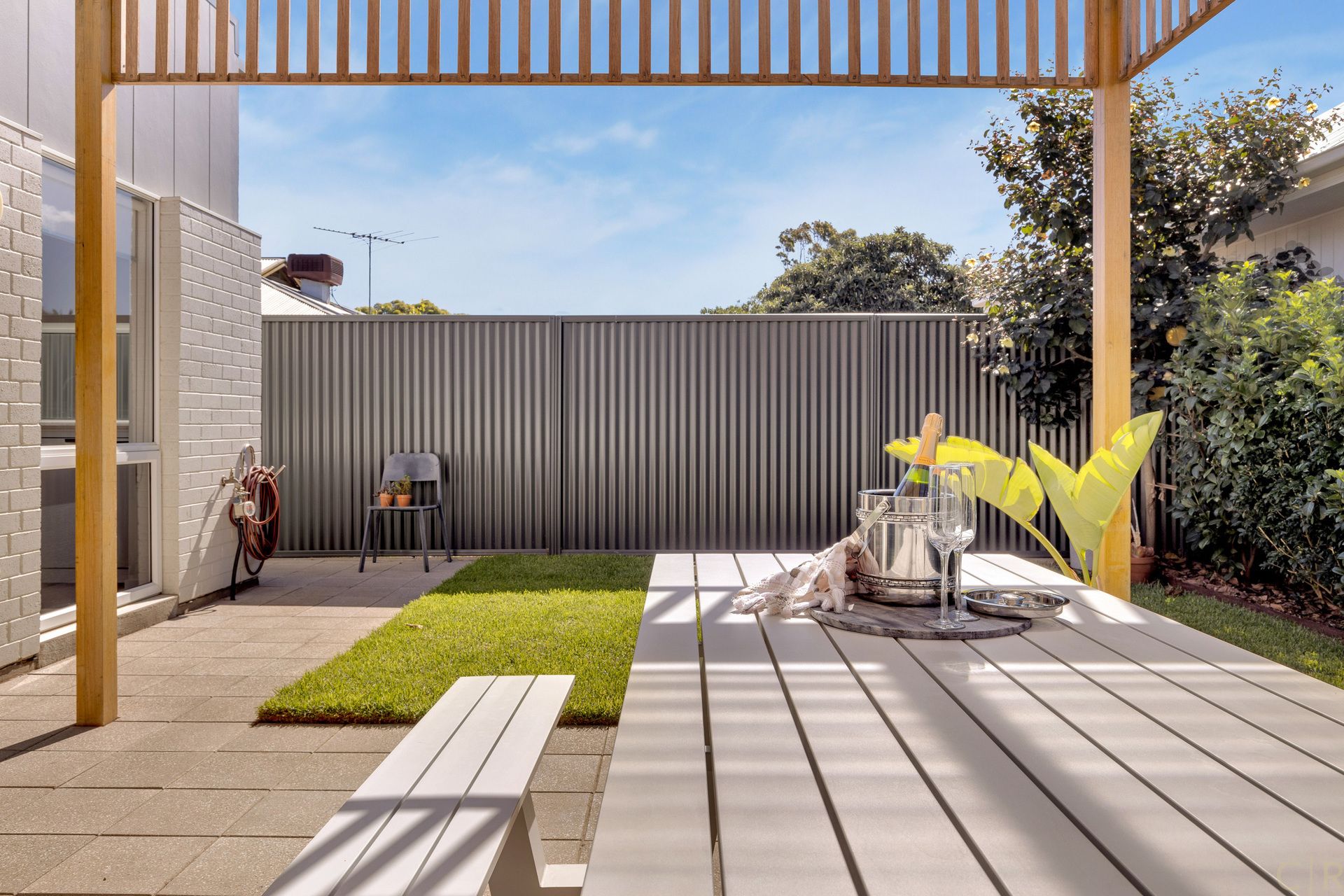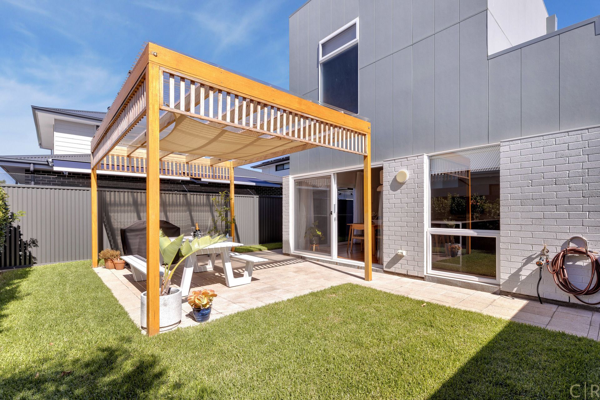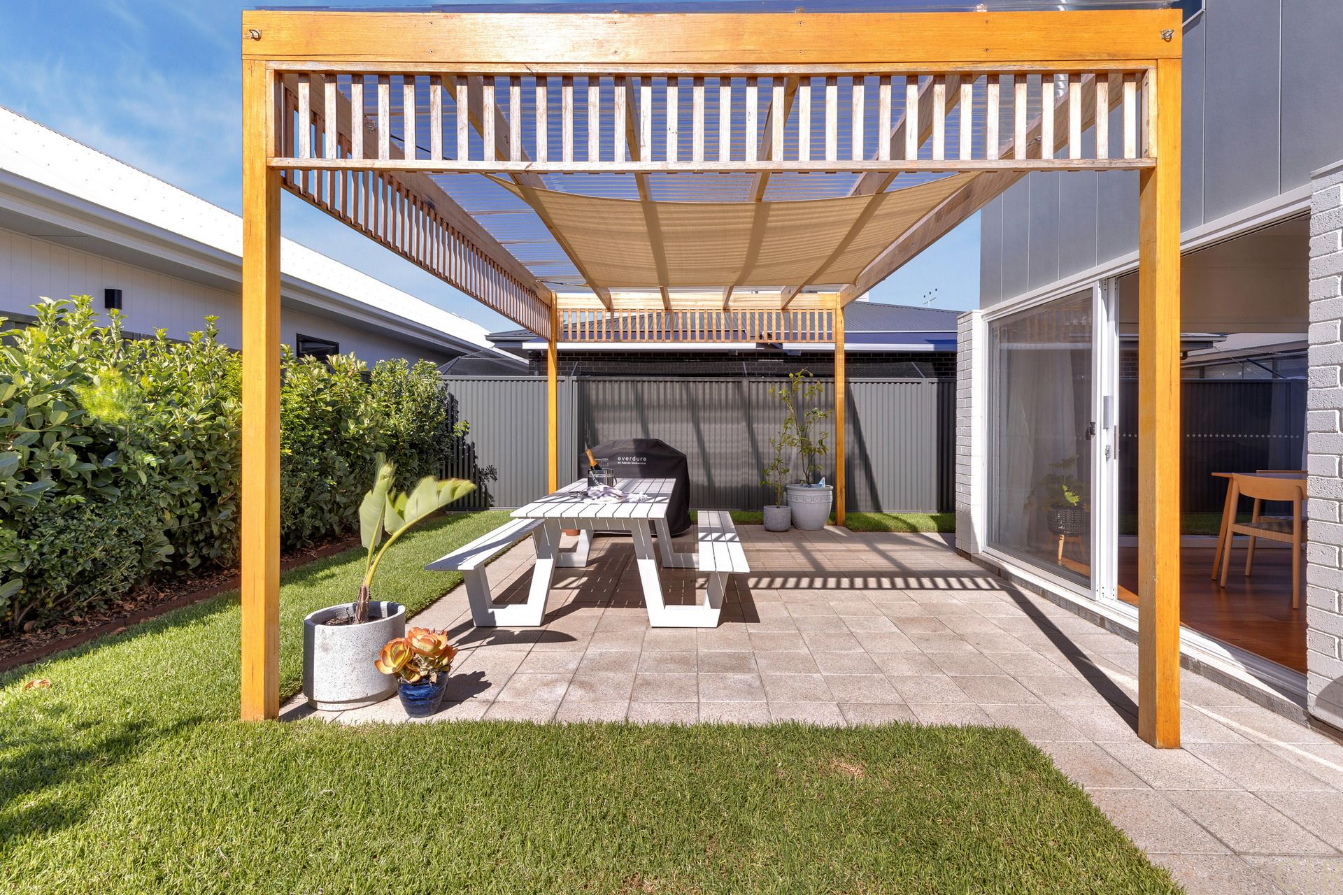 Outside you will find a similar theme with a weather protected pergola and entertaining space, along with a fully irrigated green space for entertaining, playing with the kids or giving your beloved pet some room to run around.