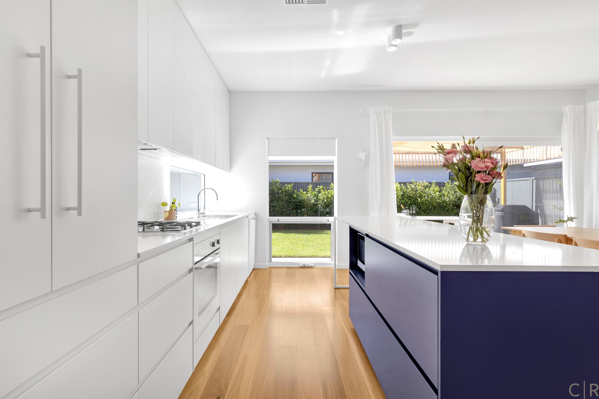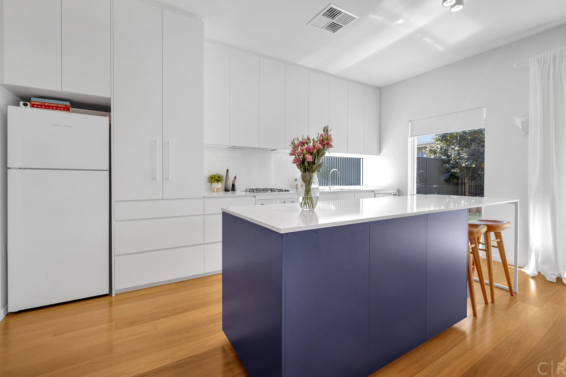 On entering this home, you will enjoy the unique featured tiled entrance which brings a lovely burst of colour and flair to you and your guests on arrival. Once inside, hardwood timber floors will lead you through to the open plan lounge and kitchen hub which includes high quality Silestone benchtops and splash backs along with a charming blue island bench and an abundance of storage space for modern day kitchen appliances and entertaining needs!