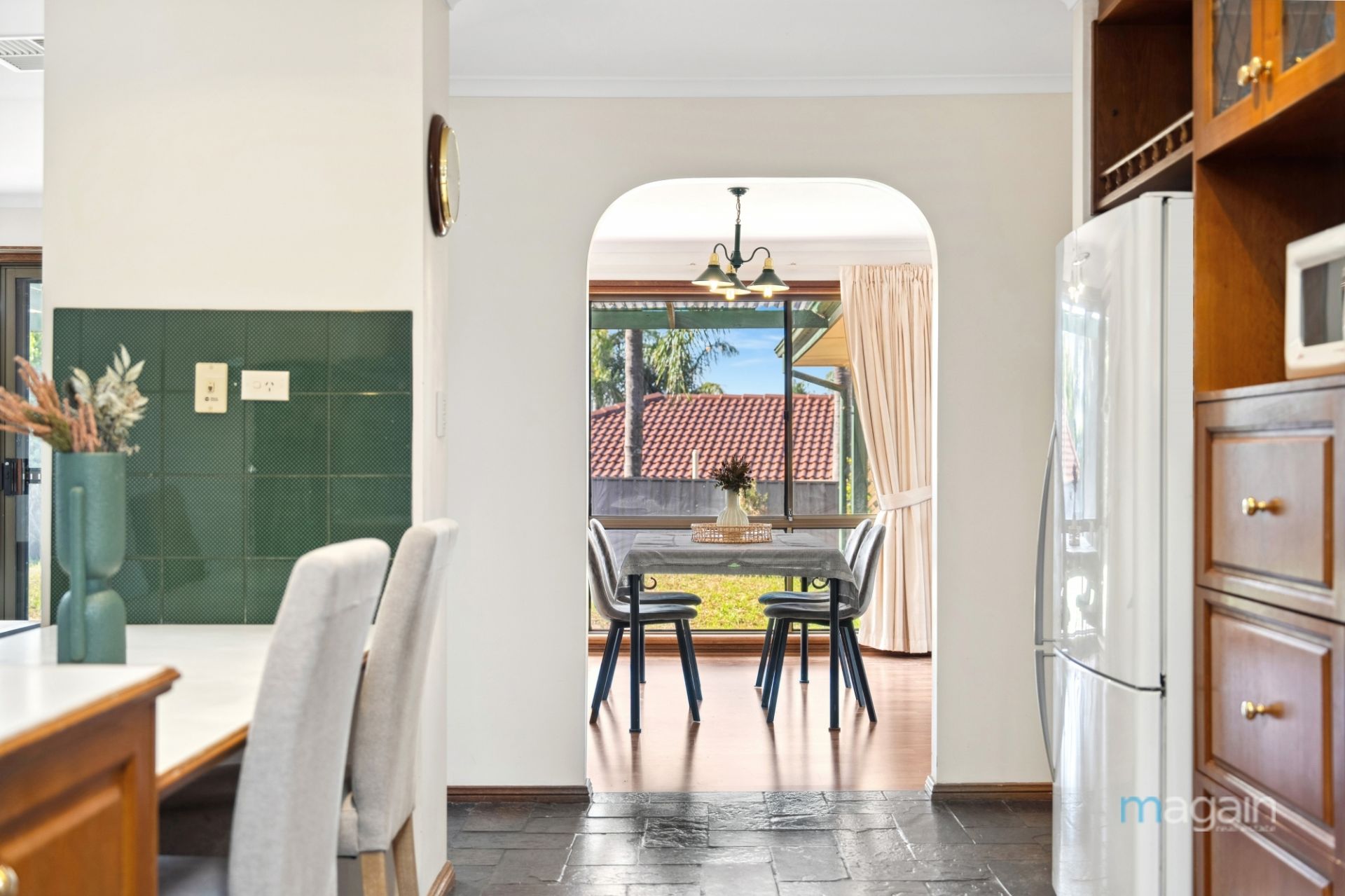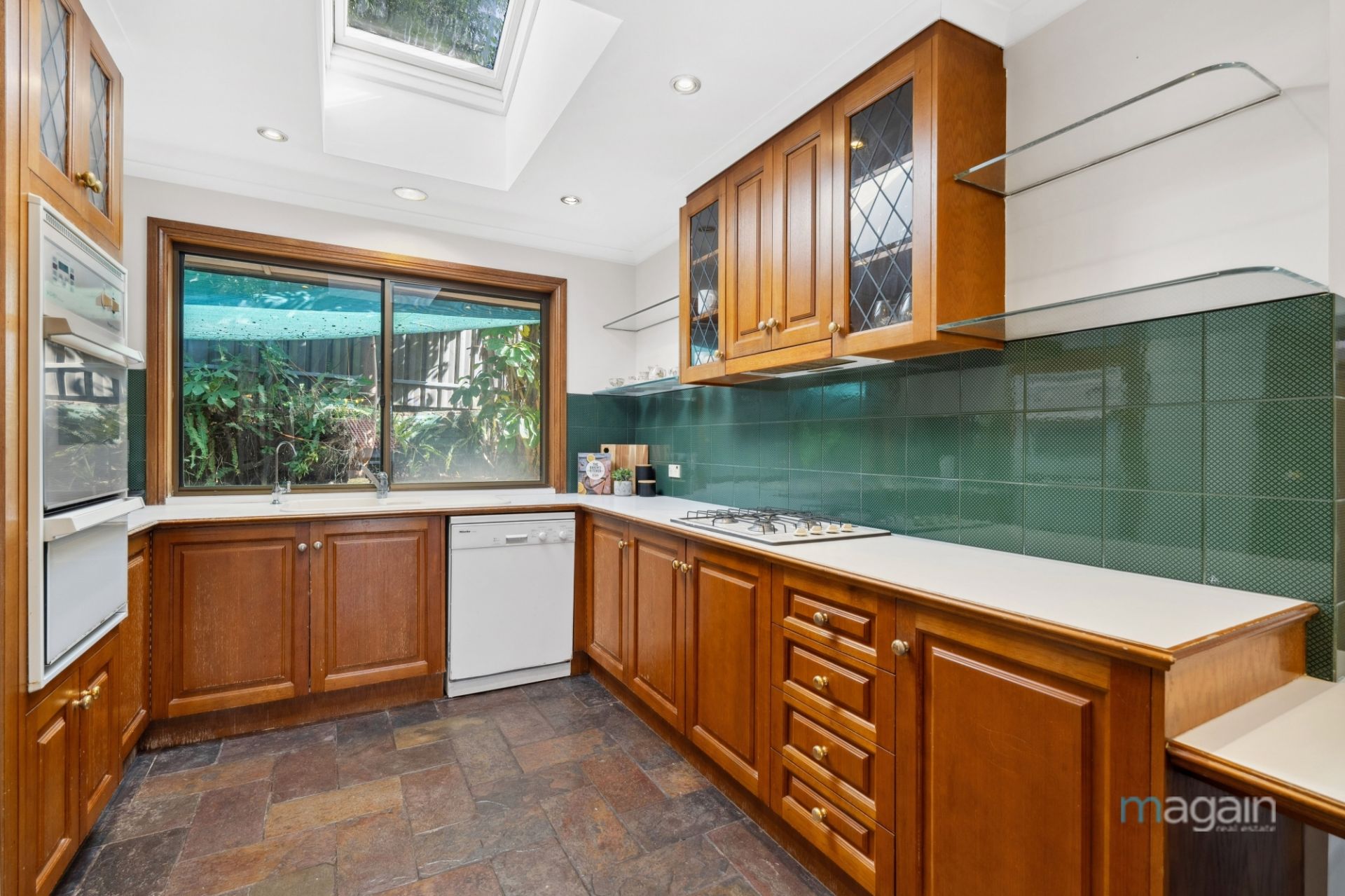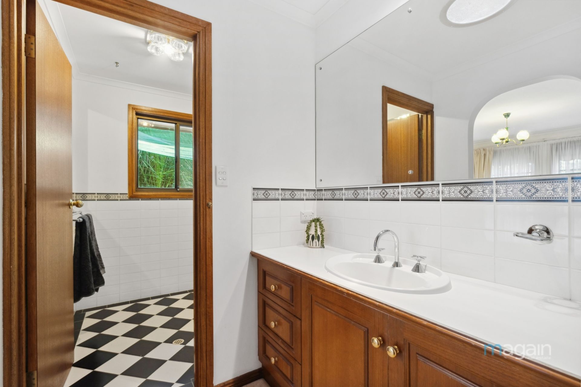 The heart of the home lies in its timeless timber kitchen, equipped with modern conveniences including a built-in table for casual dining, a walk-in pantry, and quality appliances such as a dishwasher and gas cooktop. Overlooking a family living space, the kitchen fosters a sense of connection and warmth. Glass sliding doors seamlessly integrate indoor and outdoor living, inviting you to enjoy the expansive backyard.