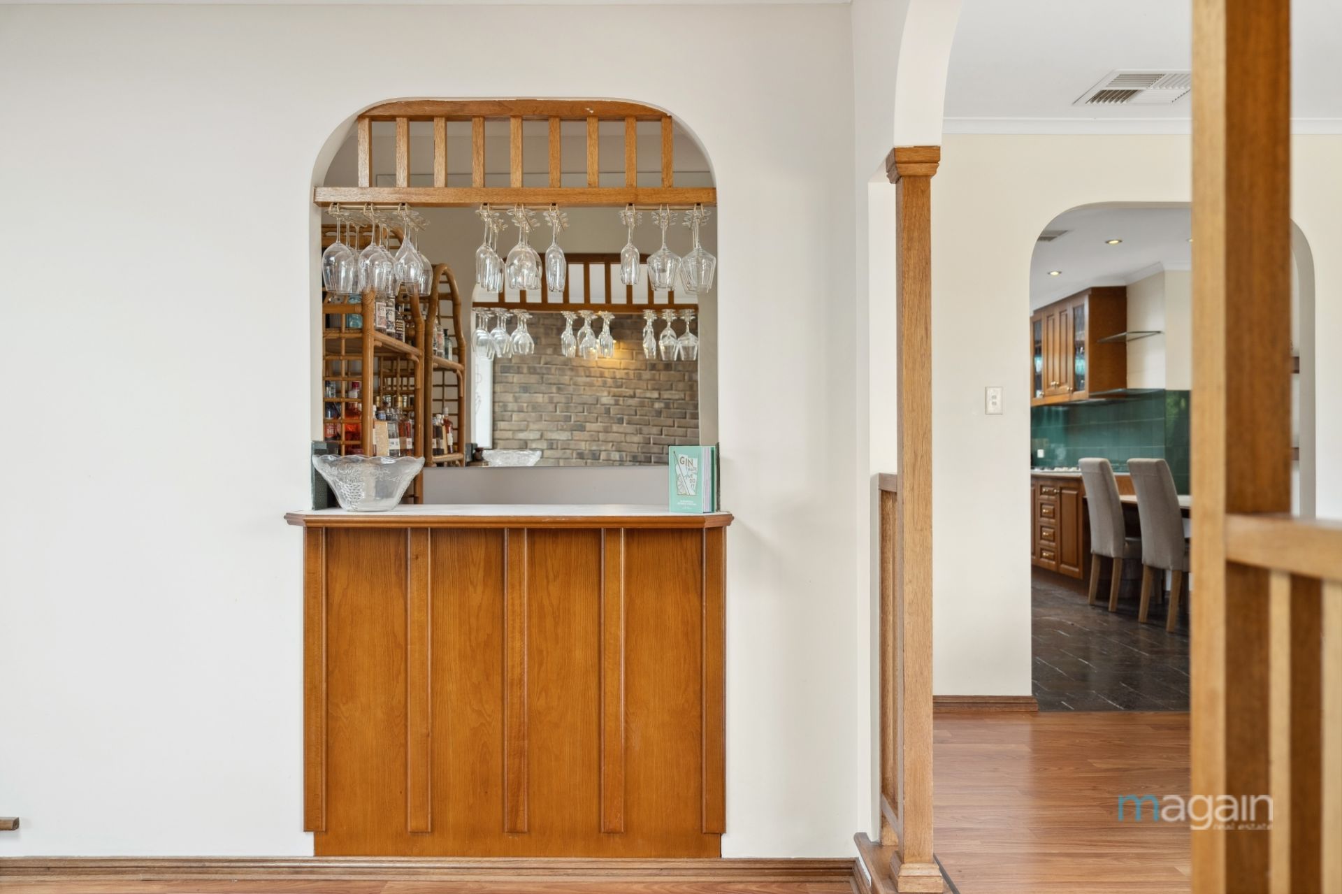 To the right, a sunken formal lounge awaits, adorned with large windows that frame picturesque views of the front garden. A skylight floods the room with natural light, creating an inviting ambiance. Adjacent to the lounge, a stunning built-in bar adds a touch of sophistication, perfect for entertaining guests. Further along, a formal dining area beckons, offering an elegant setting for special occasions.