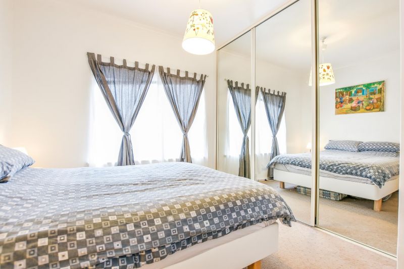 > the functional floor plan offers two good size carpeted bedrooms, master with built in mirrored robes