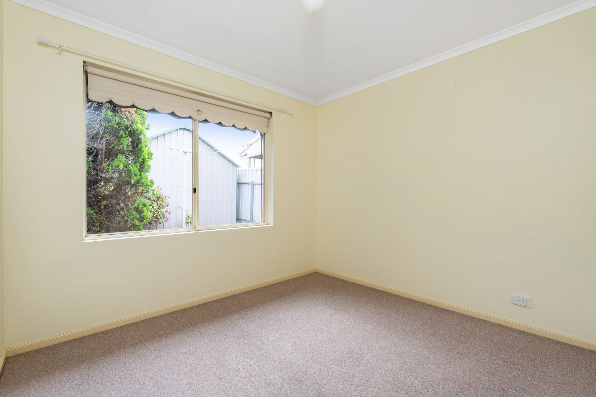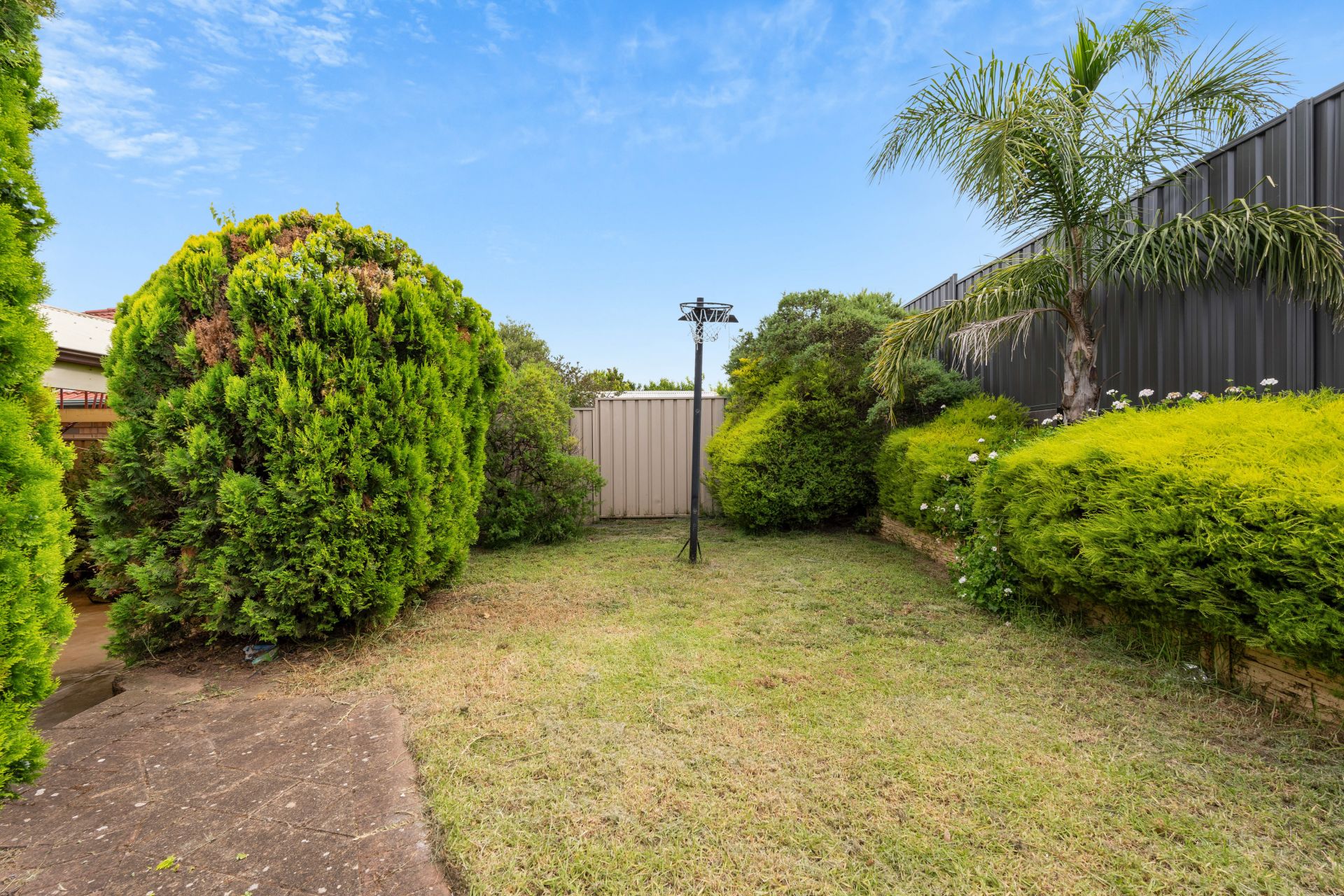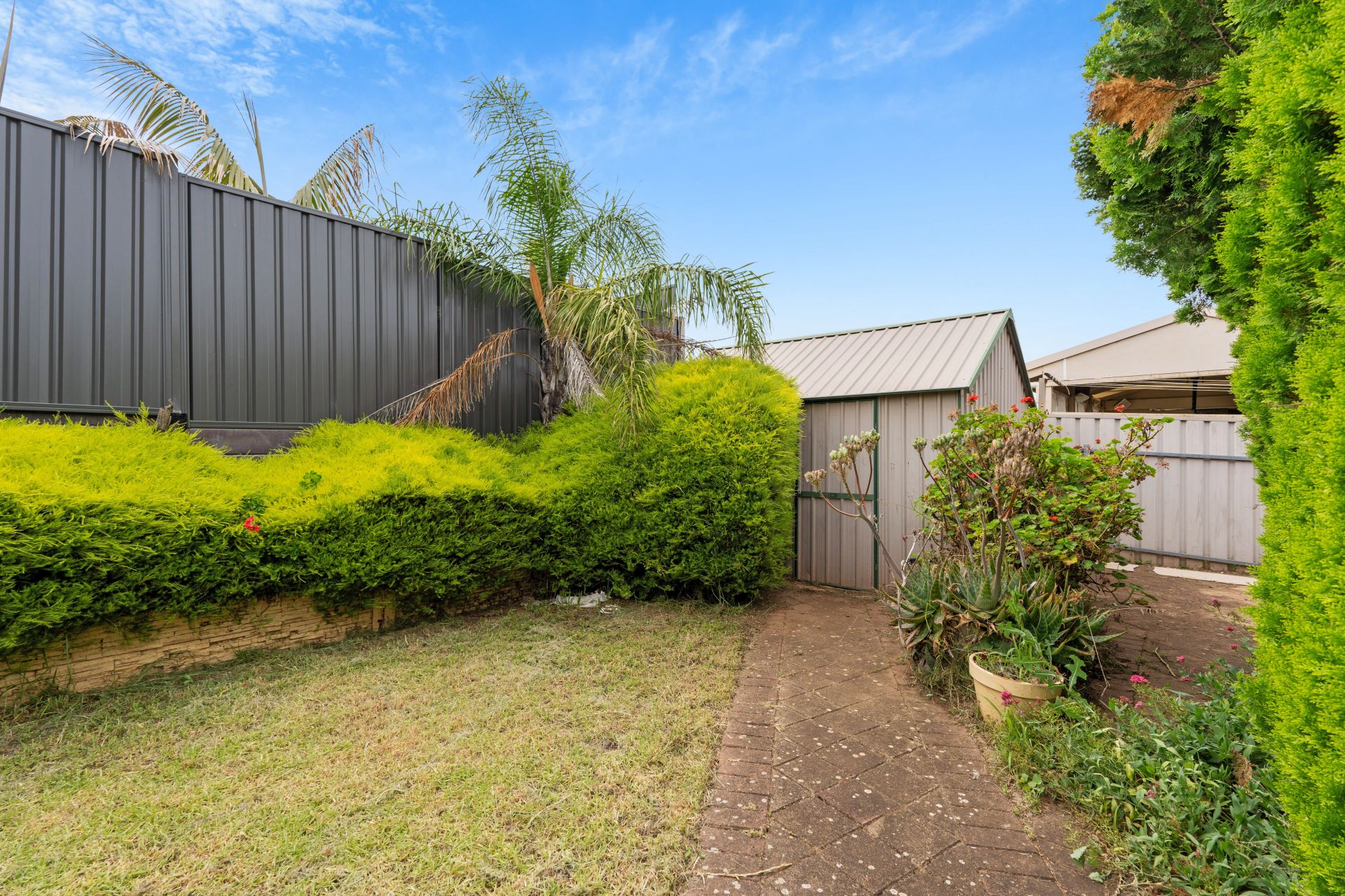 > large powered garden shed & small grassed area for the kids & pets.