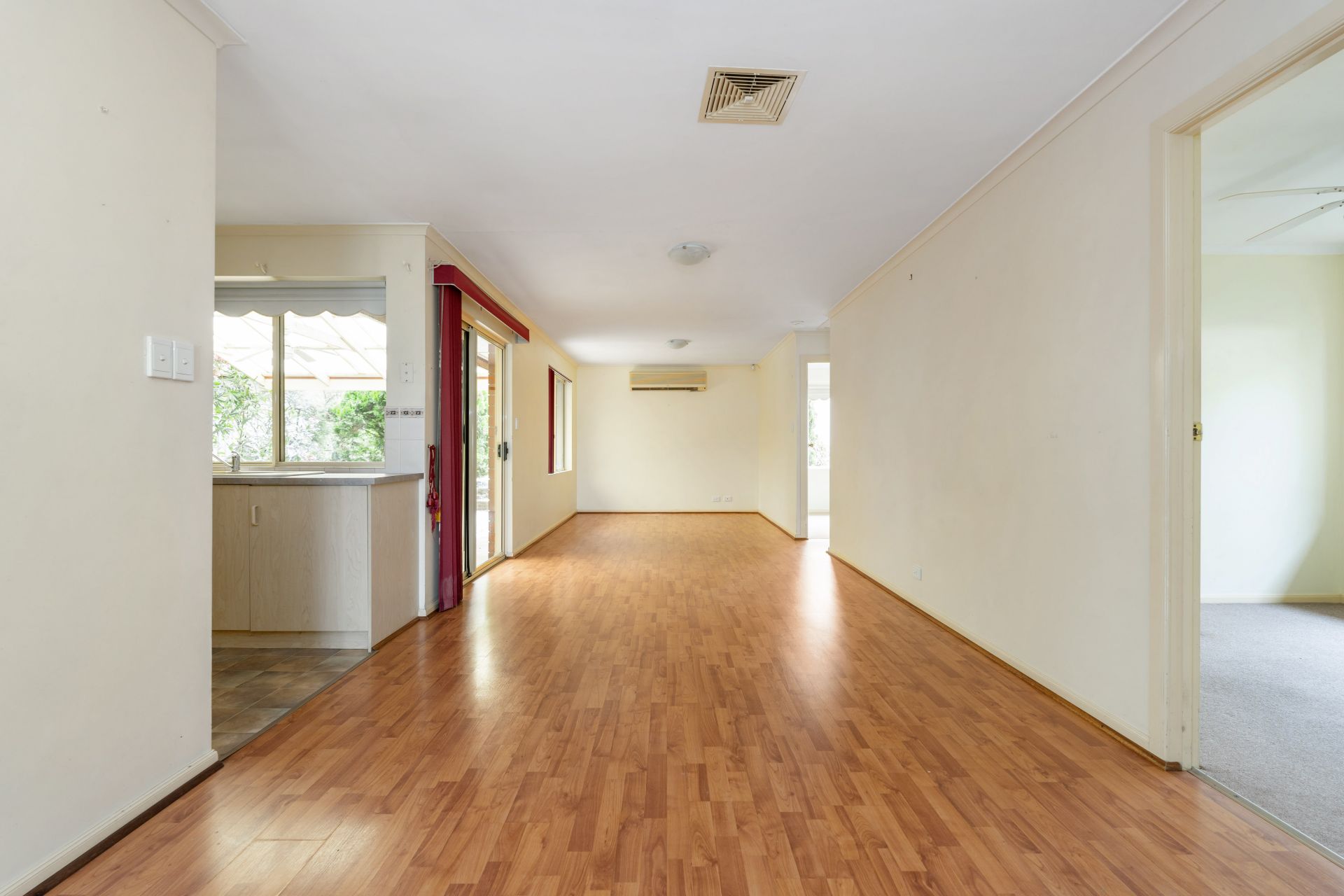 > open plan dining, family & kitchen with split system air conditioning.