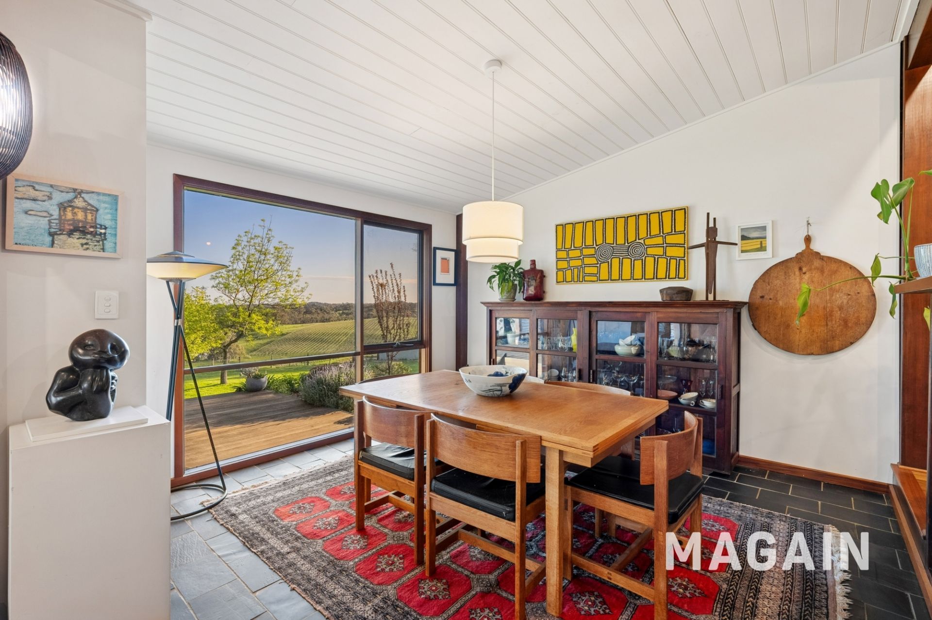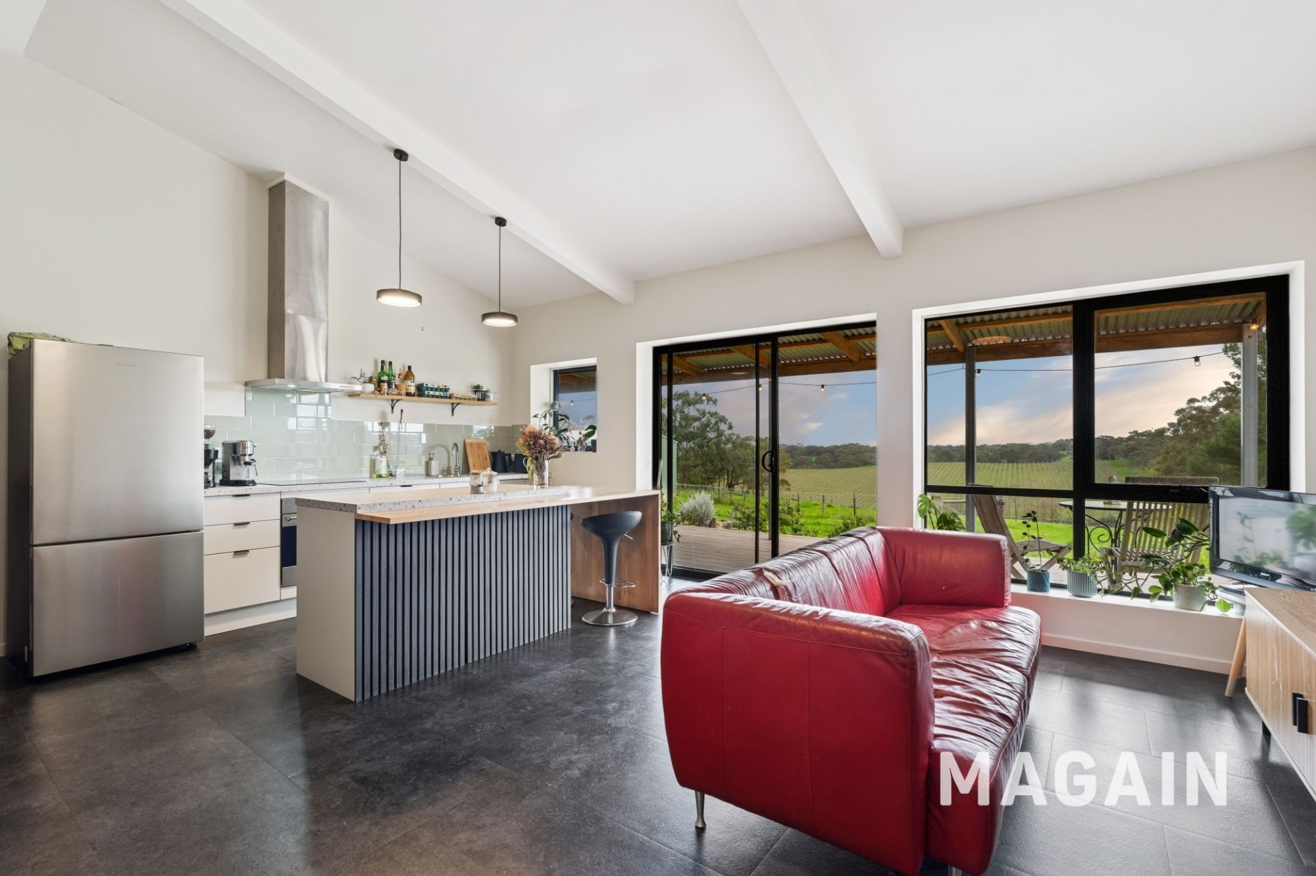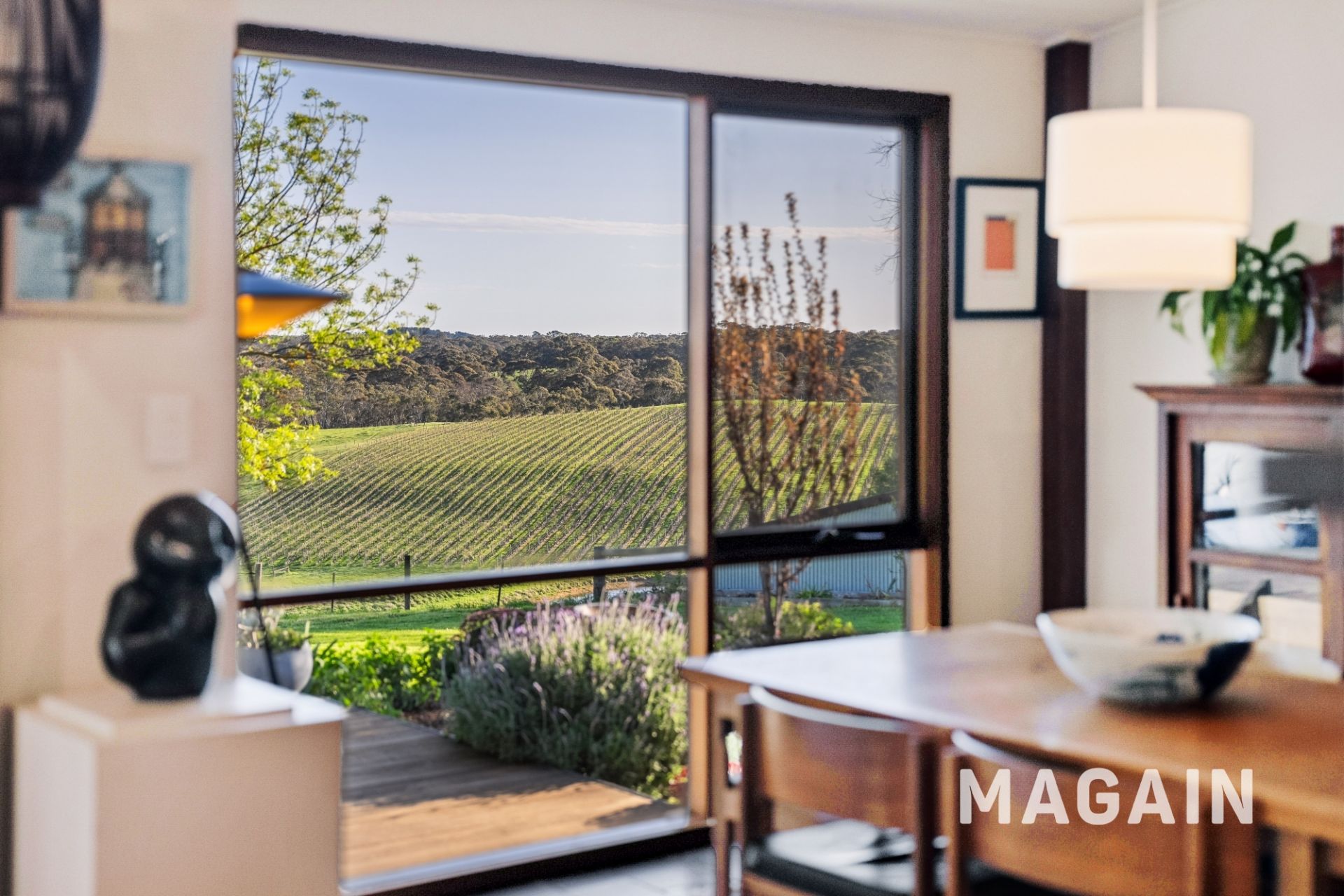 The home provides a flexible layout, offering three generously sized carpeted bedrooms and two additional offices, easily adapted into five bedrooms if required. The main suite features built-in robes with a large, stylish ensuite, while an additional two well-appointed bathrooms and a separate laundry ensure functionality for families of all sizes. Multiple living zones, including a lounge room, family room, and dining area flow effortlessly together. Quality appliances including a Smeg 900mm electric oven with six-burner gas cooktop, matching range hood, and a Miele dishwasher-ensuring cooking and entertaining are a pleasure while a butlers style pantry provides handy storage, preparation space and even a view! The kitchen/dining/living area is light filled and overlooks the beautiful rear garden and out over the vineyard and hills. Large sliding doors lead to the split level deck, the garden and another paved entertaining area under the Raywood Ash tree - so many areas to enjoy a glass of wine and the panoramic views.