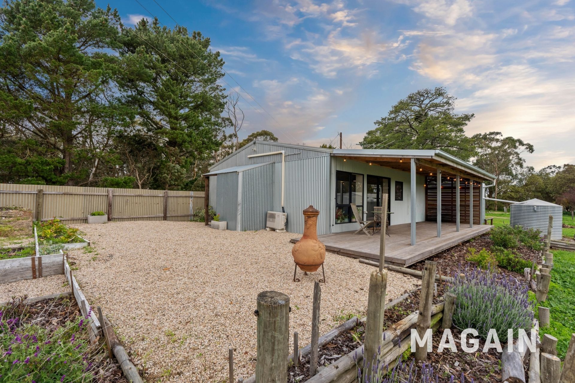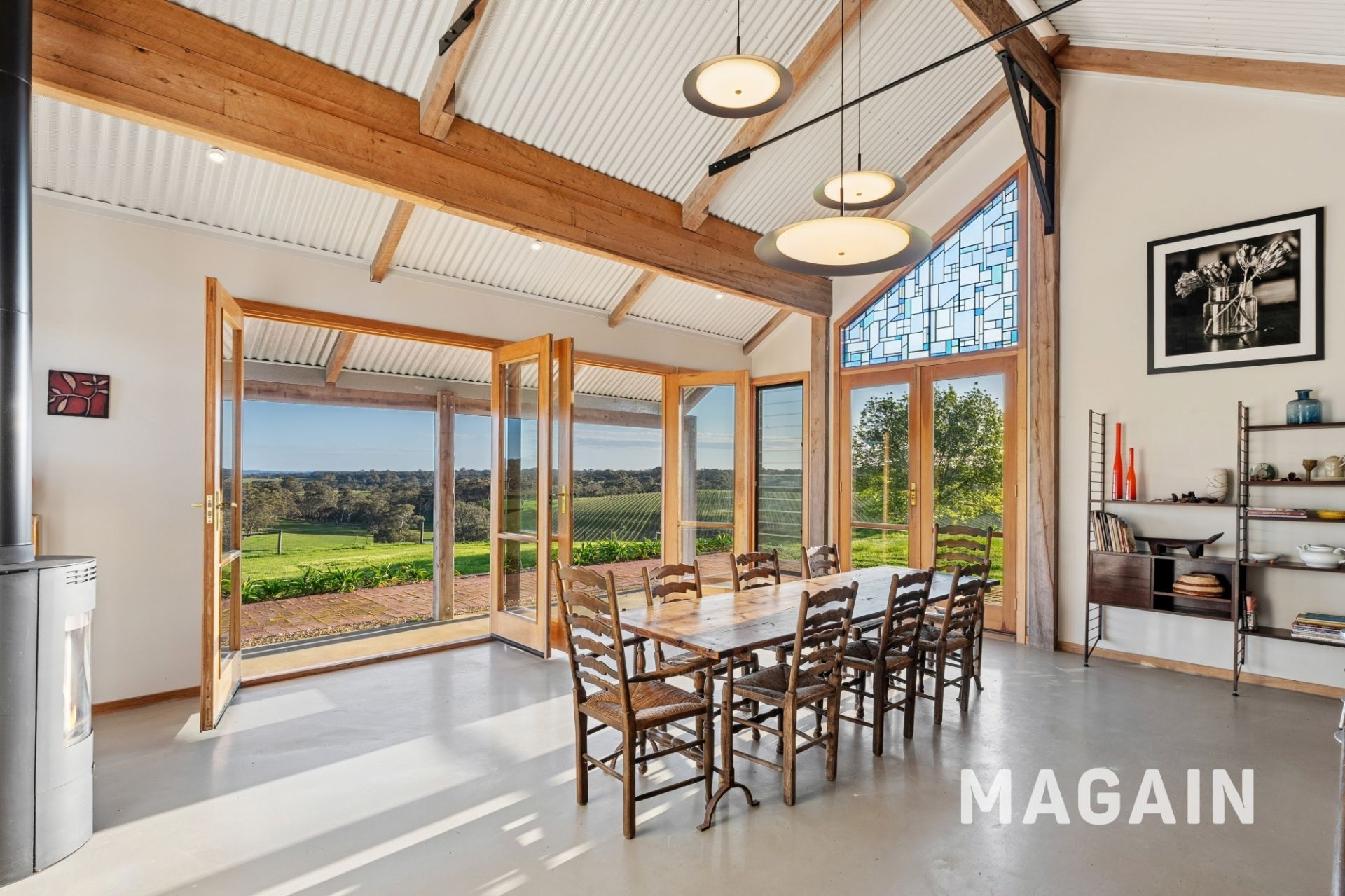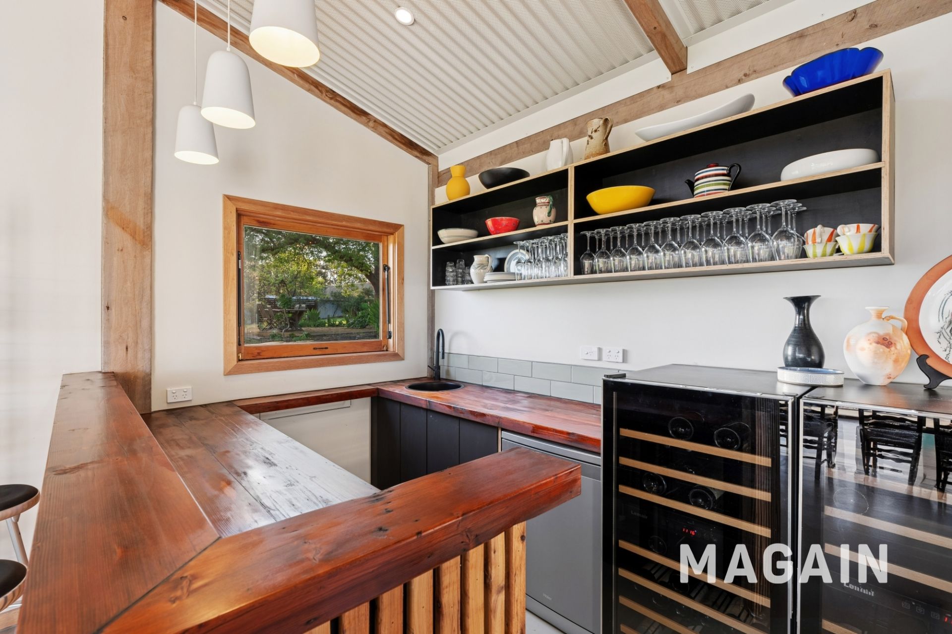 Thoughtfully positioned to the rear of the main homestead is the self-contained studio/event space. Built using corrugated iron and cypress pine, the space exudes a unique rustic charm, complemented by custom cypress pine feature walls, bespoke joinery, stained glass, and polished concrete flooring. The studio is ideal for a variety of uses - whether as a creative workspace, guest retreat, teenage haven, or even a potential income-generating option. A kitchenette with built-in bar fridge and pantry provides practical convenience, while a separate toilet is already in place, with easy plumbing provisions available for a future shower/bathroom extension if desired. The striking 4.8-metre raked acoustic ceiling, crafted in perforated corrugated iron, creates an impressive sense of space while offering both functionality and style.