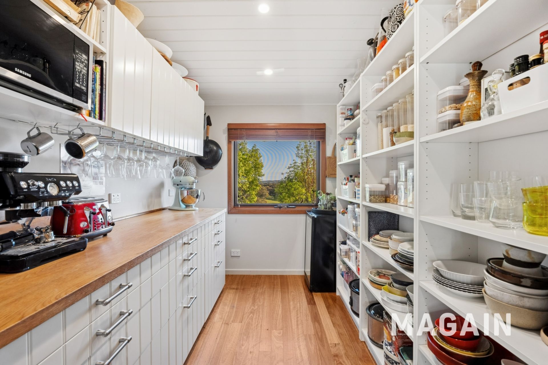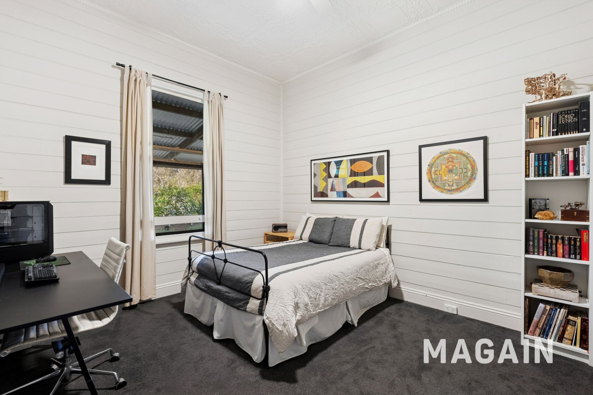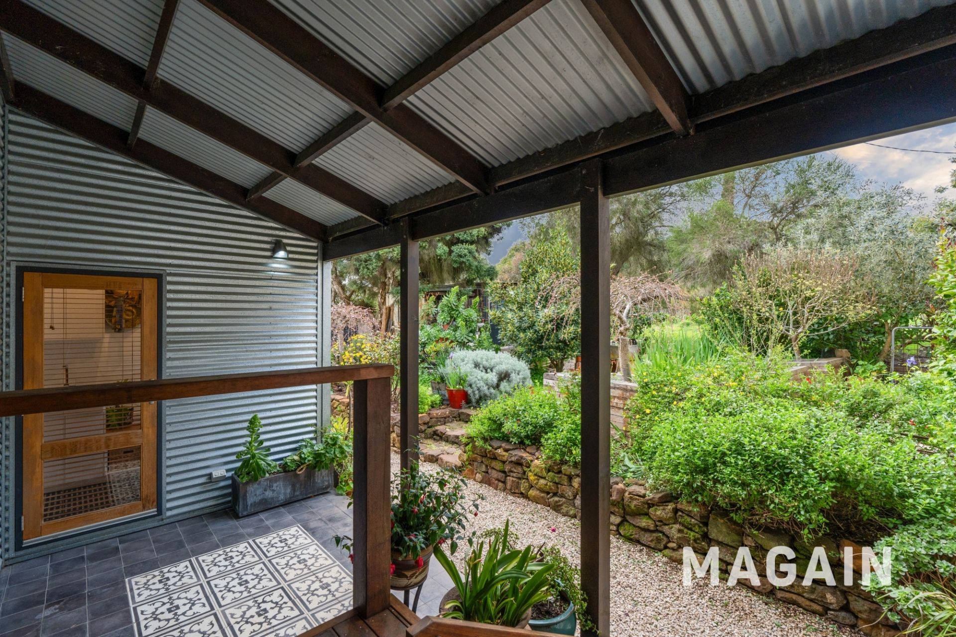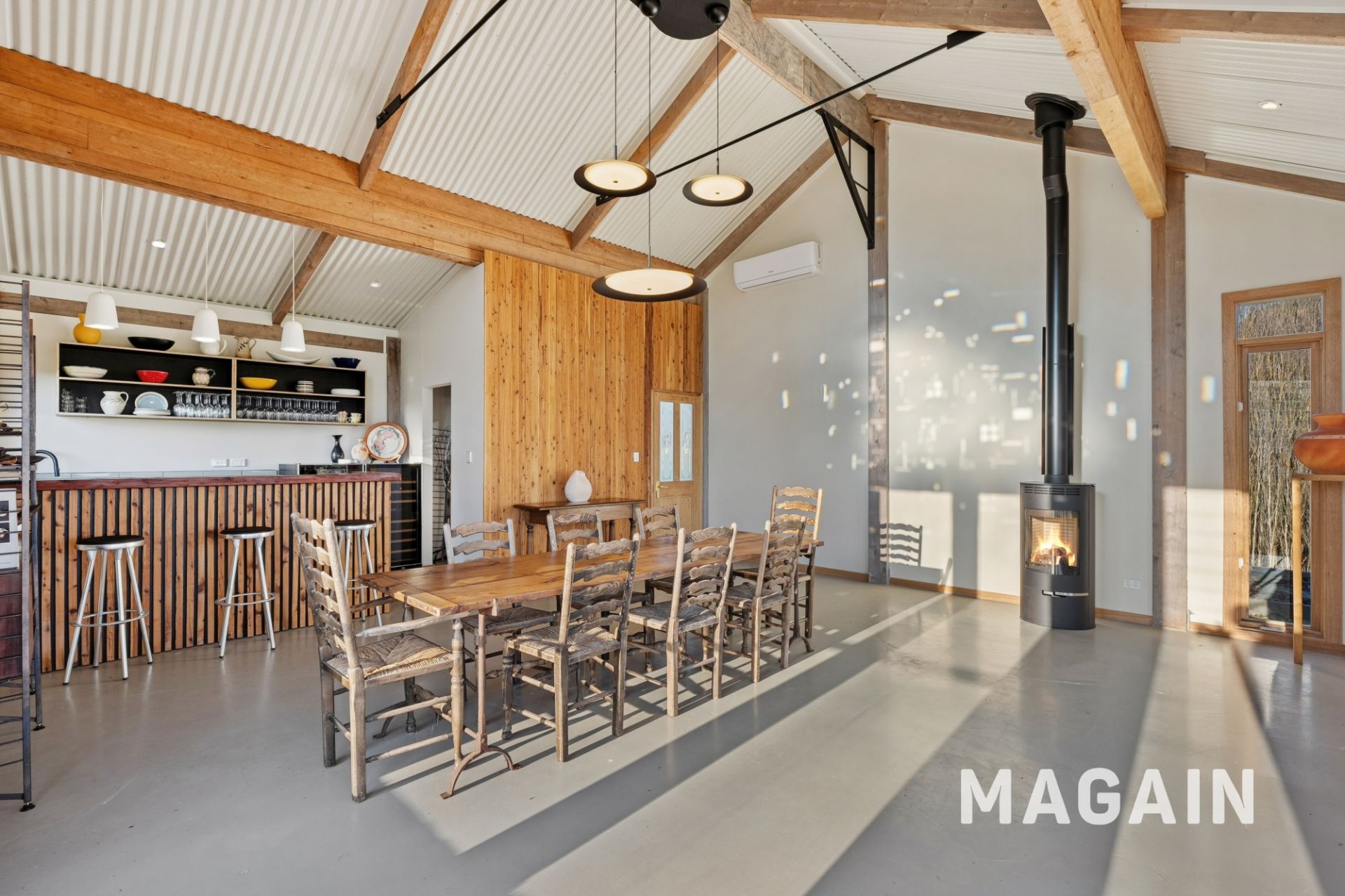 Thoughtfully positioned to the rear of the main homestead is the self-contained studio/event space. Built using corrugated iron and cypress pine, the space exudes a unique rustic charm, complemented by custom cypress pine feature walls, bespoke joinery, stained glass, and polished concrete flooring. The studio is ideal for a variety of uses - whether as a creative workspace, guest retreat, teenage haven, or even a potential income-generating option. A kitchenette with built-in bar fridge and pantry provides practical convenience, while a separate toilet is already in place, with easy plumbing provisions available for a future shower/bathroom extension if desired. The striking 4.8-metre raked acoustic ceiling, crafted in perforated corrugated iron, creates an impressive sense of space while offering both functionality and style.