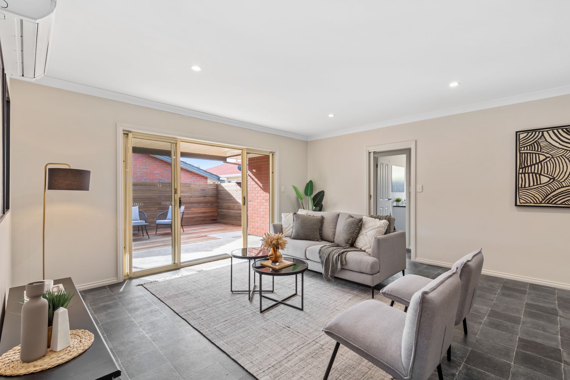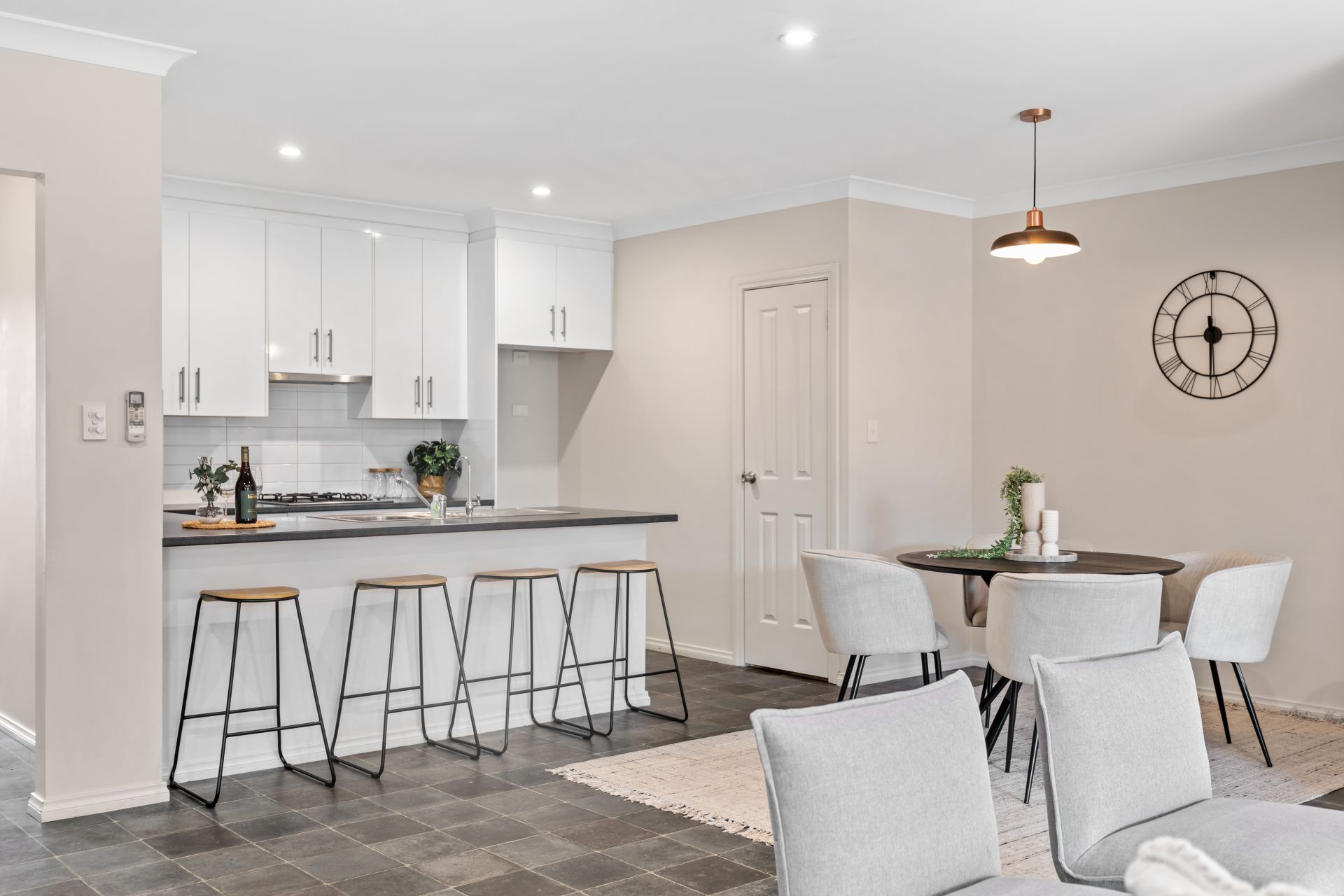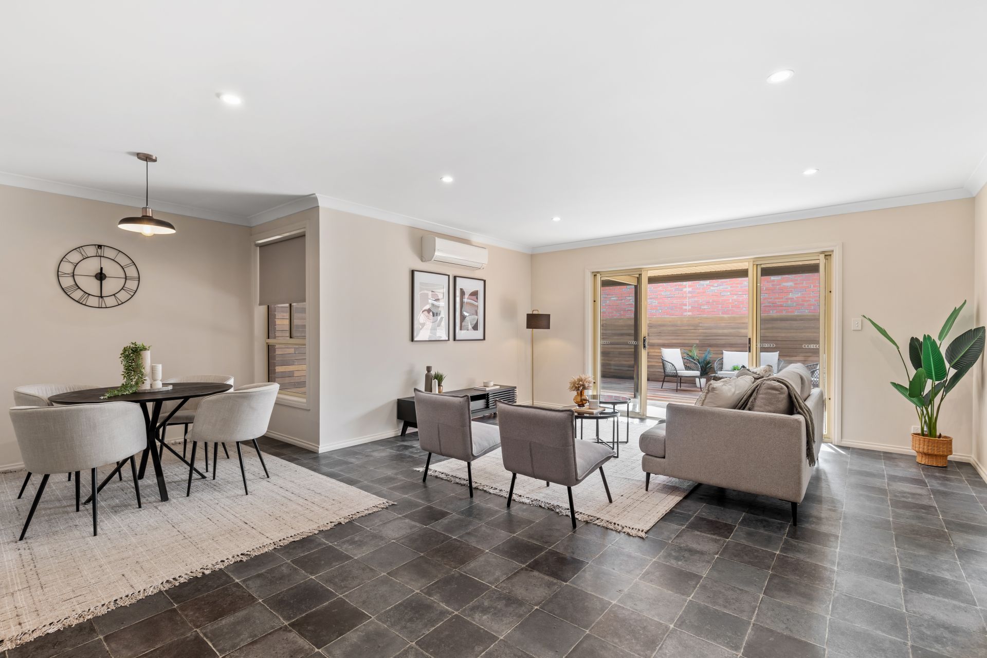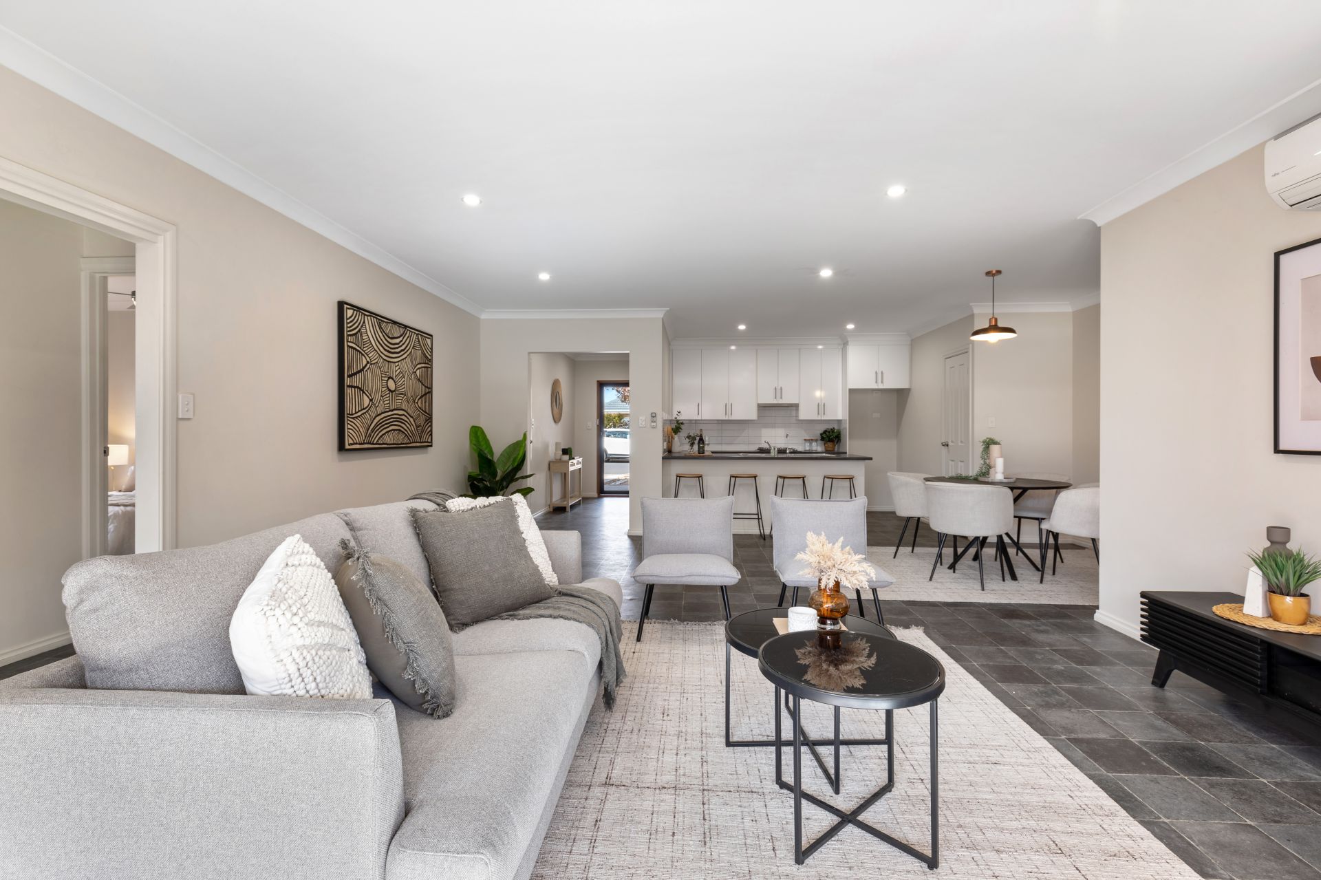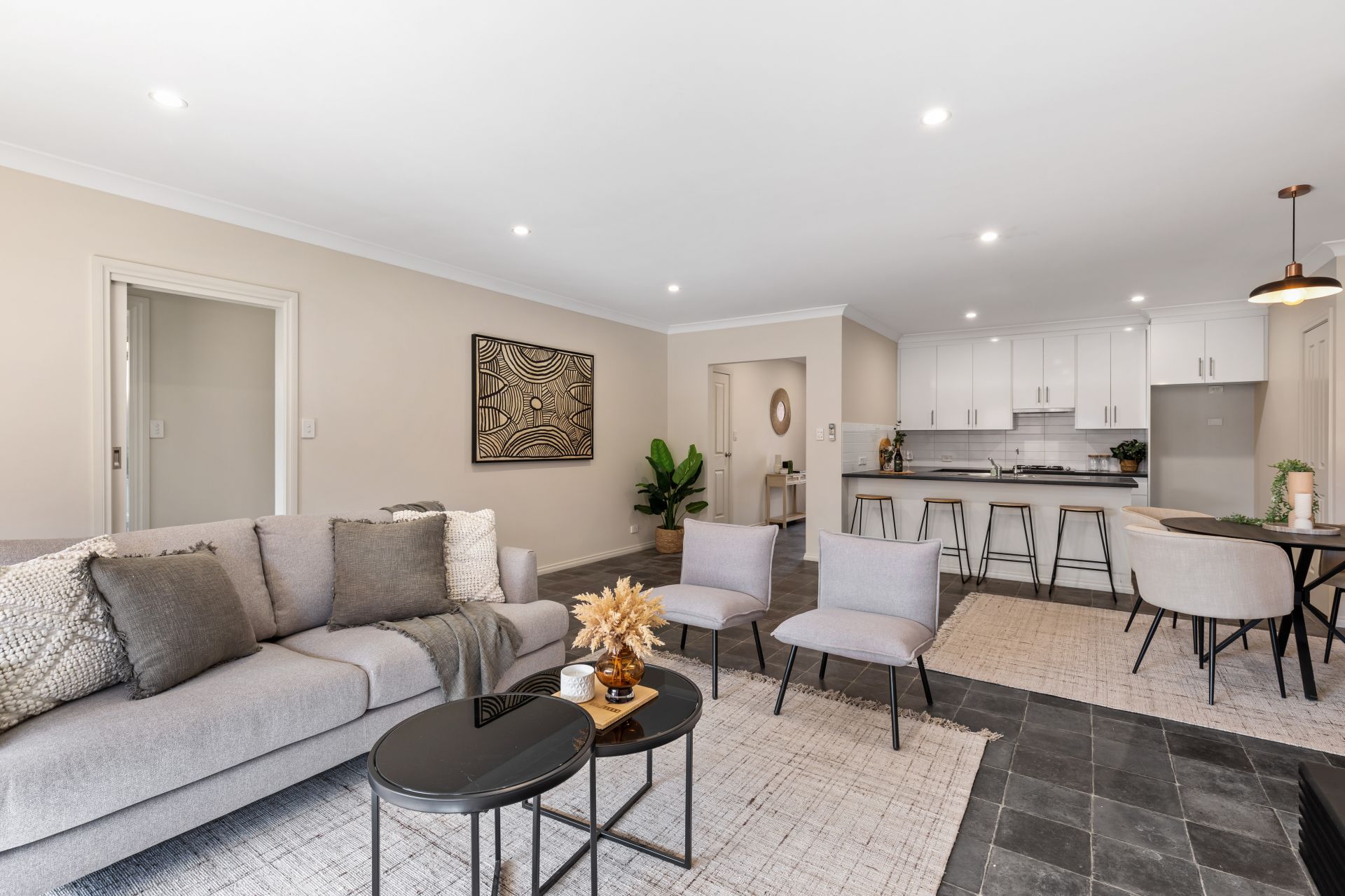 - Tiled open plan living.