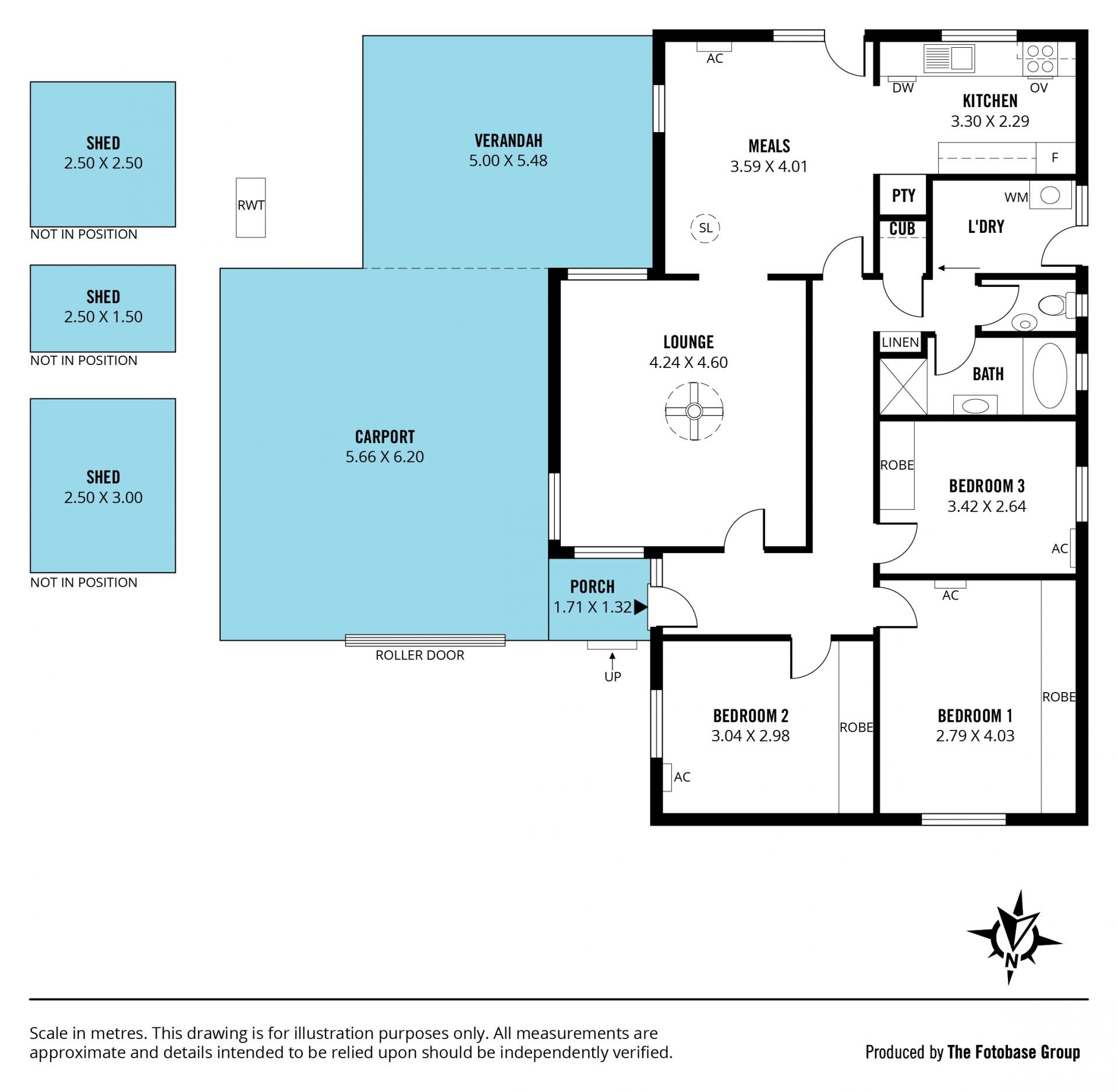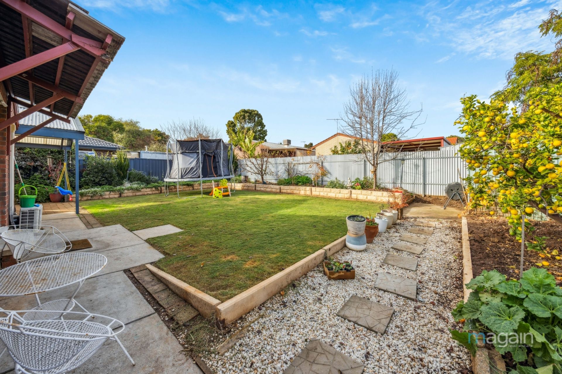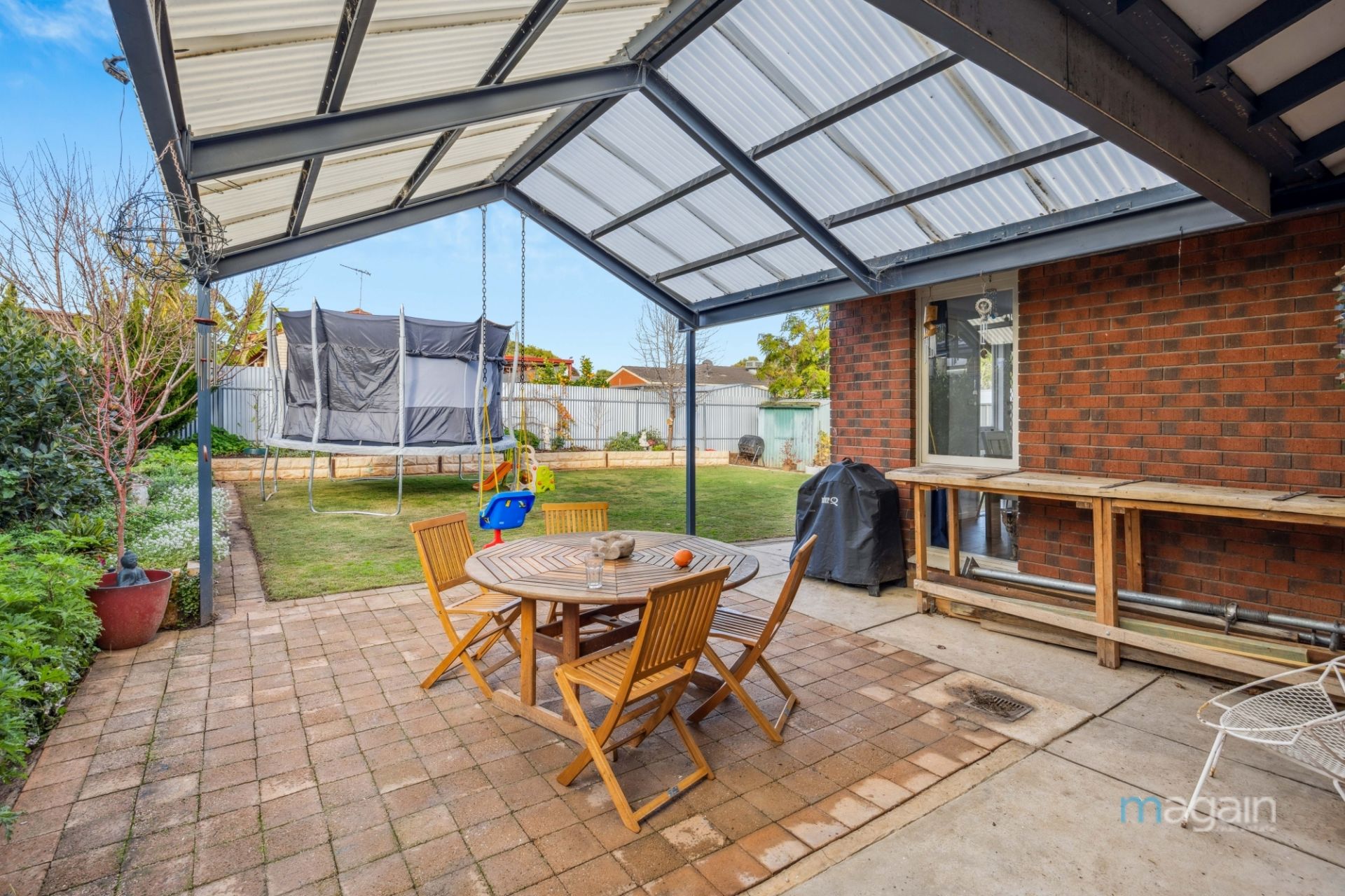 Step outside from the dining area into a low-maintenance backyard featuring a paved entertainment space under a pitched pergola, perfect for relaxation and outdoor gatherings. The yard includes a generous lawn area, mature fruit trees, and three tool sheds.