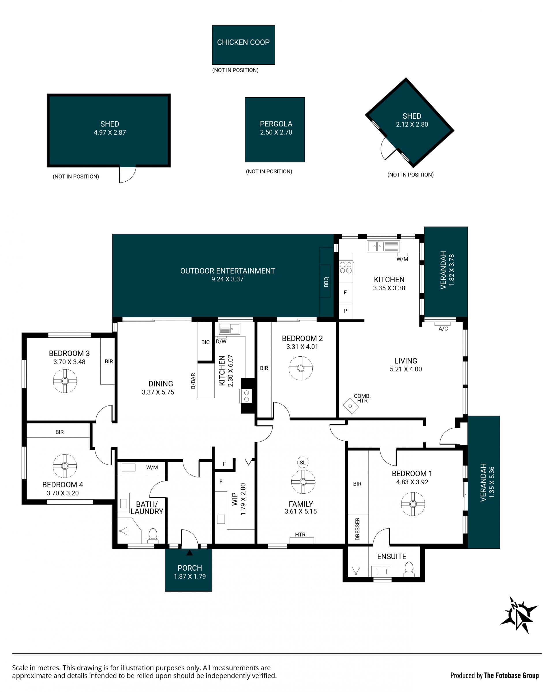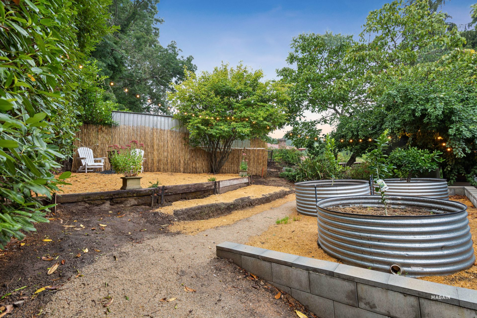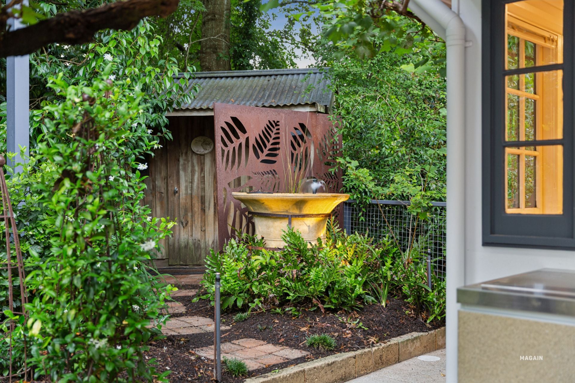 Meandering pathways lead to a modest lawn area, a workshop/garden shed with power and a concrete floor, a chicken coop with two egg laying hens (hens are included), a potting shed, veggie gardens and a cosy fire pit.