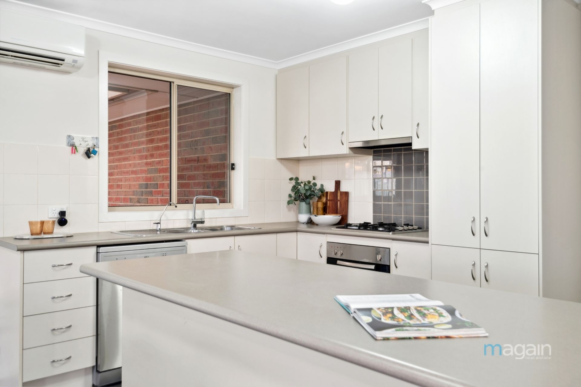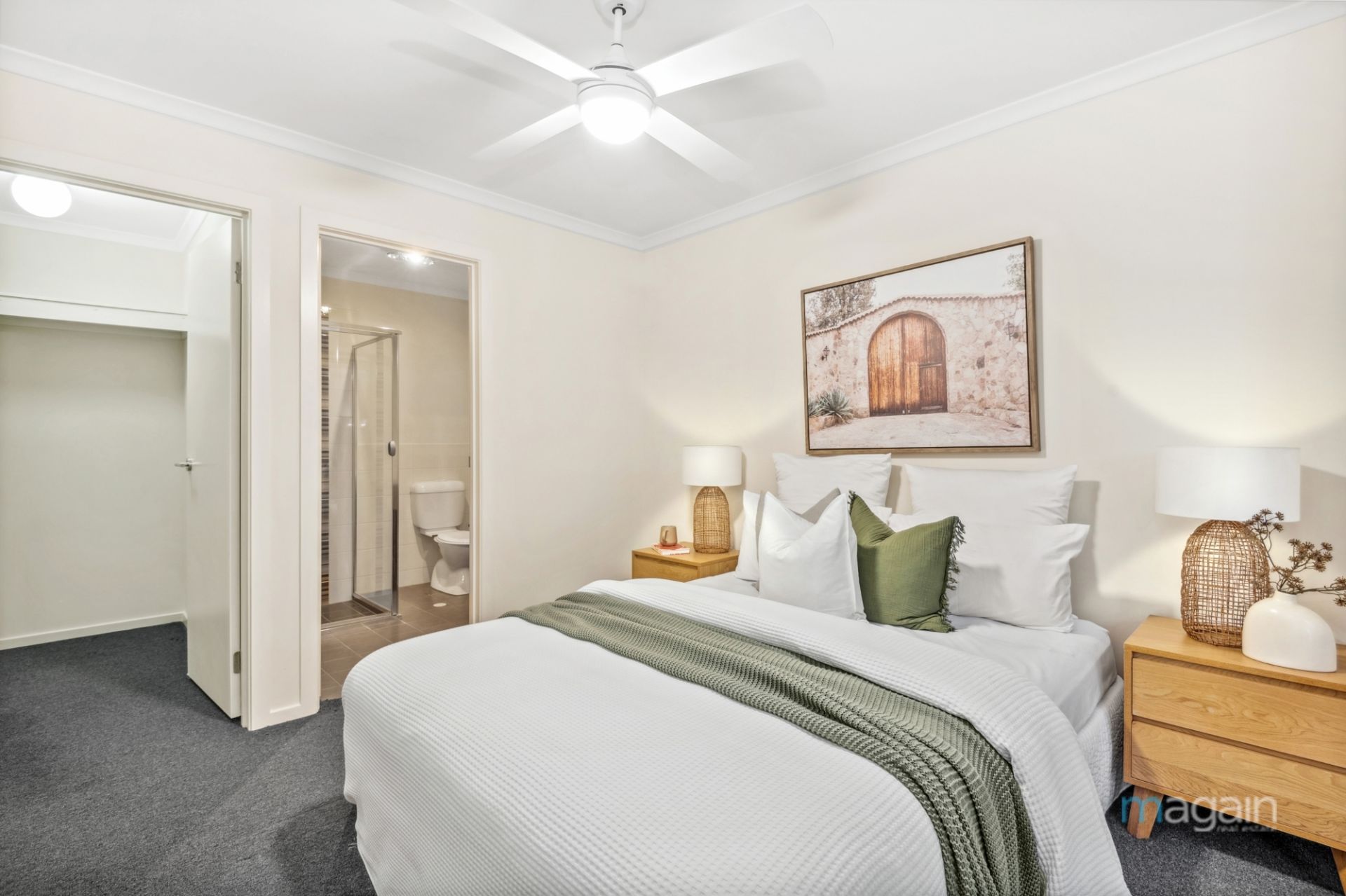This thoughtfully designed home boasts three spacious bedrooms, each complete with roller shutters for privacy and ceiling fans for year-round comfort. The main bedroom, located at the front of the home, offers a peaceful retreat with a walk-in robe and its own ensuite bathroom. Bedrooms 2 and 3 feature large mirrored built-in robes, offering ample storage for growing families.