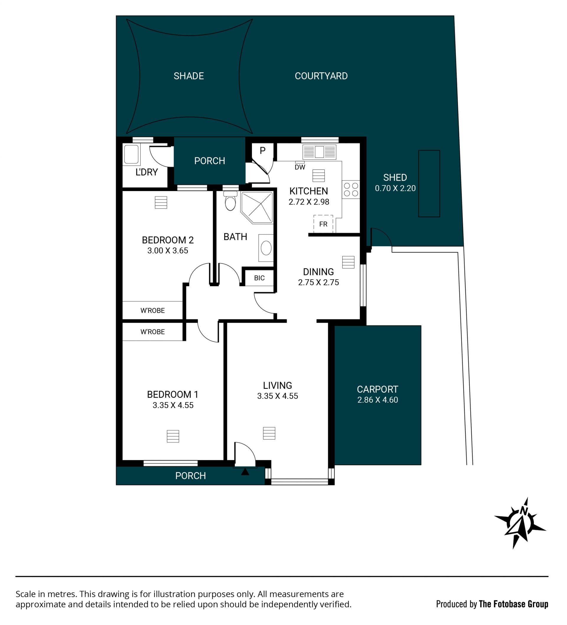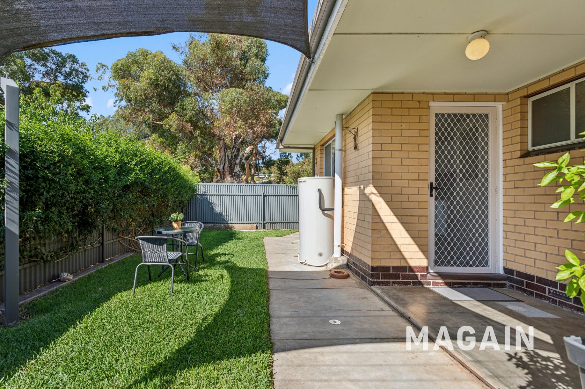Outside, you'll find a neat and private lawn area, partially covered by a shade cloth, ideal for enjoying some fresh air or low-maintenance gardening, along with a handy tool shed for additional storage. A single carport provides off-street parking.