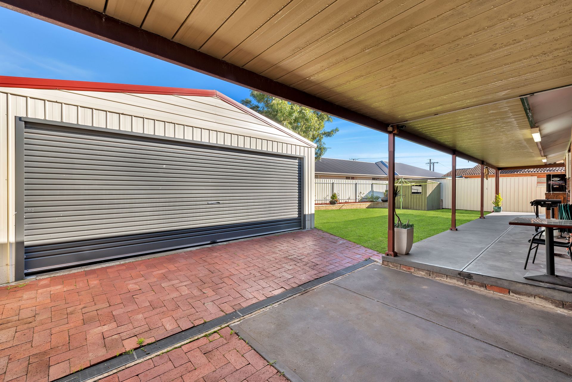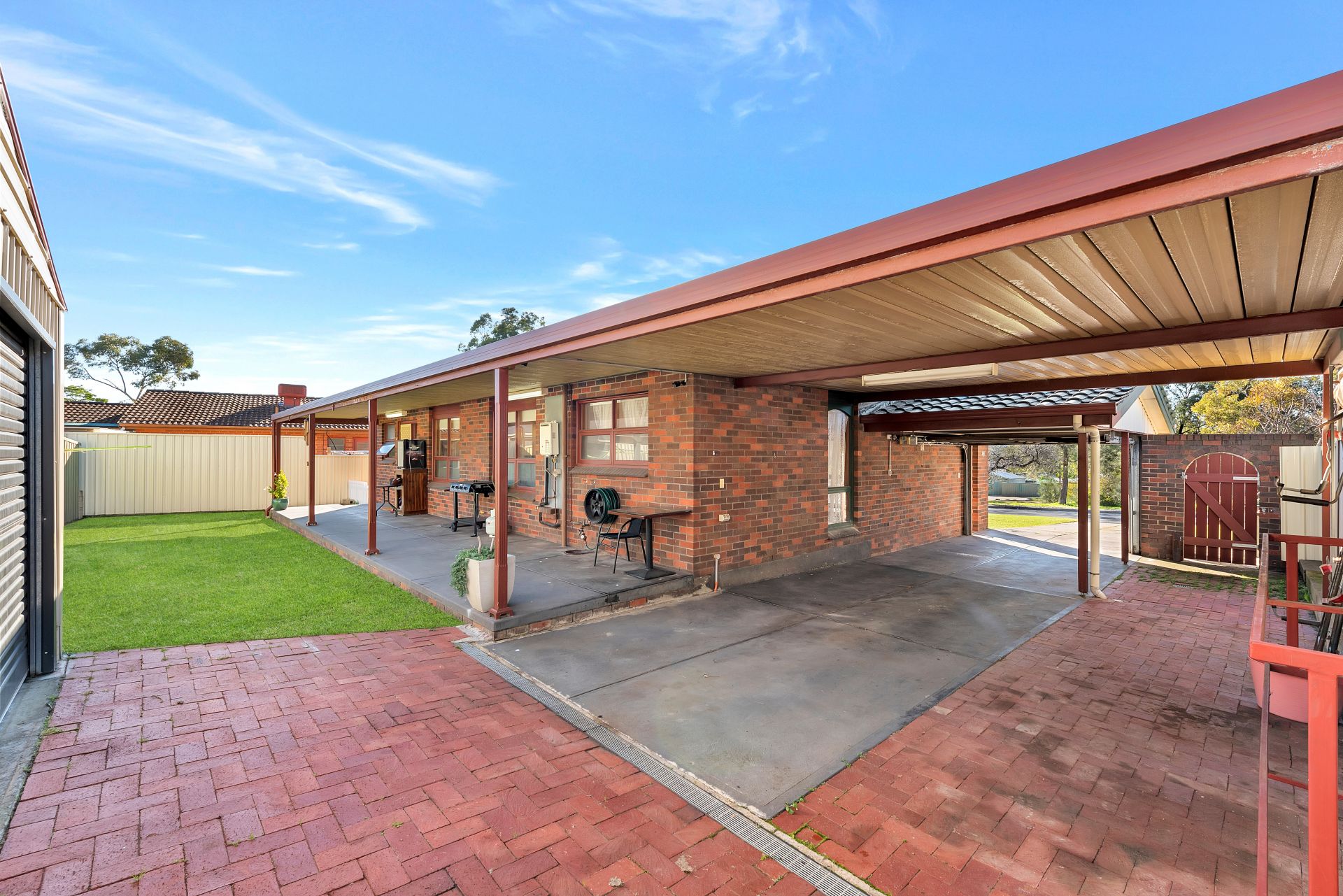 Large carports providing ample undercover parking for multiple vehicles with drive through access to large double shed for further secure parking or storage.