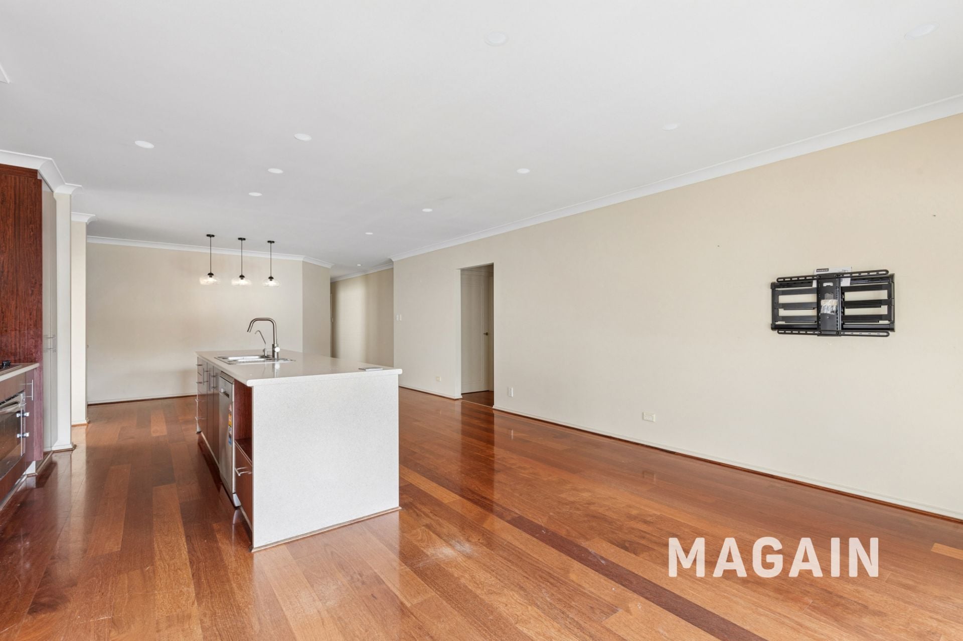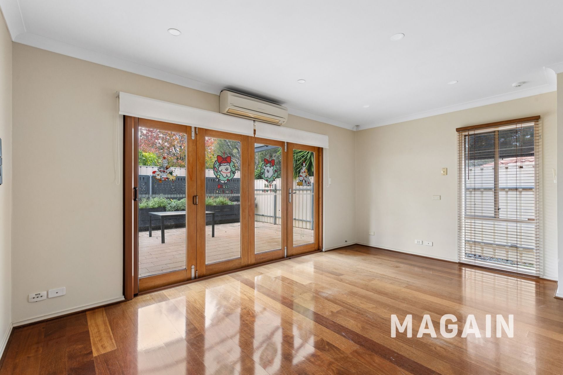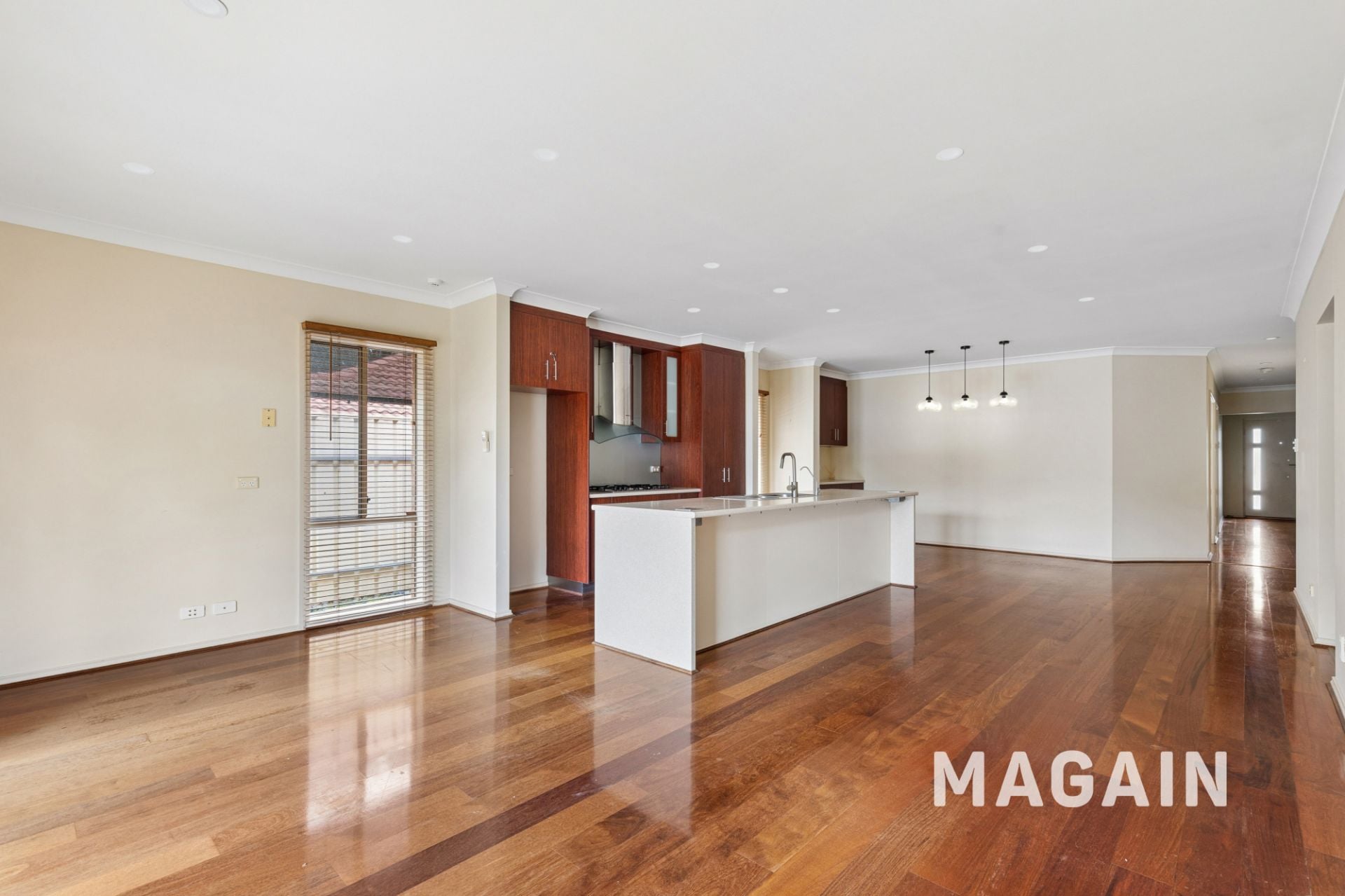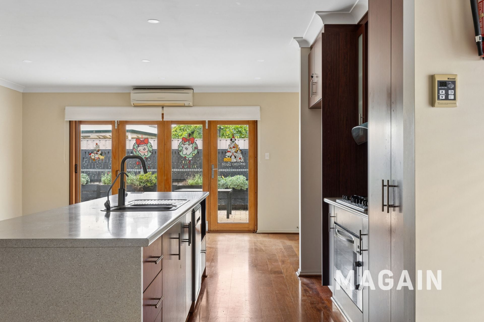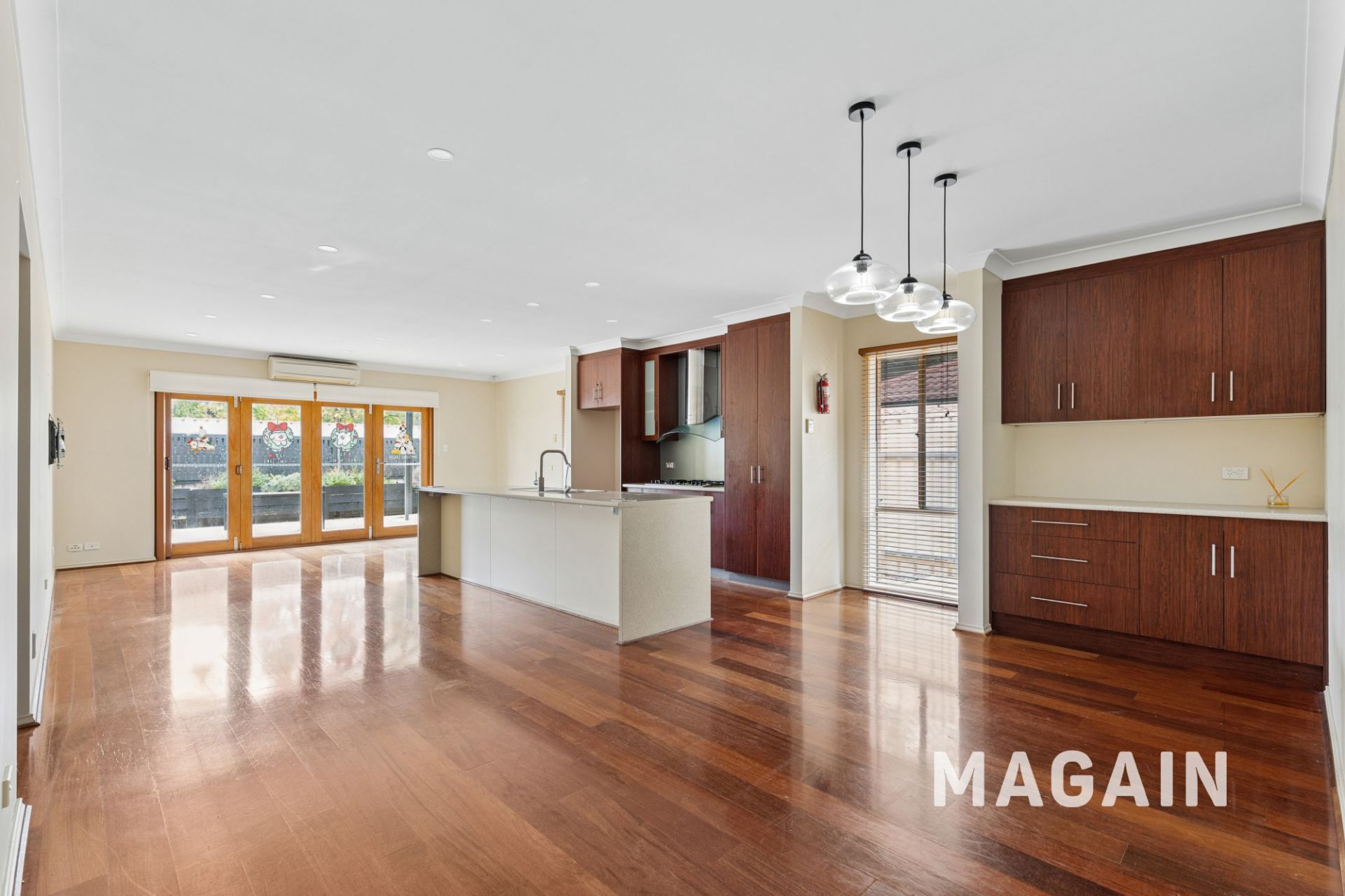 > Open plan kitchen, dining and living rooms with split system