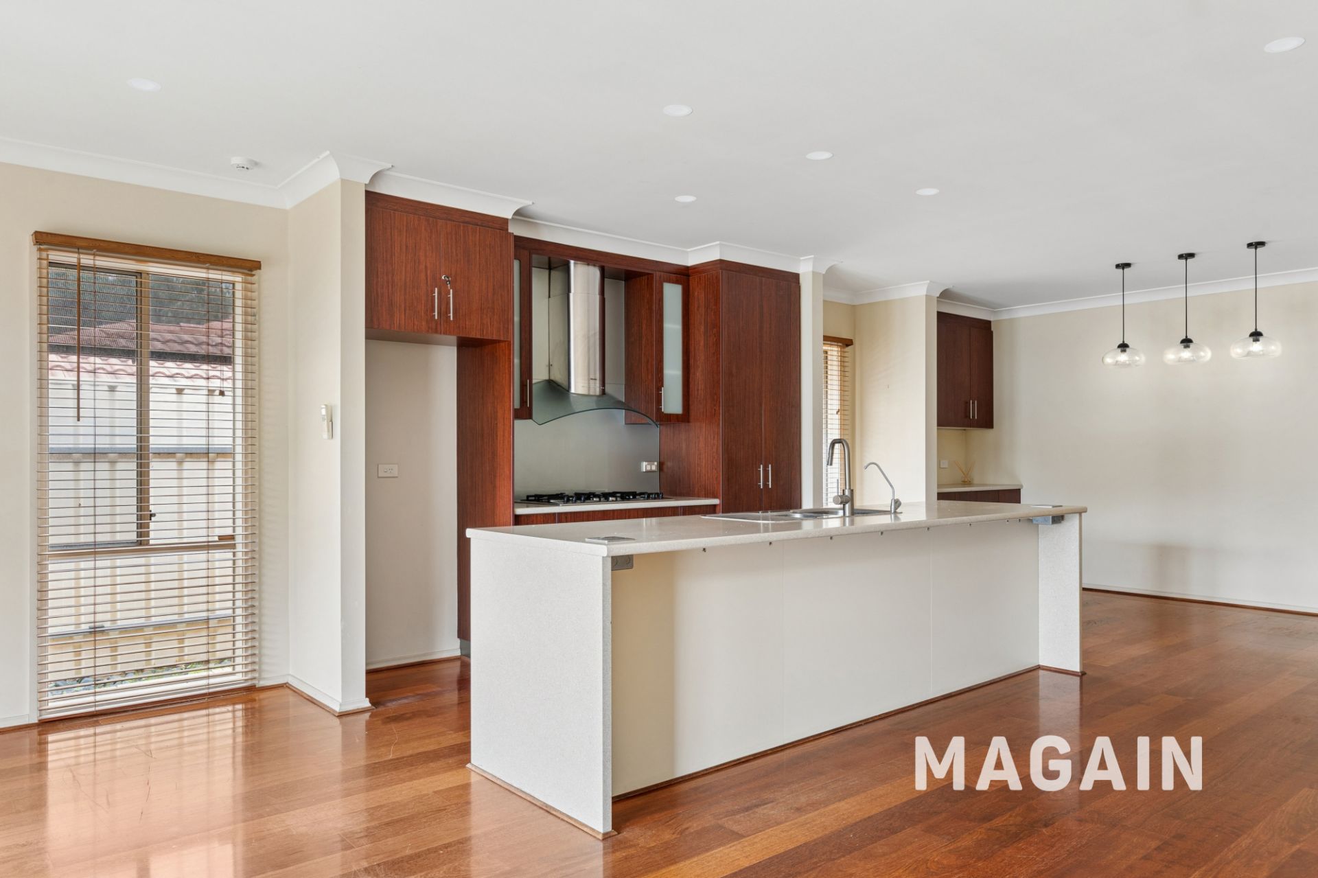 > Modern kitchen with dish washer, gas cook top and breakfast bar
