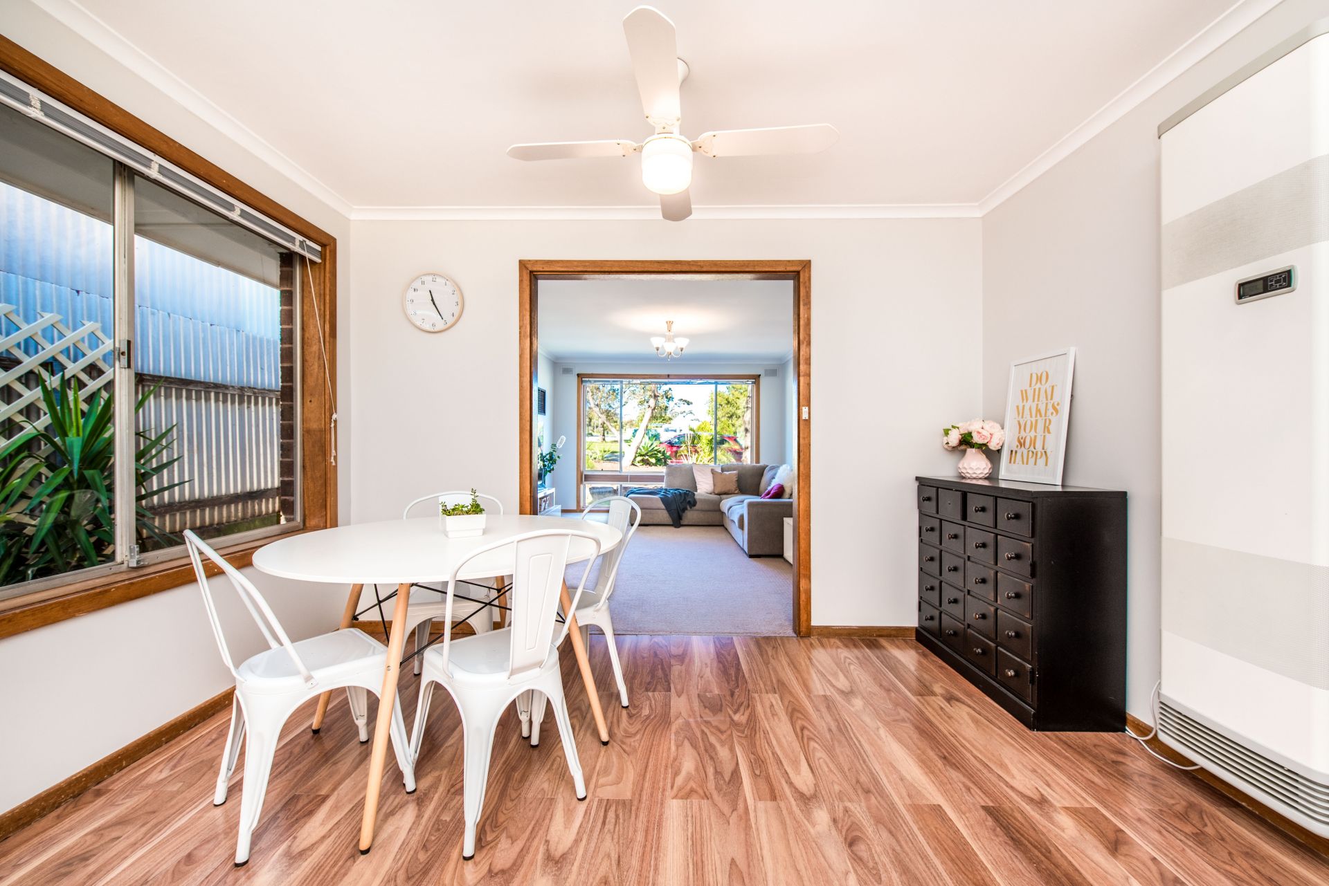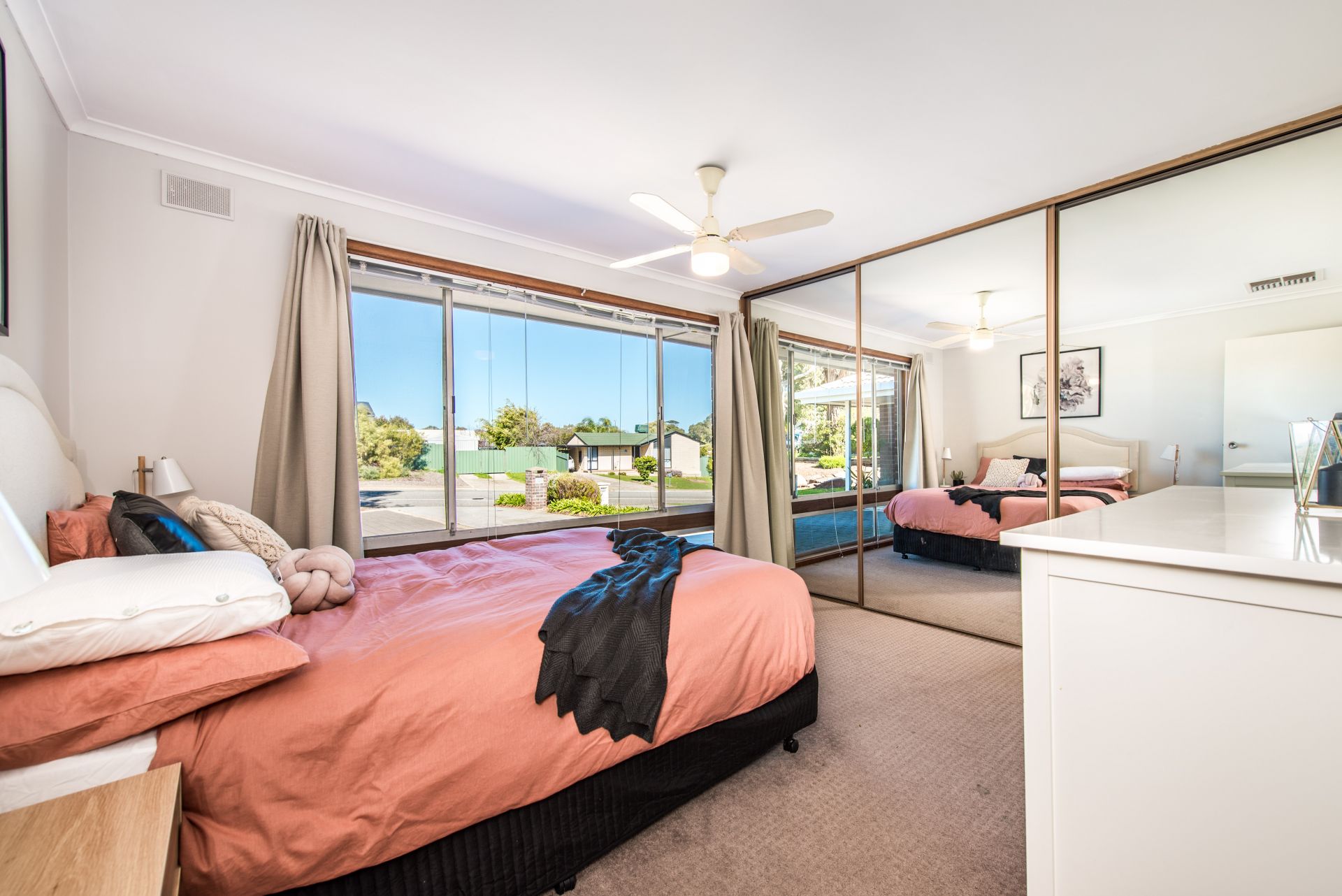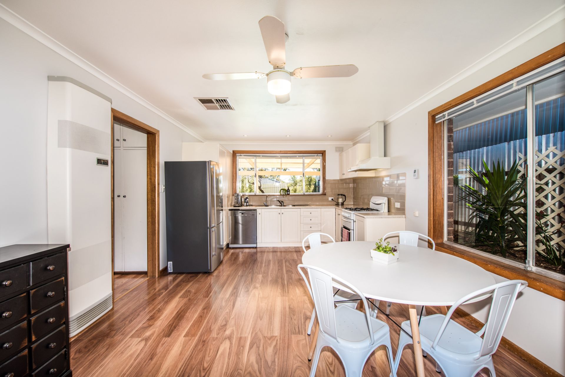 Stepping onto the property there is ample car parking space for the busy household. Moving inside and into a large entry hall are beautiful floorboards throughout. Complete with three good sized bedrooms, the master bedroom has floor to ceiling mirrored built in robes and a ceiling fan for comfort. Bedroom two and three both offer floor to ceiling built in robes and ceiling fans for temperature control on those warm summer nights. Each room has a beautiful big window allowing natural light to pour in! the abundance of natural light creates a sense of calm and serenity, sit back and enjoy nature from your very own bedroom.