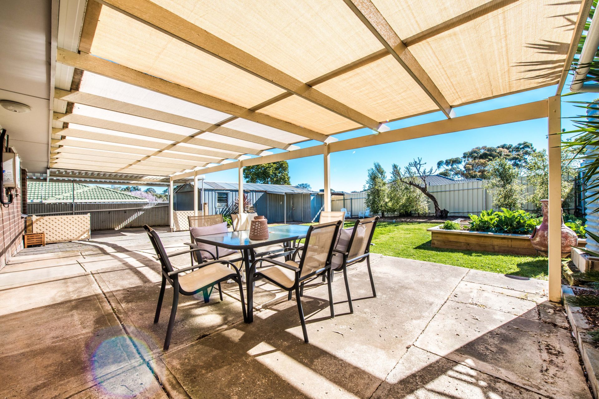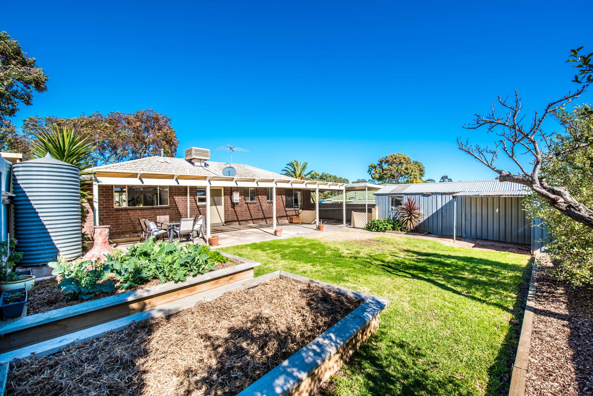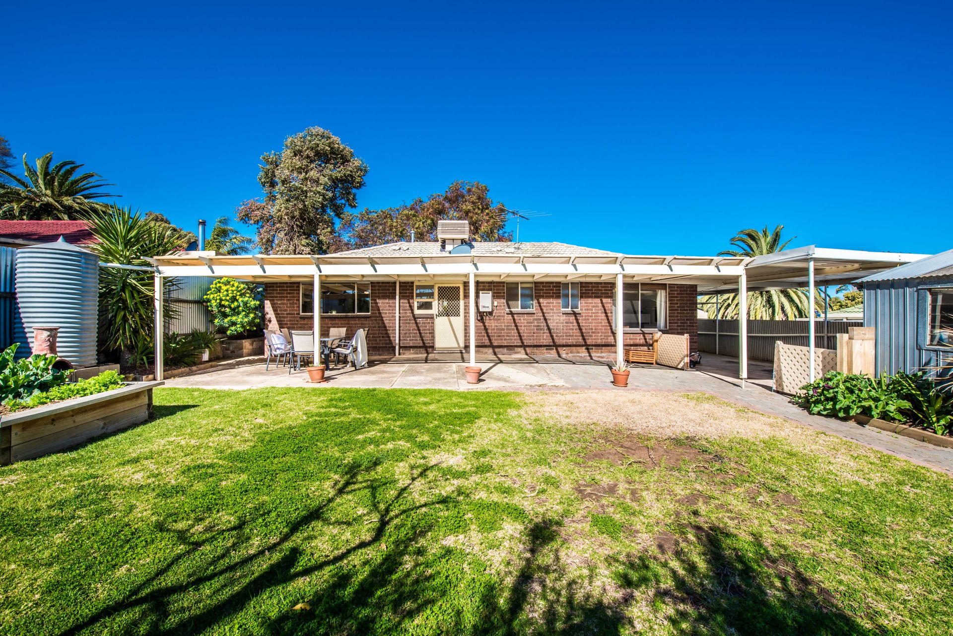 Outside is a great backyard for the whole family to enjoy. A huge entertaining area provides ample space for an outdoor table setting, seating and the trusty bbq. A grassed area is great for the kids to run around and explore. There are two raised planter boxes perfect for getting the kids involved in growing their own veggies for a roast dinner. For the parents there is drive through carport access to a garage and separate store shed, perfect for all the tools and toys.