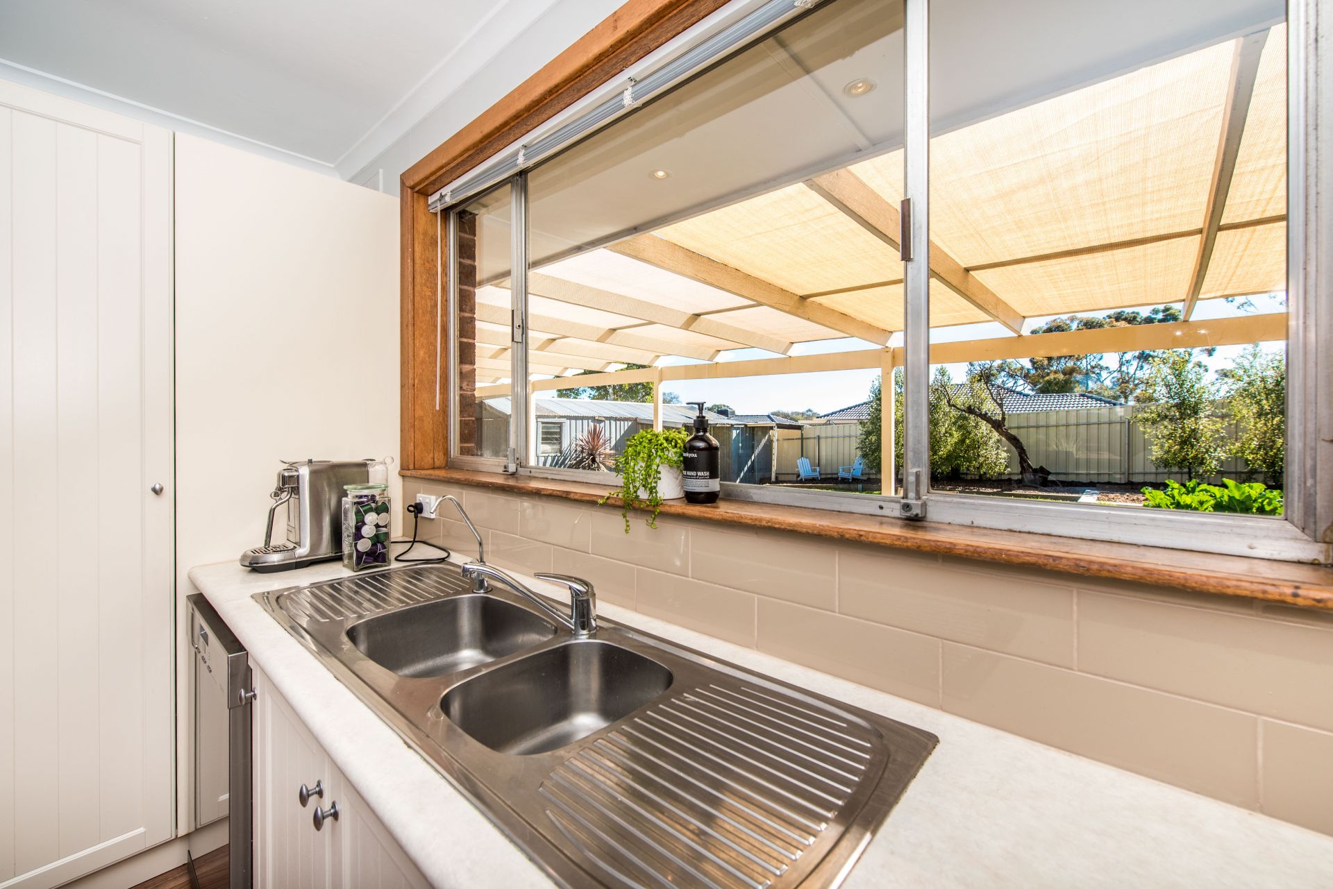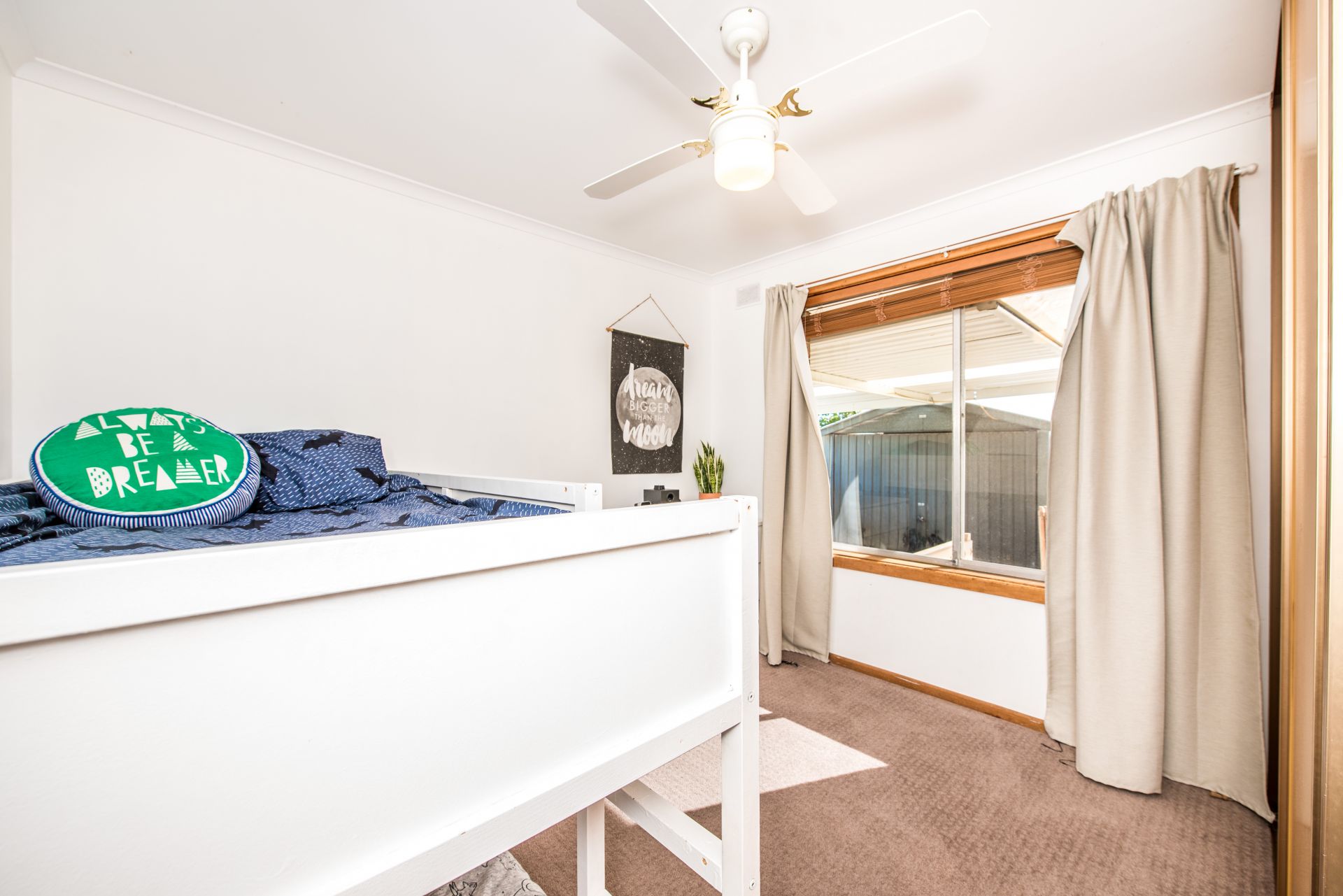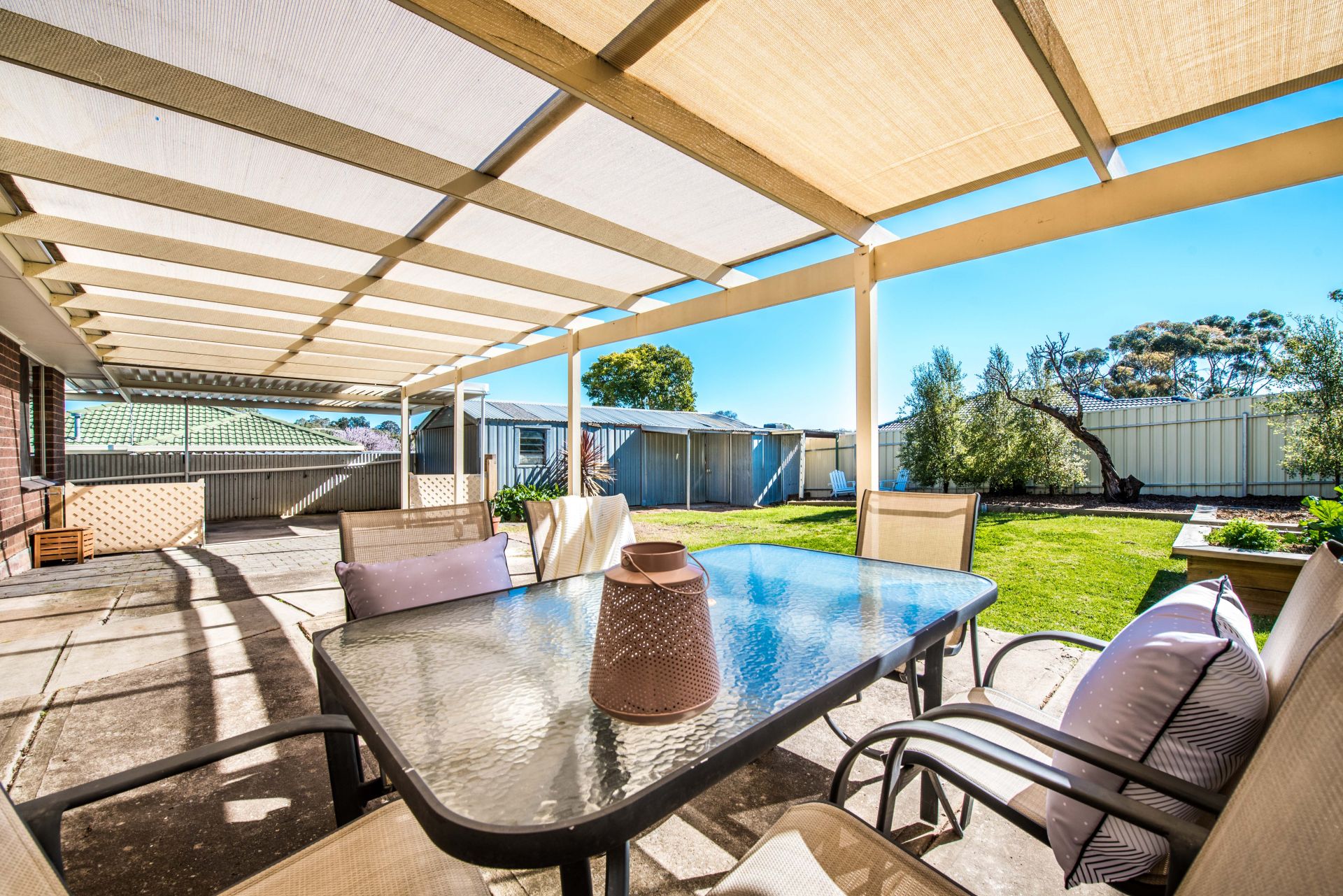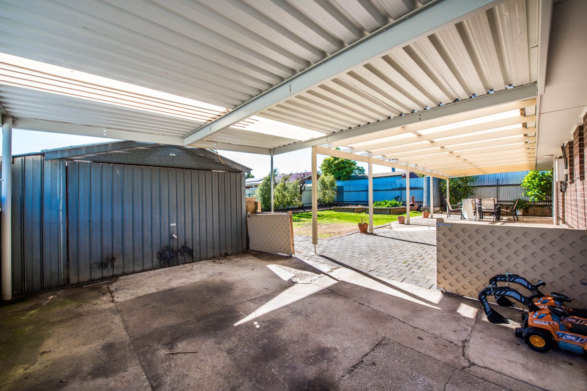 Outside is a great backyard for the whole family to enjoy. A huge entertaining area provides ample space for an outdoor table setting, seating and the trusty bbq. A grassed area is great for the kids to run around and explore. There are two raised planter boxes perfect for getting the kids involved in growing their own veggies for a roast dinner. For the parents there is drive through carport access to a garage and separate store shed, perfect for all the tools and toys.