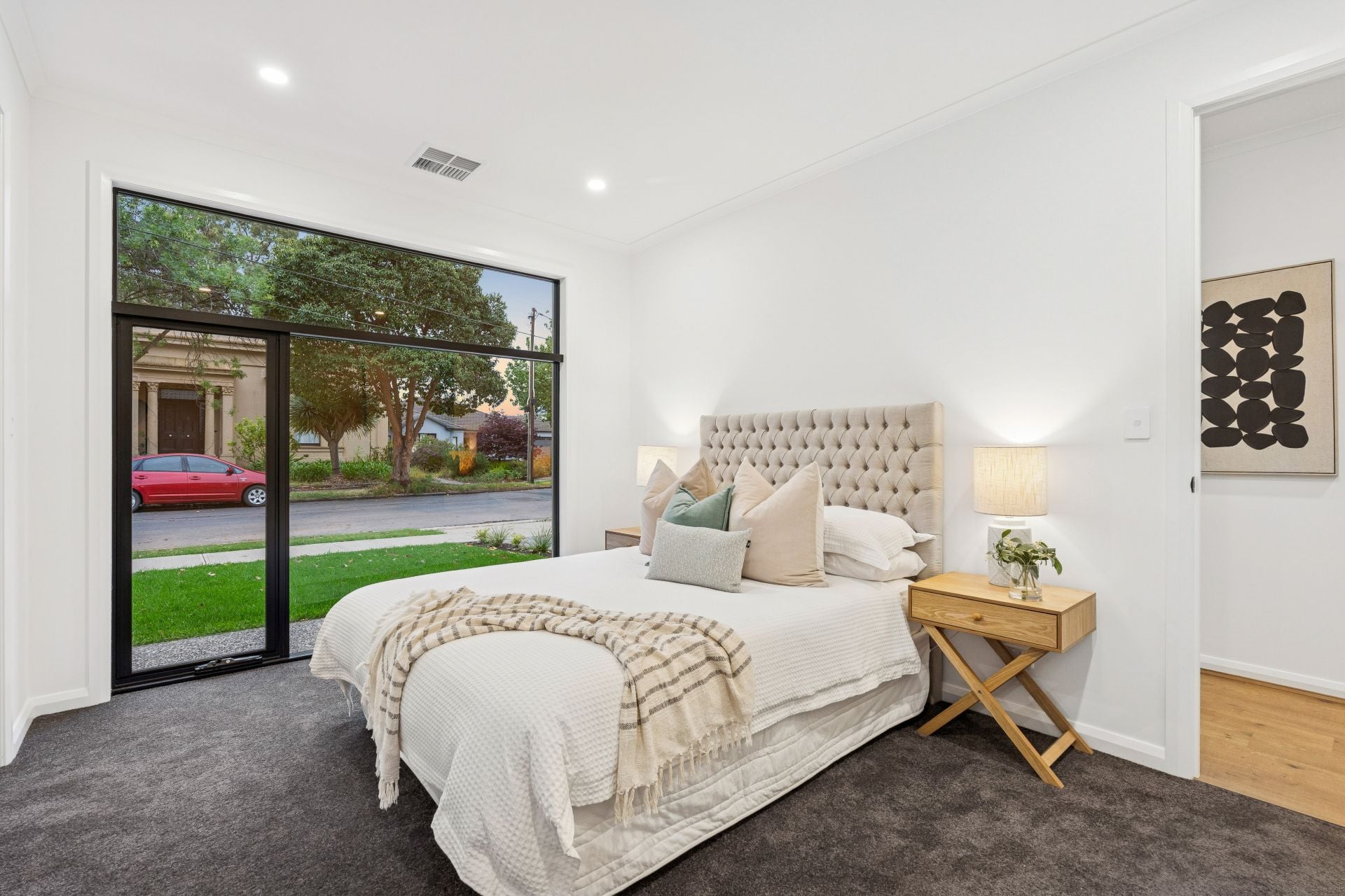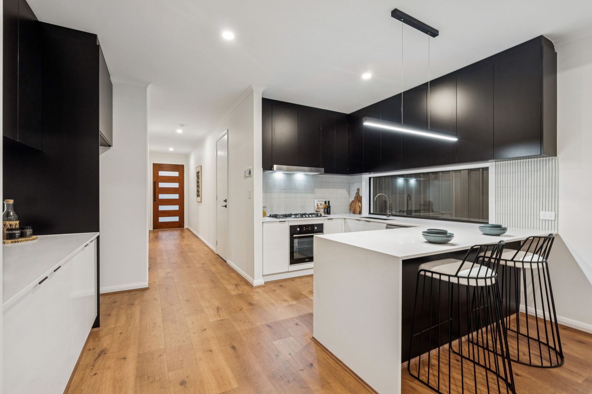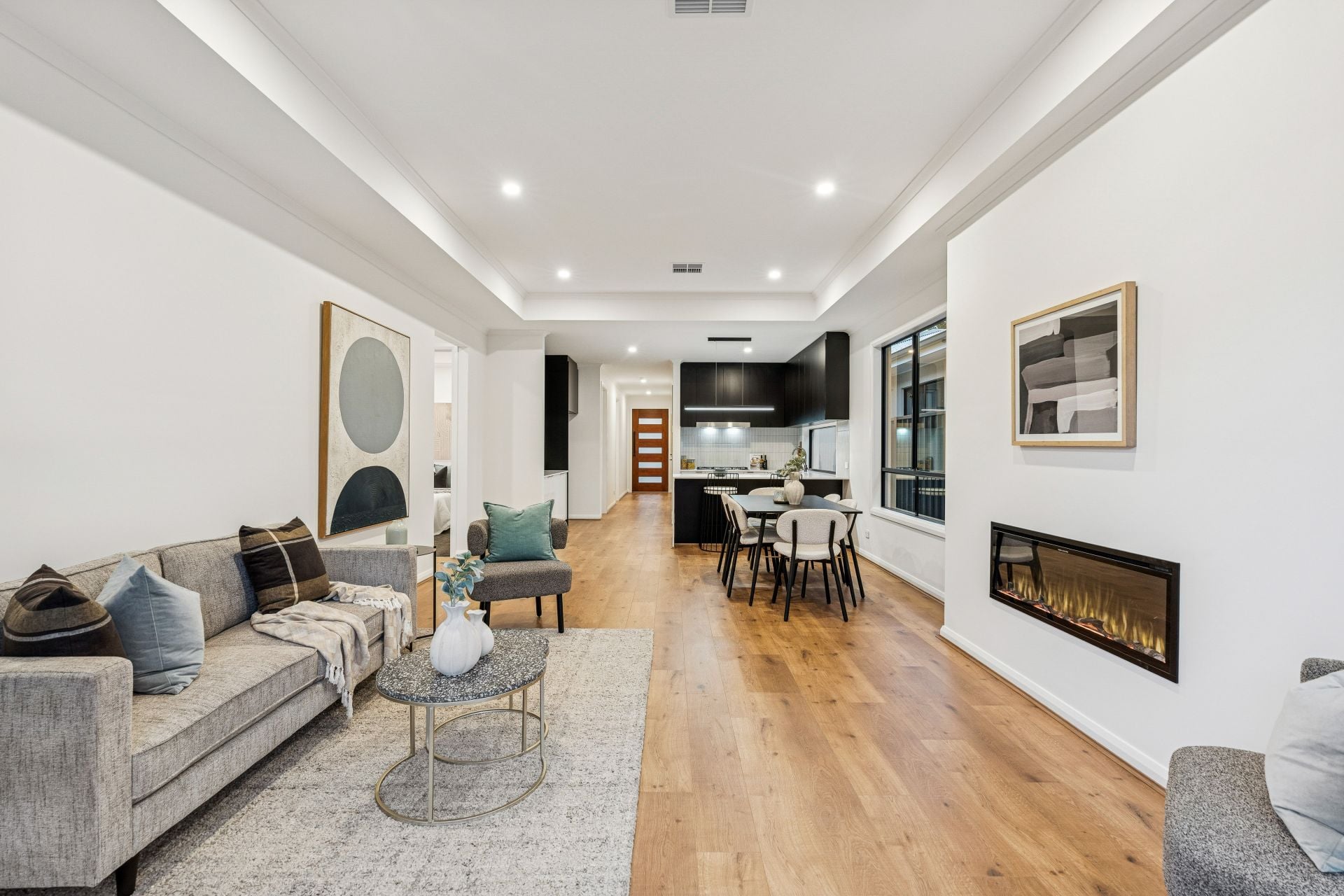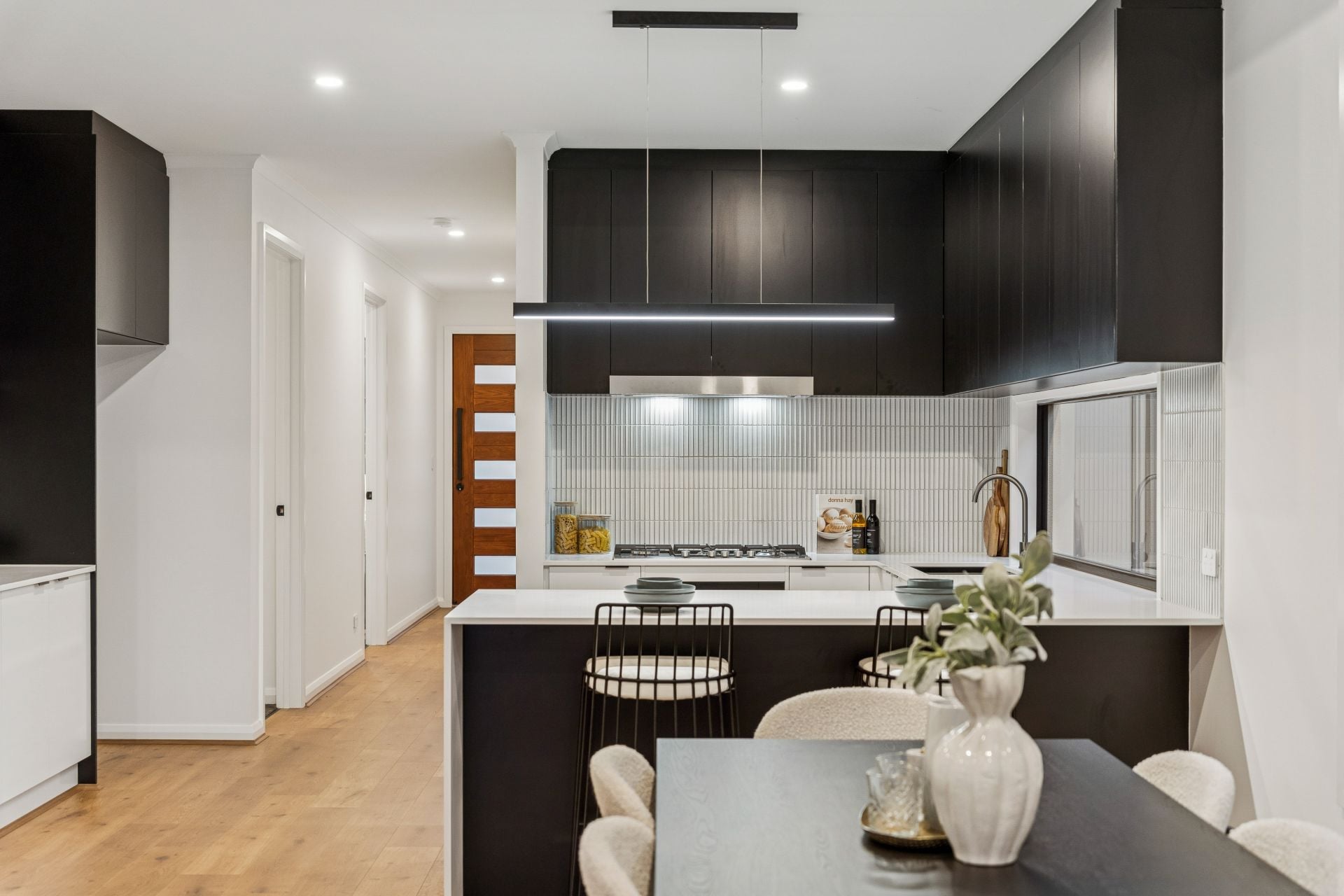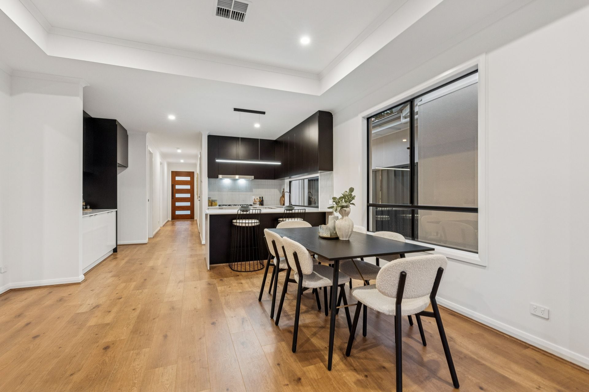 As you enter through the porch and into the hallway, you're greeted by fresh neutral tones, high ceilings, and an array of downlights that set the tone for the refined ambiance throughout the home.