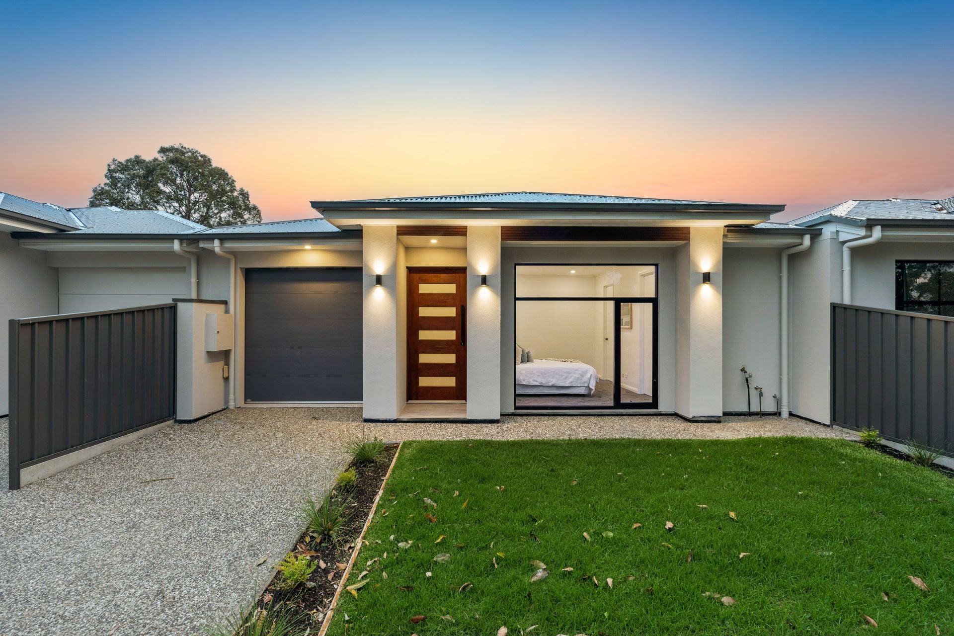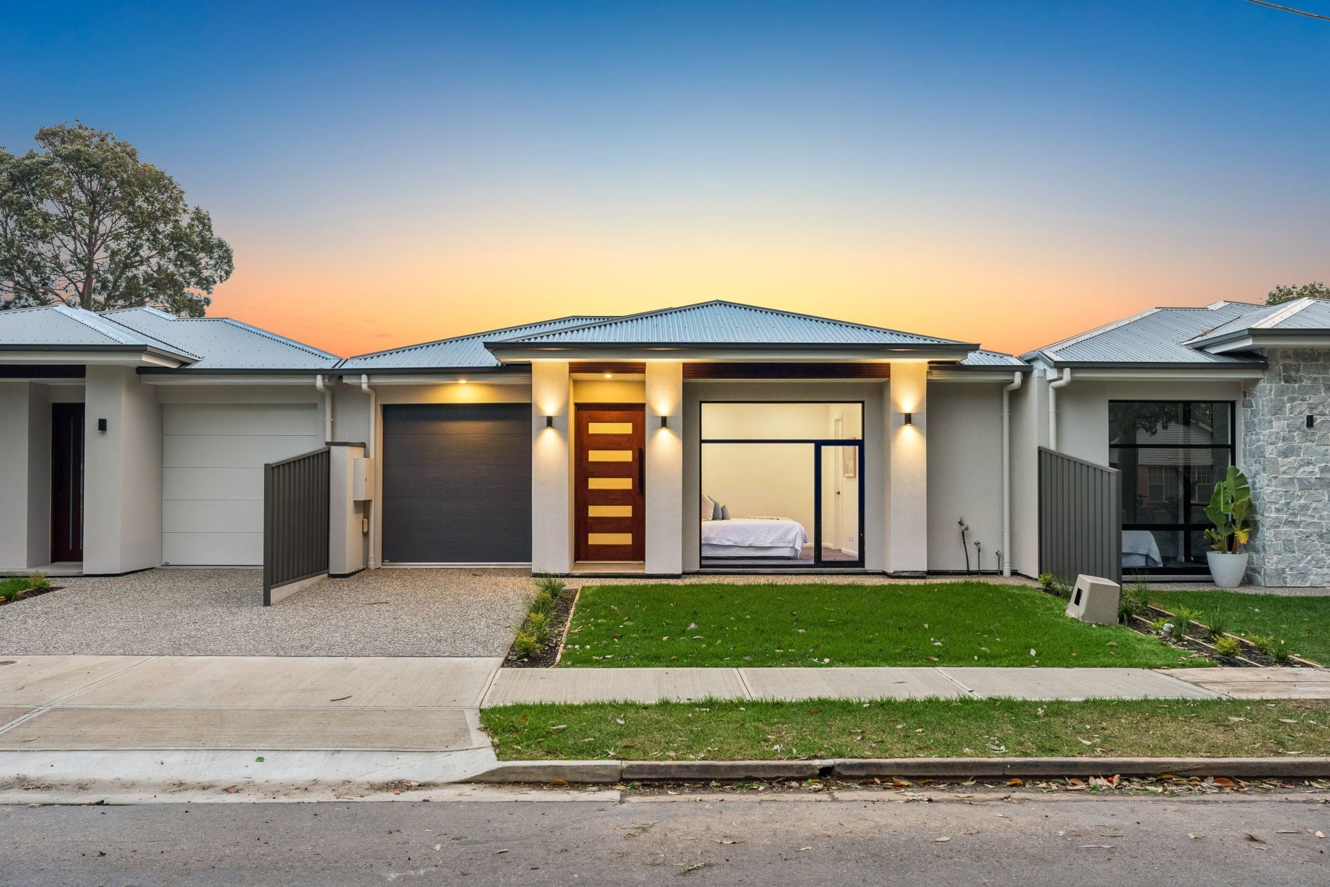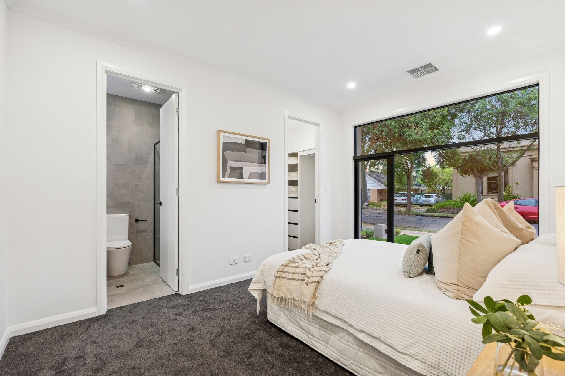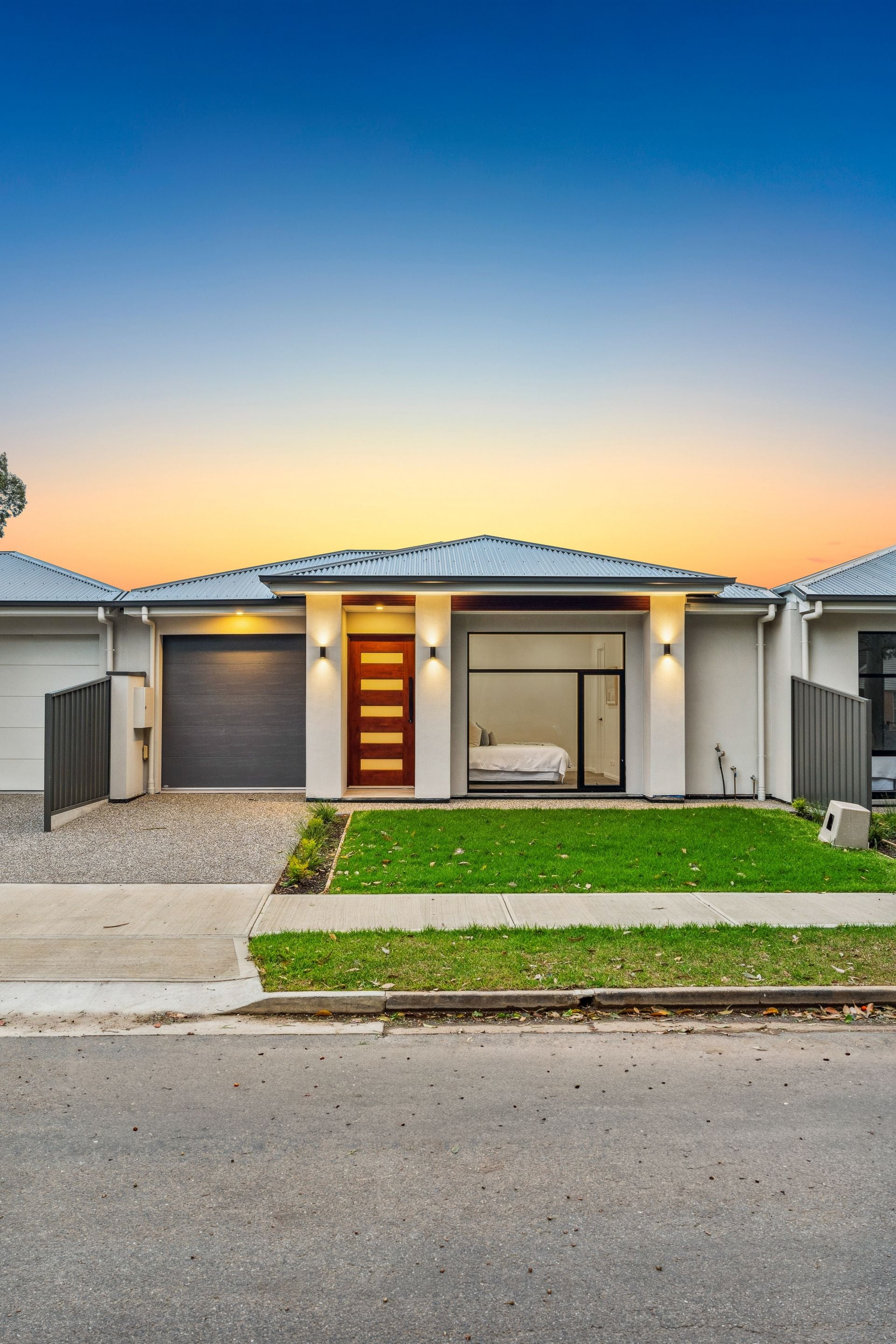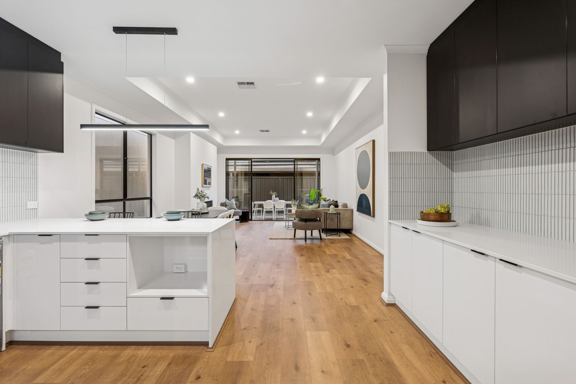 As you enter through the porch and into the hallway, you're greeted by fresh neutral tones, high ceilings, and an array of downlights that set the tone for the refined ambiance throughout the home.