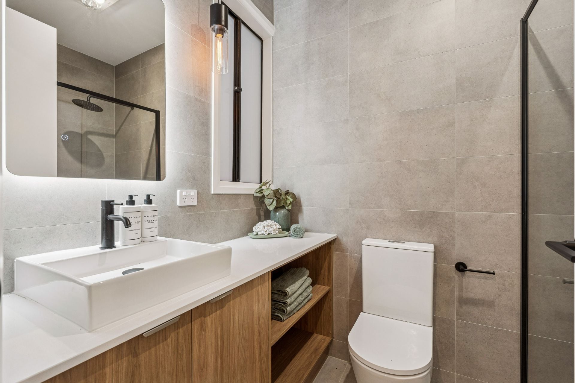 The open plan living, kitchen, and dining area is flooded with natural light, with features being the lighting above the breakfast bar adding a touch of drama to the space and the amazing fireplace in the lounge. The kitchen is a chef's dream, boasting high-quality appliances, a stylish tiled splash back, stone benchtops, and abundant storage. A conveniently located powder room provides added functionality, perfect when entertaining guests.