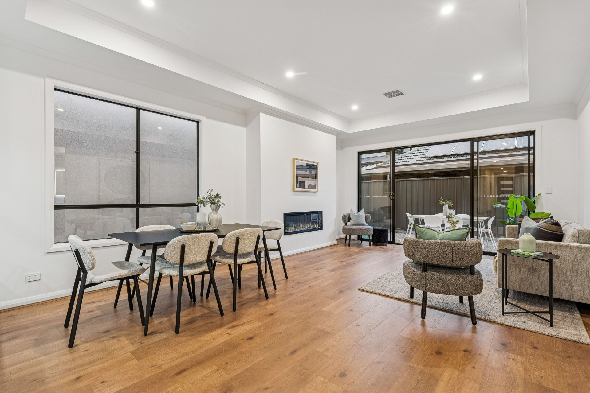 • Open-plan living, kitchen, and dining area filled with natural light