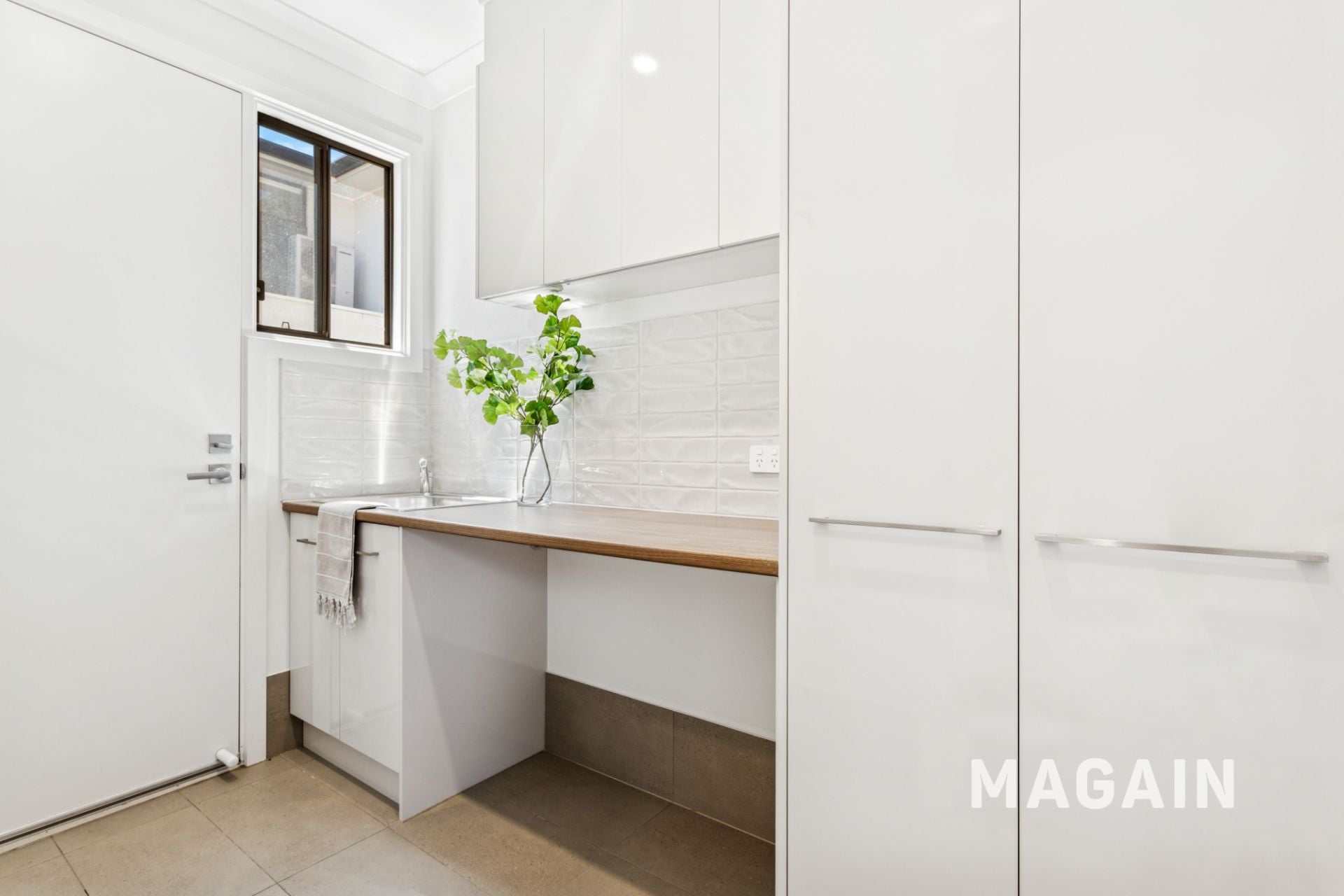 The main bathroom is fully tiled with a full bath and twin basins while there is an additional downstairs powder room and a separate laundry with built-ins and direct outside access.