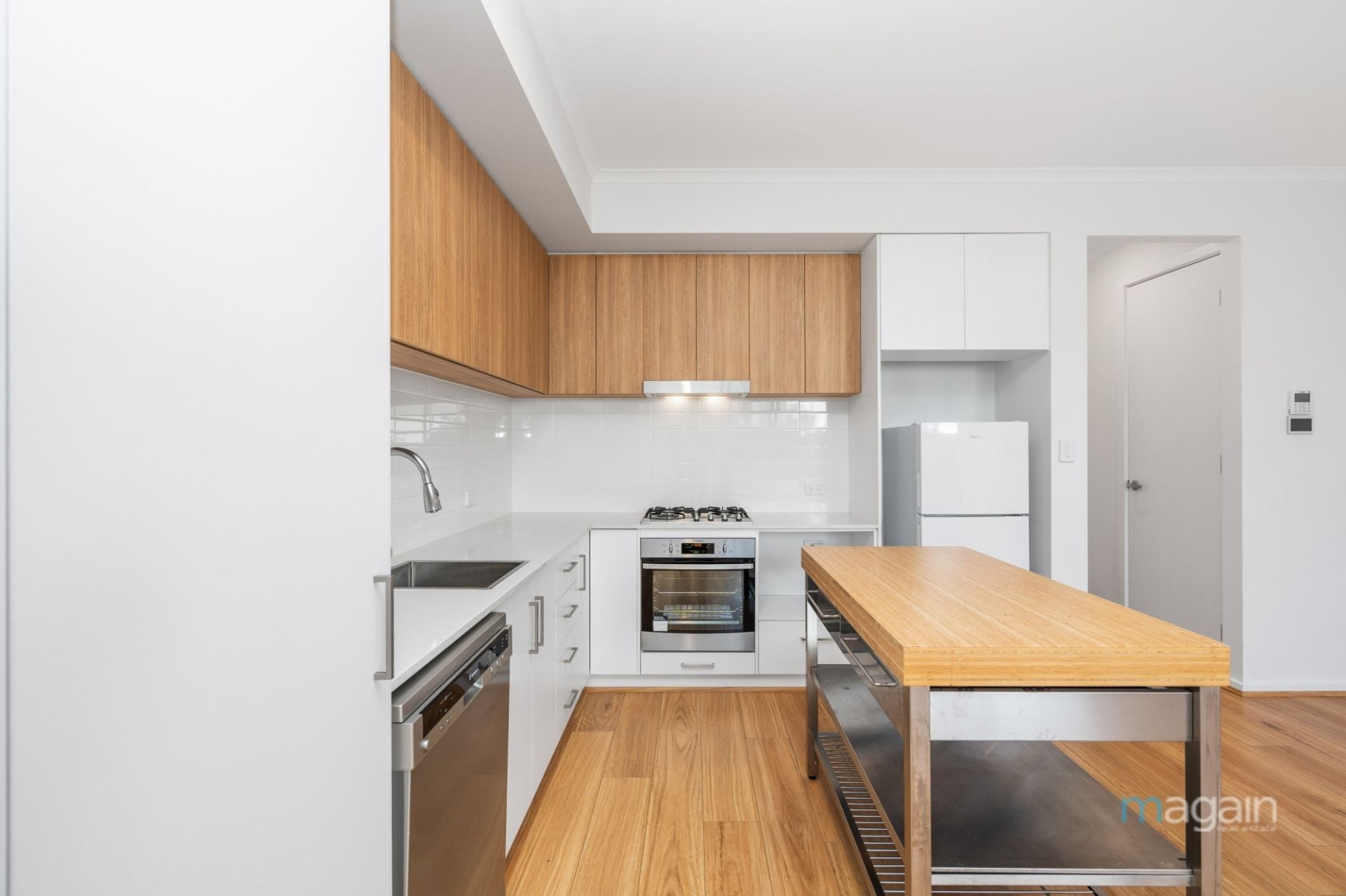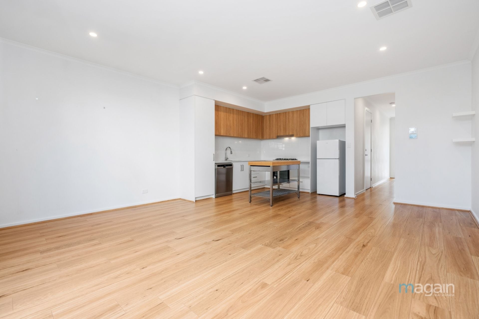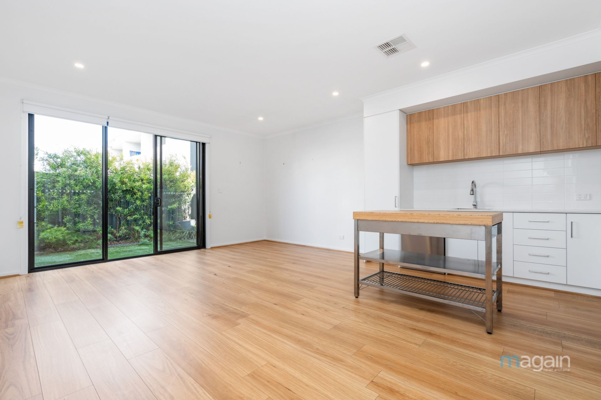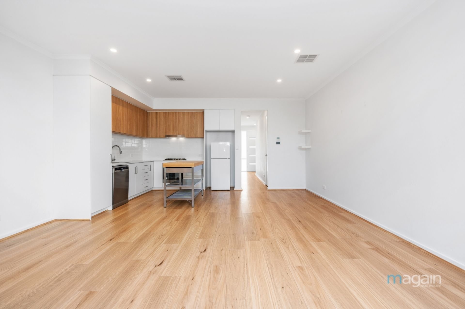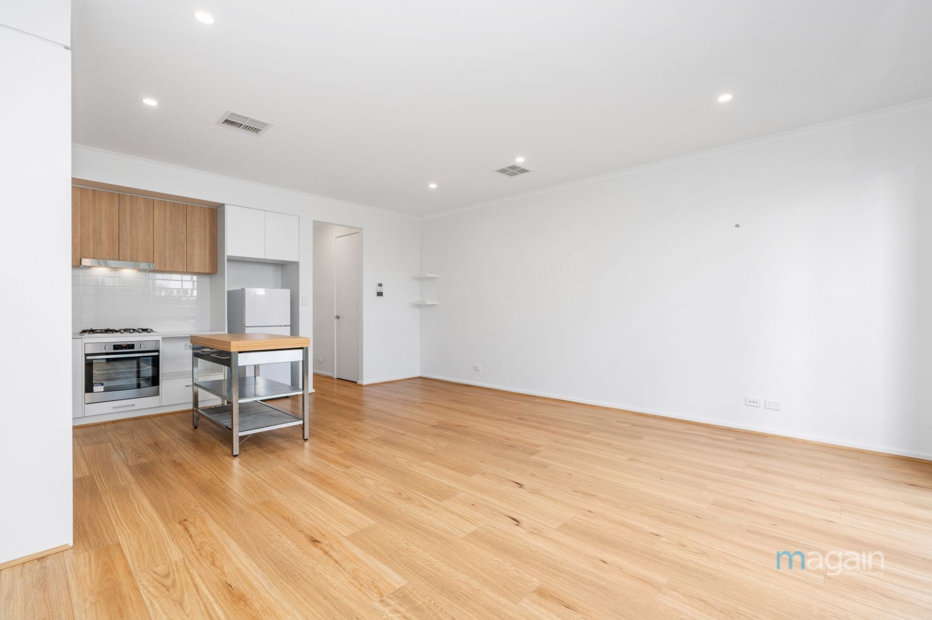 > open plan living, dining and kitchen with floating benchtop and fridge