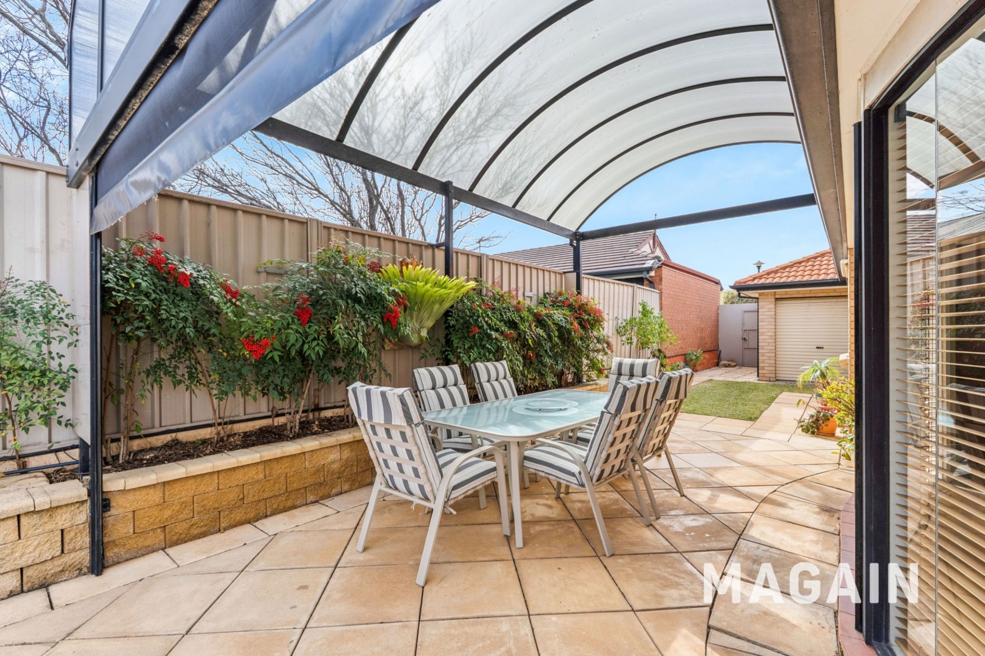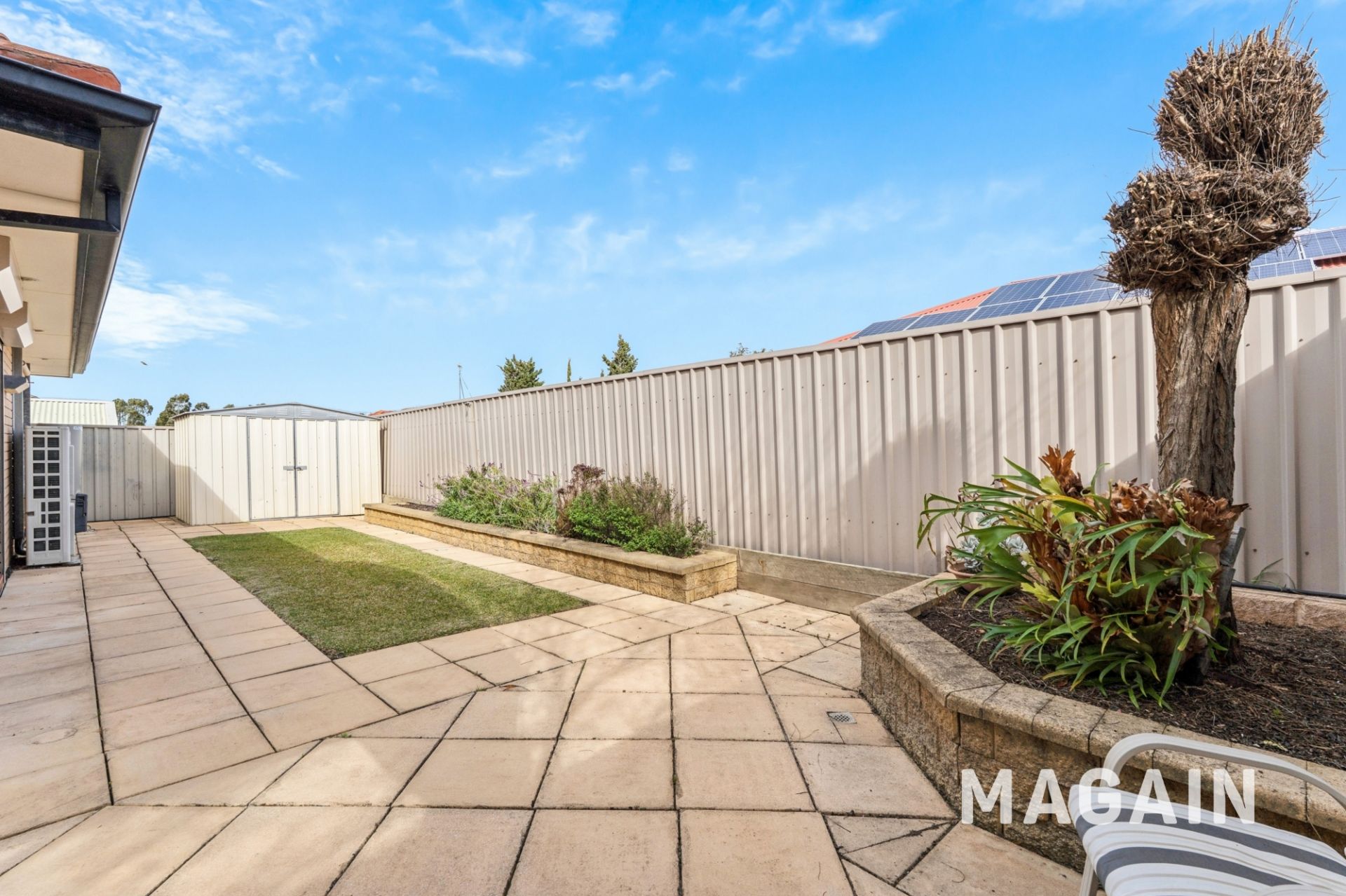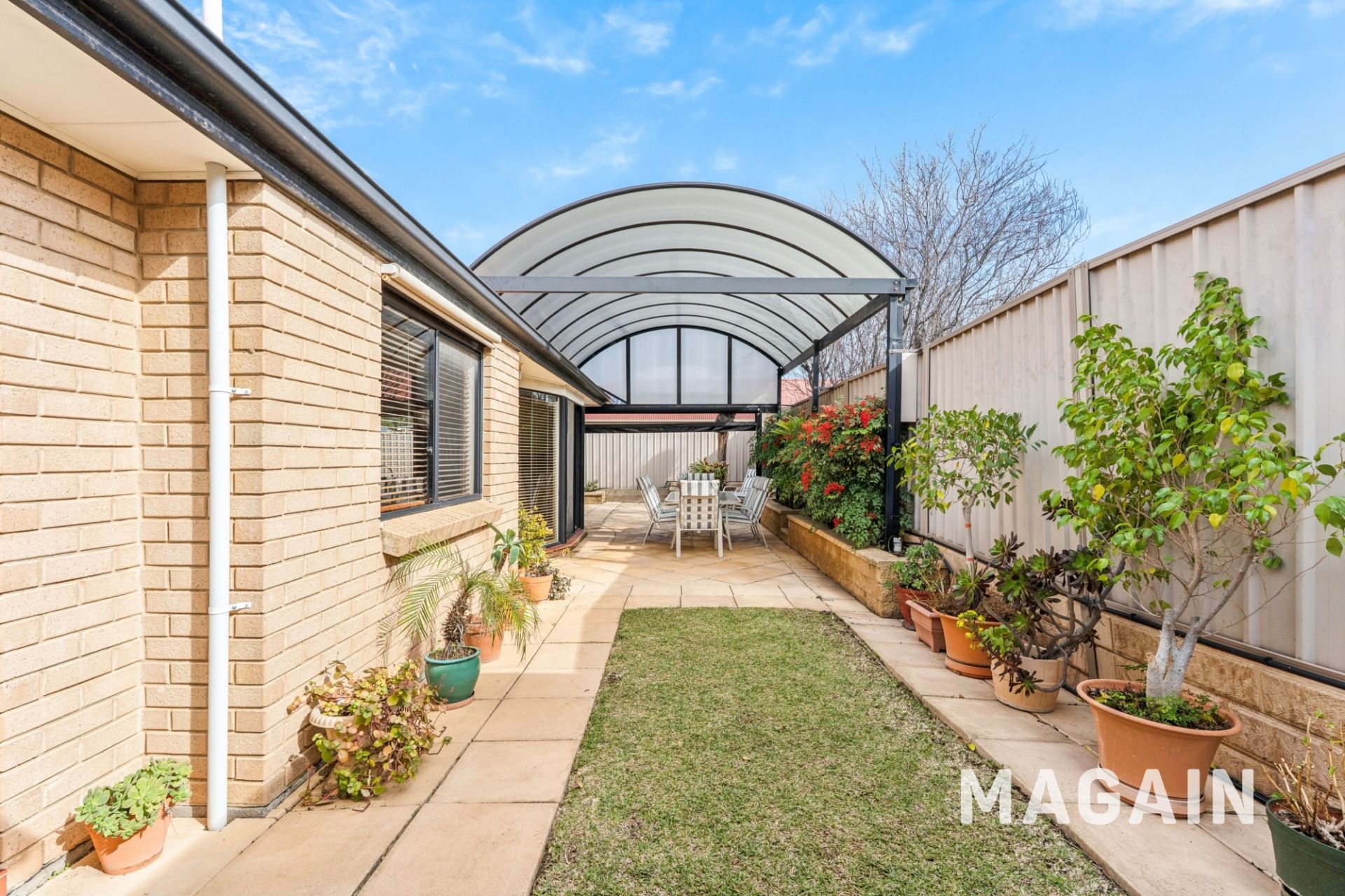 Step outside to the outdoor entertaining area - a paved patio with roller blinds and a striking arched ceiling. The backyard is low maintenance yet inviting, with two neat lawn areas and a handy tool shed.