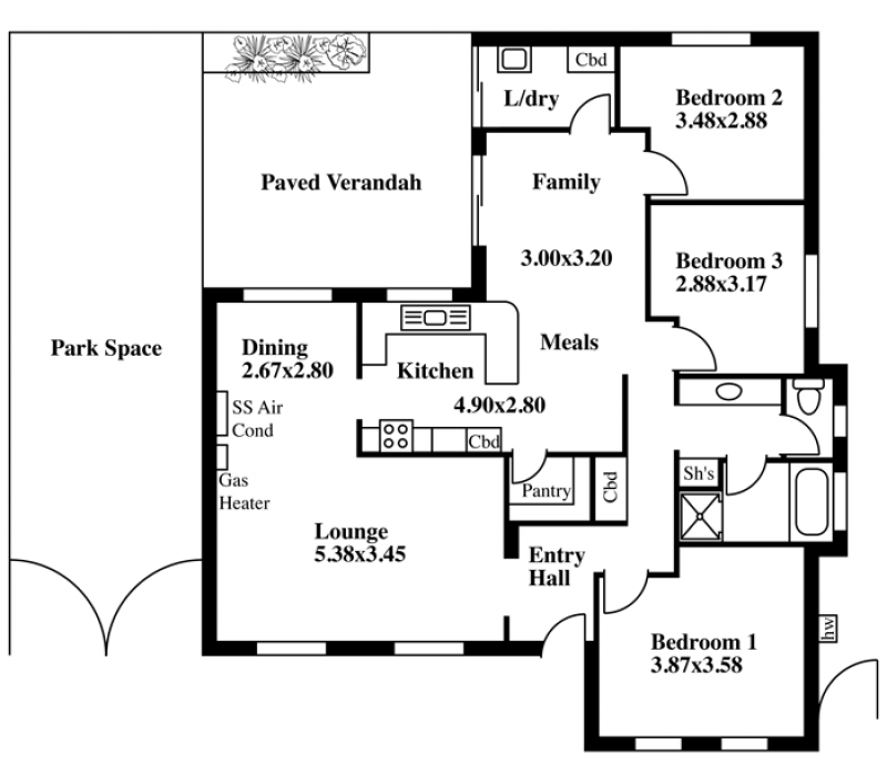 There are three bedrooms, heating and cooling, three way bathroom and kitchen with generous pantry overlooking the family/meals area.