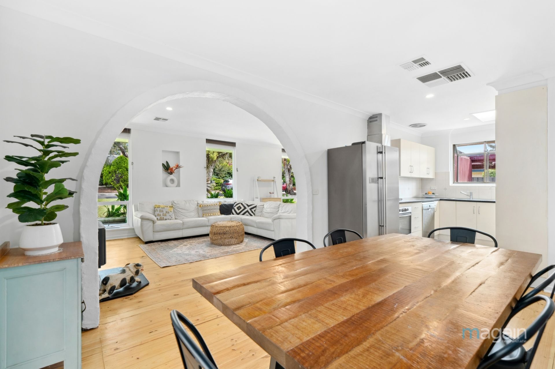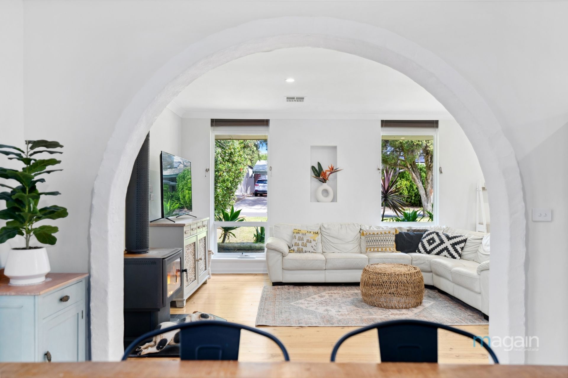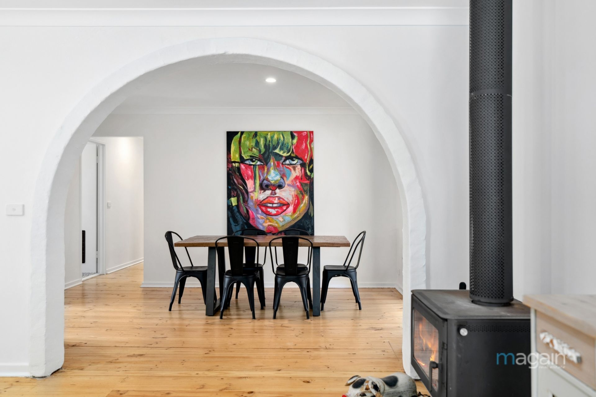 Enter via the undercover porch straight into the cozy lounge room, where a woodfire heater and perfectly placed windows overlook the neat front garden. A funky archway leads to the formal dining room, which sits adjacent to the well-equipped kitchen. Complete with a skylight, gas cooktop, dishwasher, and ample cupboard space, including a pantry, this kitchen is perfect for family living.