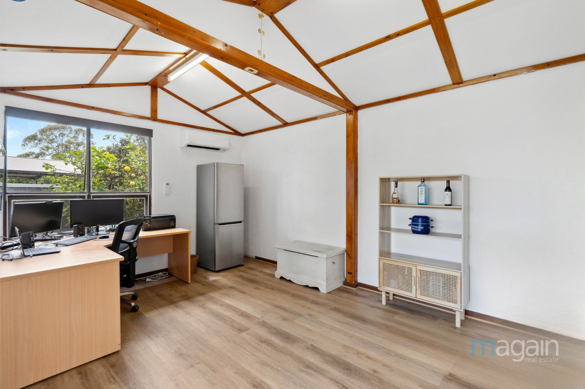 A standout feature is the detached rumpus room, fully powered with split system heating and cooling, offering a versatile space for a home office, kids' playroom, or retreat. The backyard is a family-friendly haven, with a large lawn area, established trees, including a fruitful lemon tree, and plenty of room for children and pets to play.